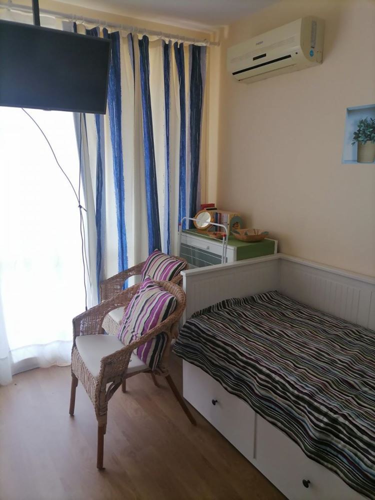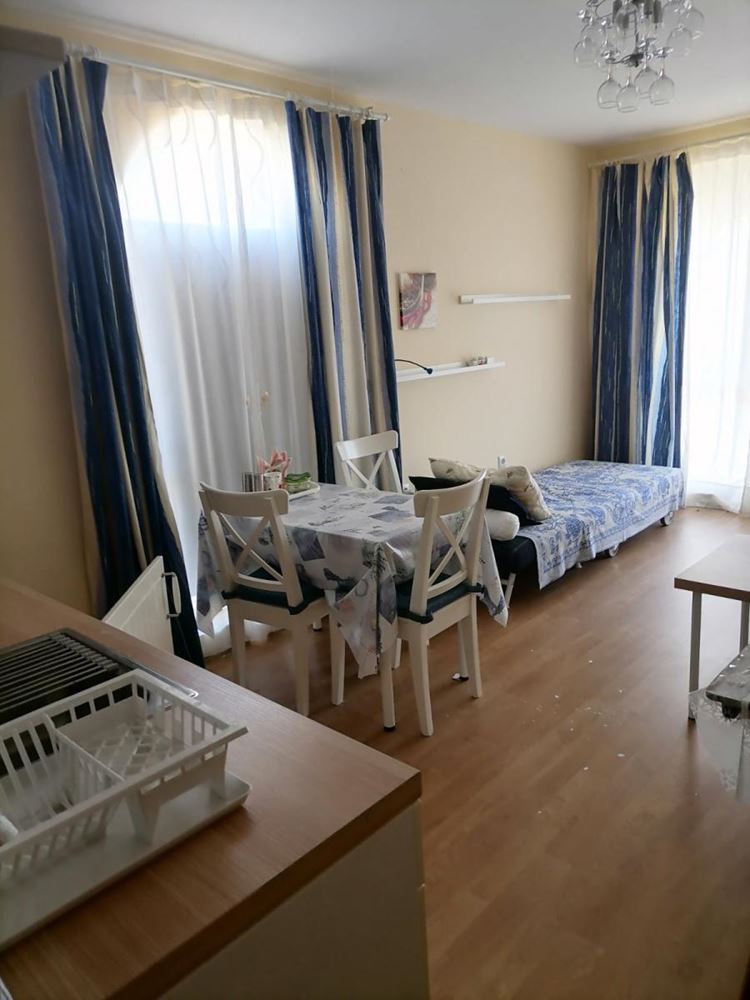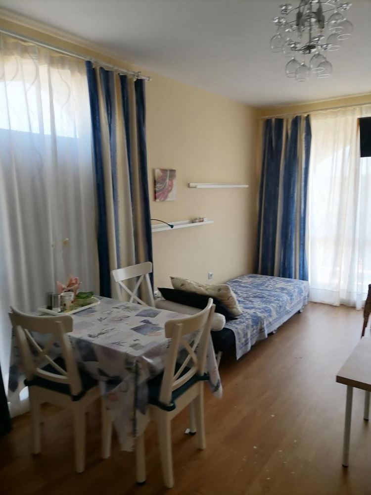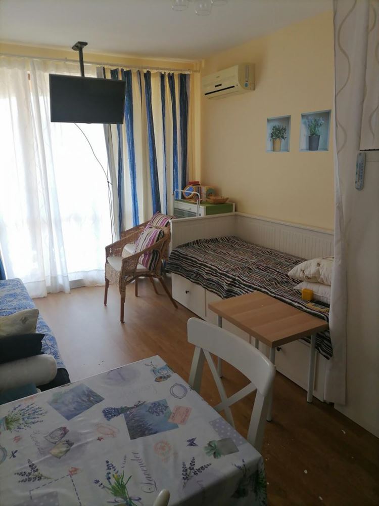 A studio flat in the charming resort of Elenite. The resort is located in a mountain gorge, covered in pine forests and transitioning to a kilometre-long sandy beach - all of which creates a unique climate, a unique combination of sea and mountain air currents. This is the southern coast, protected from cold winds and currents by the Balkan mountain range. Complex is on the second line of the beach, just 200 m away from the magnificent sandy beach, it takes five minutes walk along a pathway with blossoming roses. The flat of 37 m2 consists of living room with kitchen area and relaxation area, bathroom, hallway and balcony. It is equipped with everything you need.