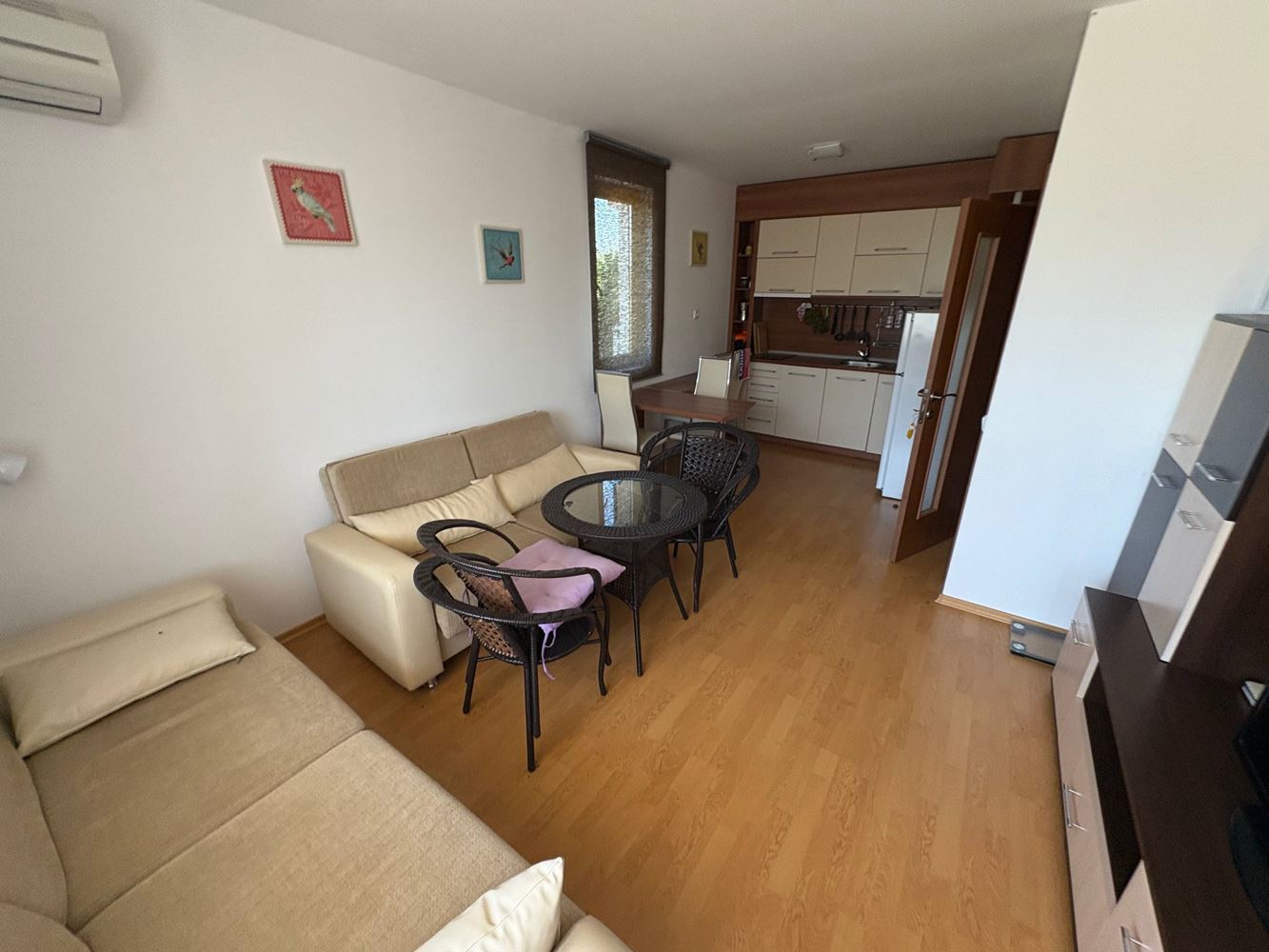 Upon entering, you are welcomed by a spacious entrance hall with functional furniture. From here you have access to both the bedroom and the living room with a kitchen. The living area is bright and airy, with a kitchen corner and dining zone – ideal for family dinners or relaxation with friends. The bedroom is furnished for maximum comfort and tranquility, while the modern bathroom combines style and practicality. The apartment also features a balcony, perfect for enjoying fresh air. The property is sold fully furnished and ready for immediate move-in.