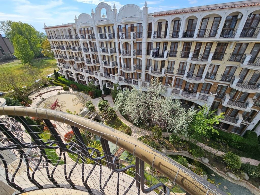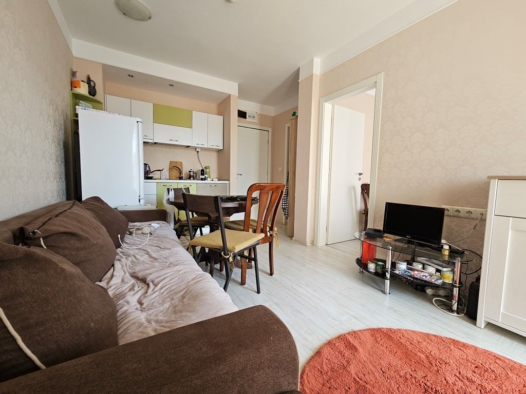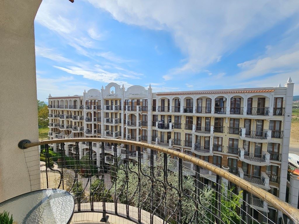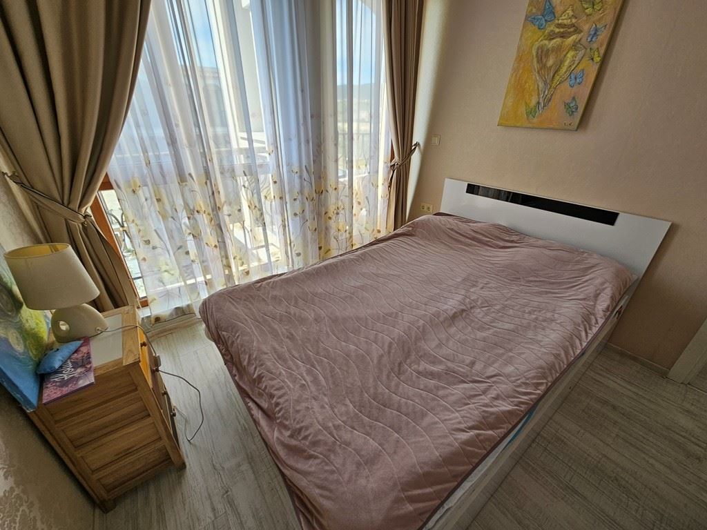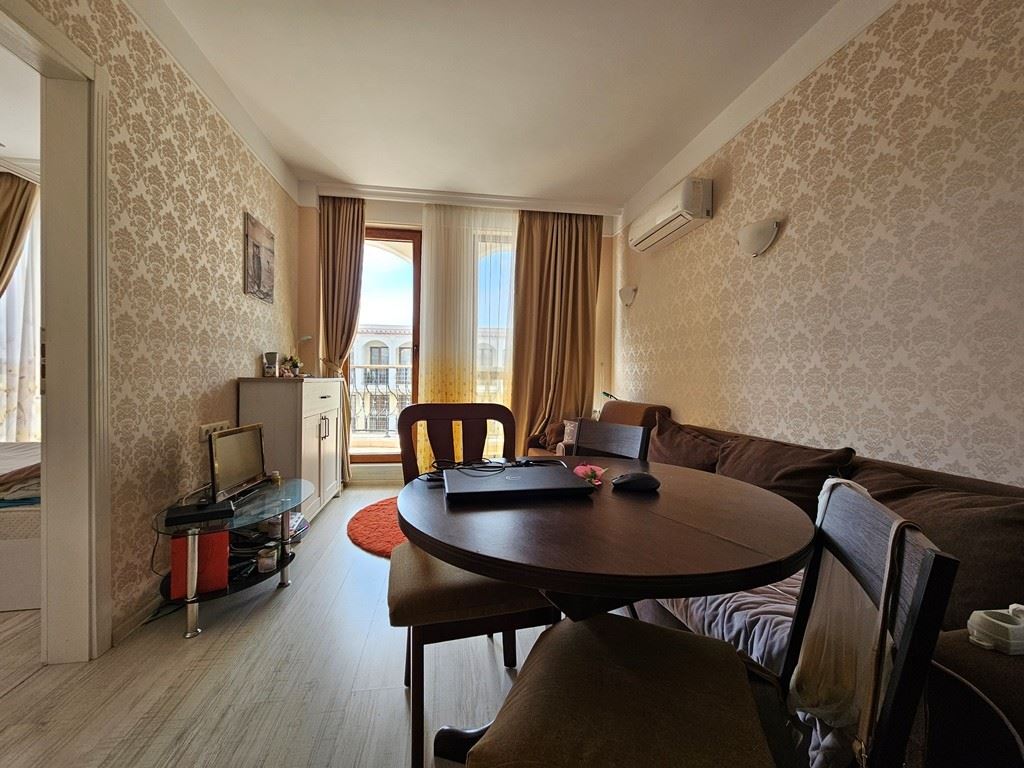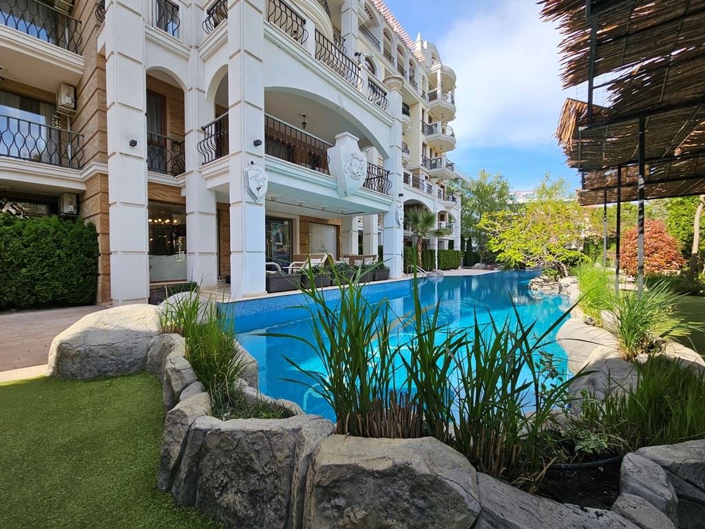 For sale one bedroom apartment in one of the most prestigious complexes in Sunny Beach. This exclusive property extends over an area of 45,50 m2 and is located on the sixth floor, providing stunning views of the elegant pool from its private balcony. The apartment has been designed with a refined aesthetic and is finished to the highest standard, coming fully furnished and equipped, ready for immediate occupation. The spacious living area is modern and creates a cosy atmosphere, combined with the convenience of the en-suite bedroom and functionally organised bathroom.