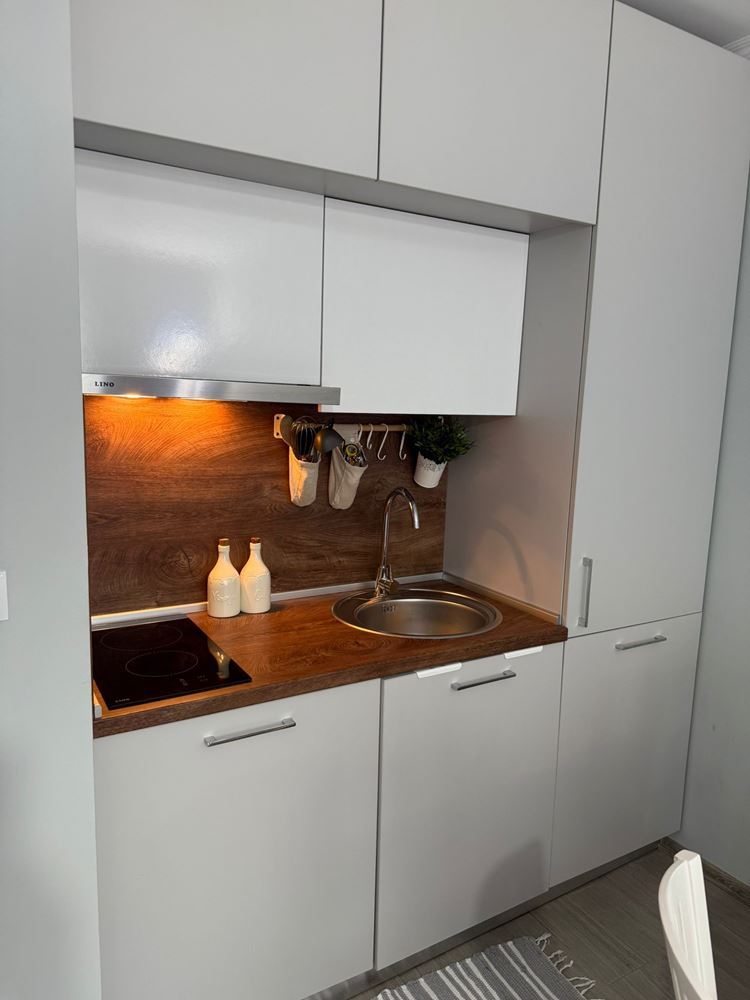 The apartment is situated on the first floor of a modern building with an elevator and features an extremely functional layout. A spacious entrance hall leads to a stylish living room with a kitchenette and dining area, from where you can step out onto the balcony and enjoy the panorama and the nearby park. The bedroom is fully furnished, and the bathroom with toilet adds to the overall convenience of the home.