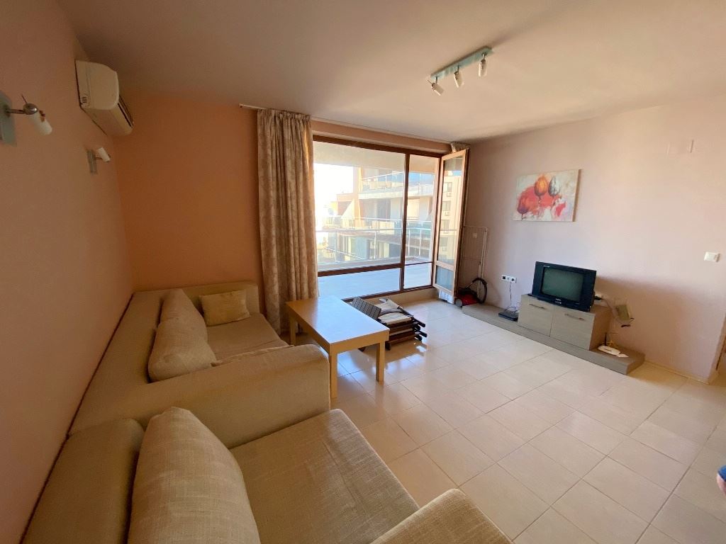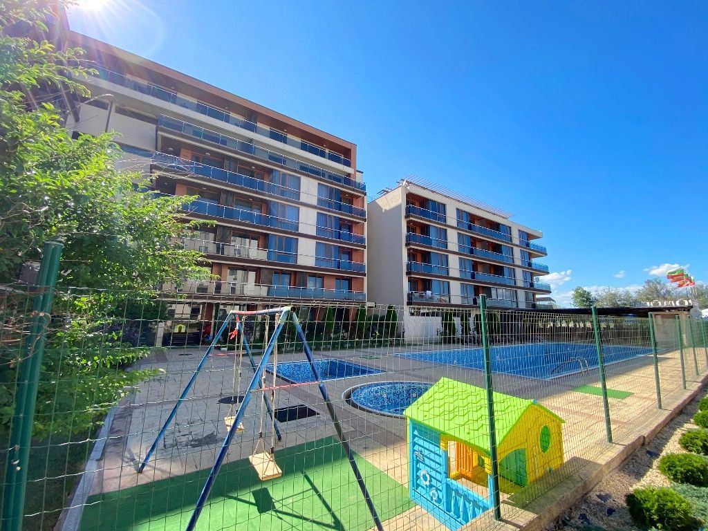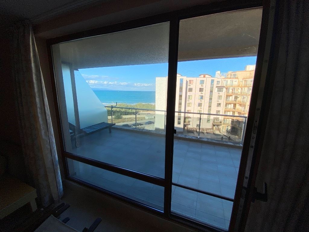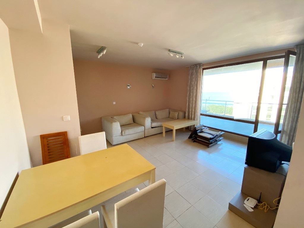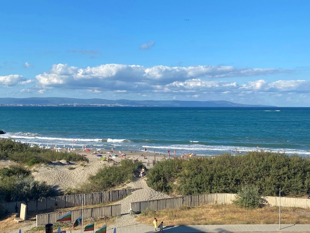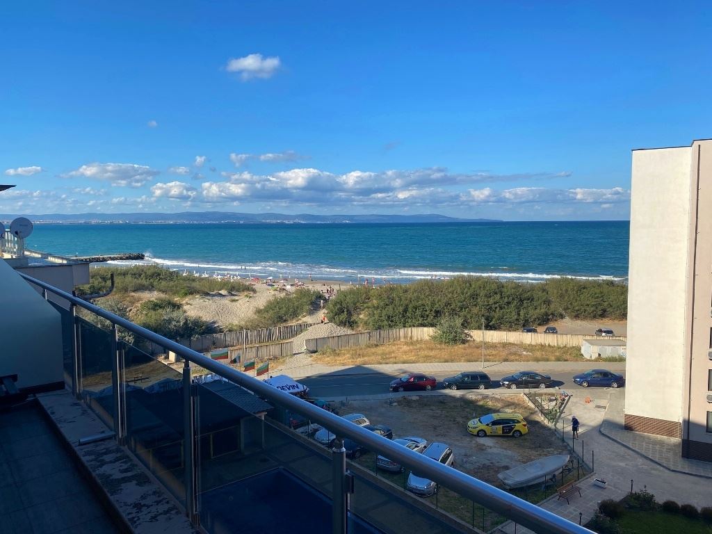 One bedroom first line flat with sea view in Pomorie. The 81.50m2 flat is located on a panoramic sixth floor of a cozy and attractive complex. The apartment consists of entrance hall, living room with kitchen area, bedroom, bathroom with toilet and a big terrace overlooking the sea. The rooms are bright and spacious. The flat is sold fully furnished and equipped. The complex is located in the old prestigious part of Pomorie just 50 meters away from the sea. The complex offers year-round security, swimming pool, relaxation areas, spa centre, jacuzzi, lobby bar, restaurant. In walking distance is located balneosanatorium, shops, bus stop, town centre.