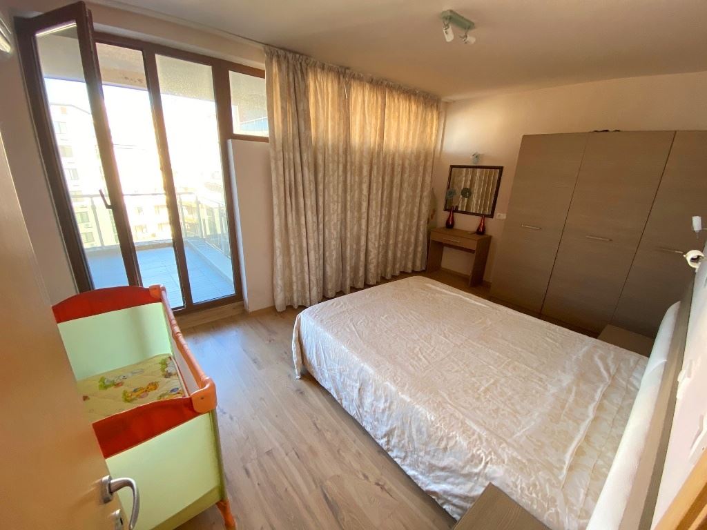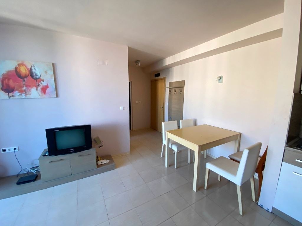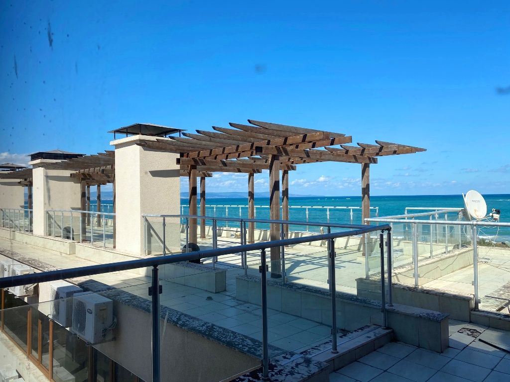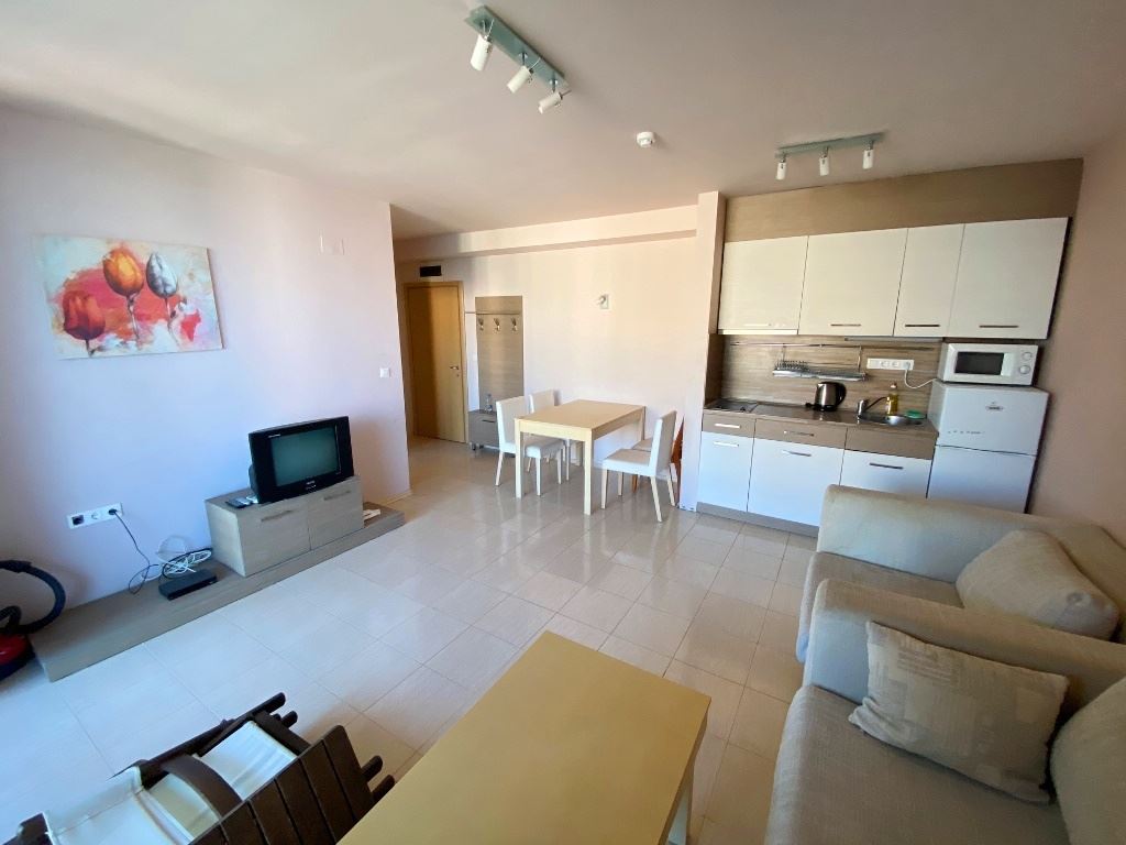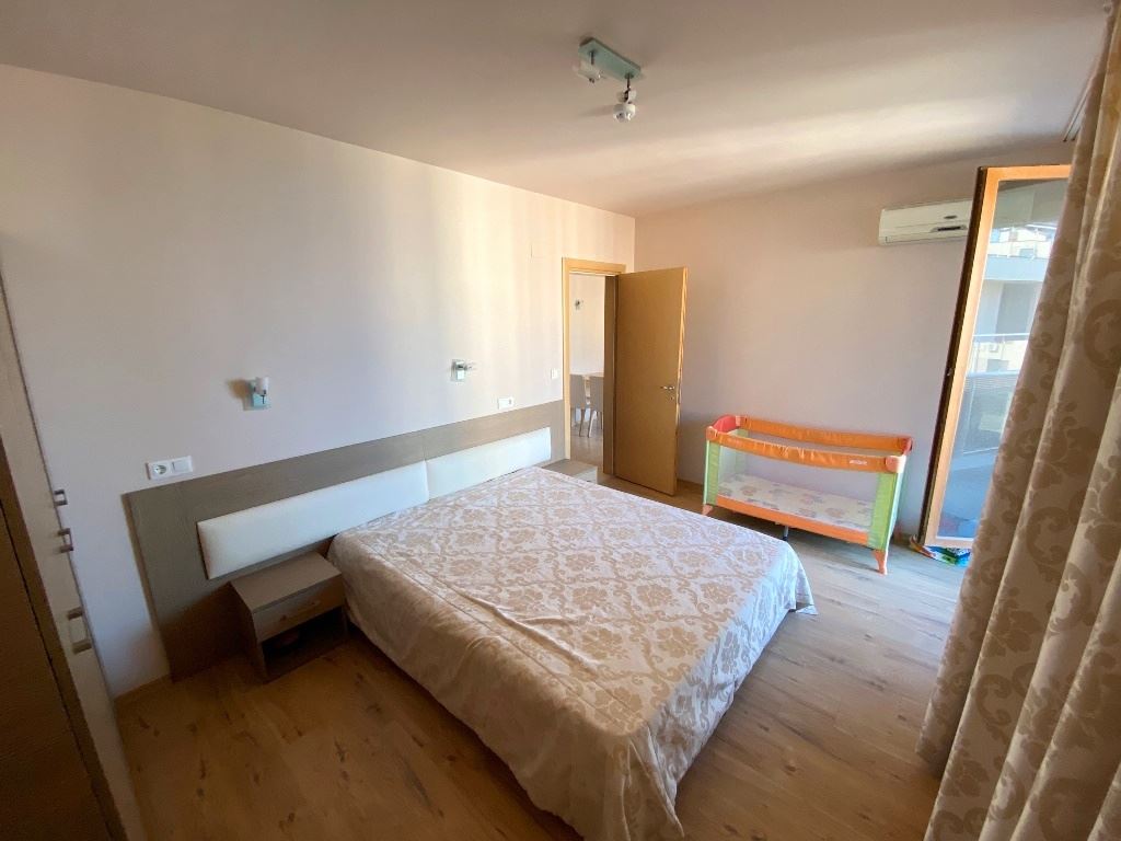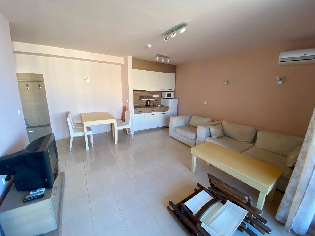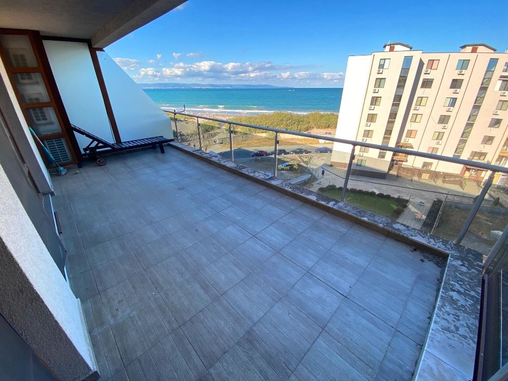 One bedroom first line flat with sea view in Pomorie. The 81.50m2 flat is located on a panoramic sixth floor of a cozy and attractive complex. The apartment consists of entrance hall, living room with kitchen area, bedroom, bathroom with toilet and a big terrace overlooking the sea. The rooms are bright and spacious. The flat is sold fully furnished and equipped. The complex is located in the old prestigious part of Pomorie just 50 meters away from the sea. The complex offers year-round security, swimming pool, relaxation areas, spa centre, jacuzzi, lobby bar, restaurant. In walking distance is located balneosanatorium, shops, bus stop, town centre.