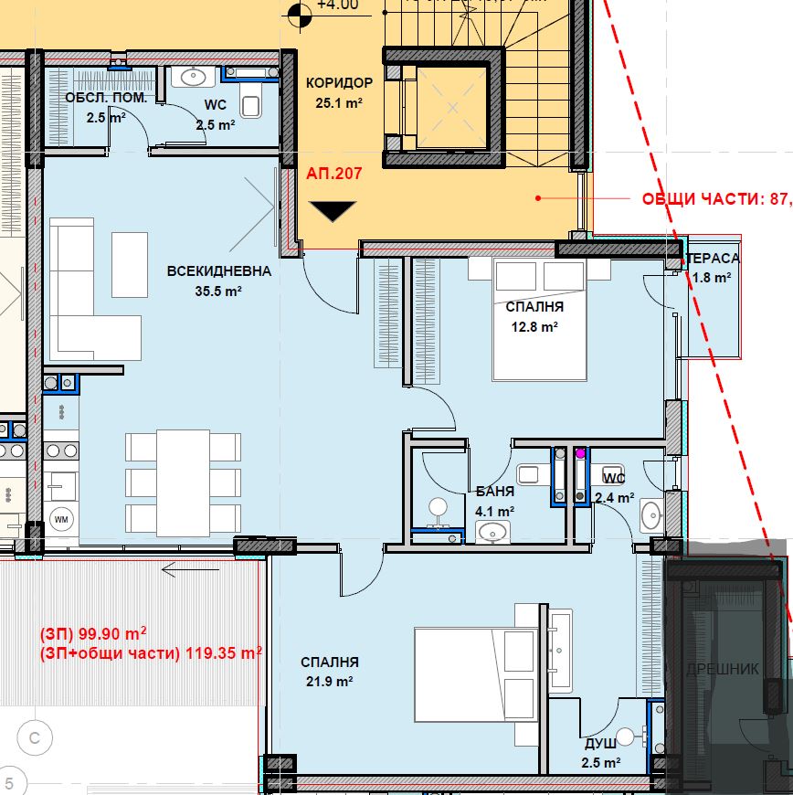 We offer for sale an exclusive two-bedroom apartment with an area of 119,35 sq.m, located on the first residential floor in the prestigious complex in Sveti Vlas. This property offers not only impressive pool views, but also many modern and innovative solutions for comfort and convenience. The apartment consists of three spacious rooms including two cosy bedrooms and three bathrooms, creating the perfect setting for families looking for space and luxury. The particular layout includes a large loggia of 15 sqm, which serves as a covered veranda with an outside kitchen. Sliding aluminum windows allow for a comfortable transition between the living room and the loggia, as well as exterior glazing that provides the feeling of dining al fresco.