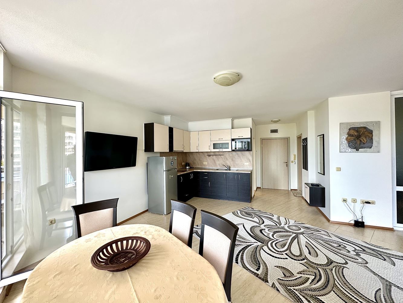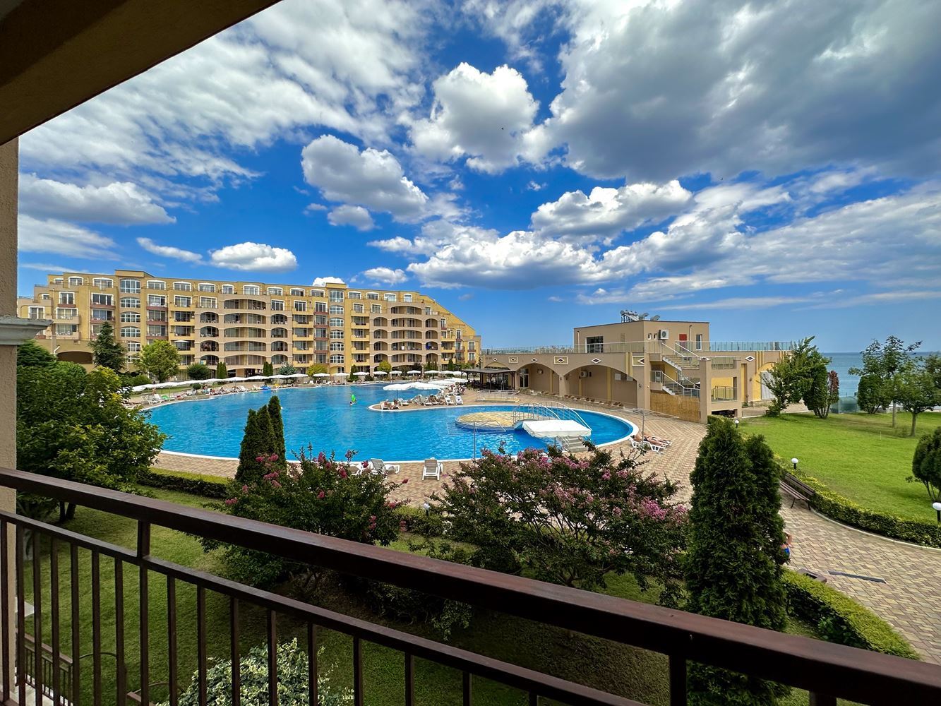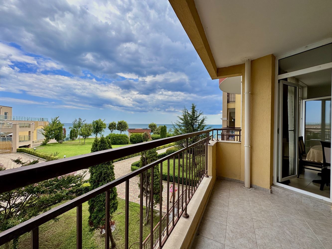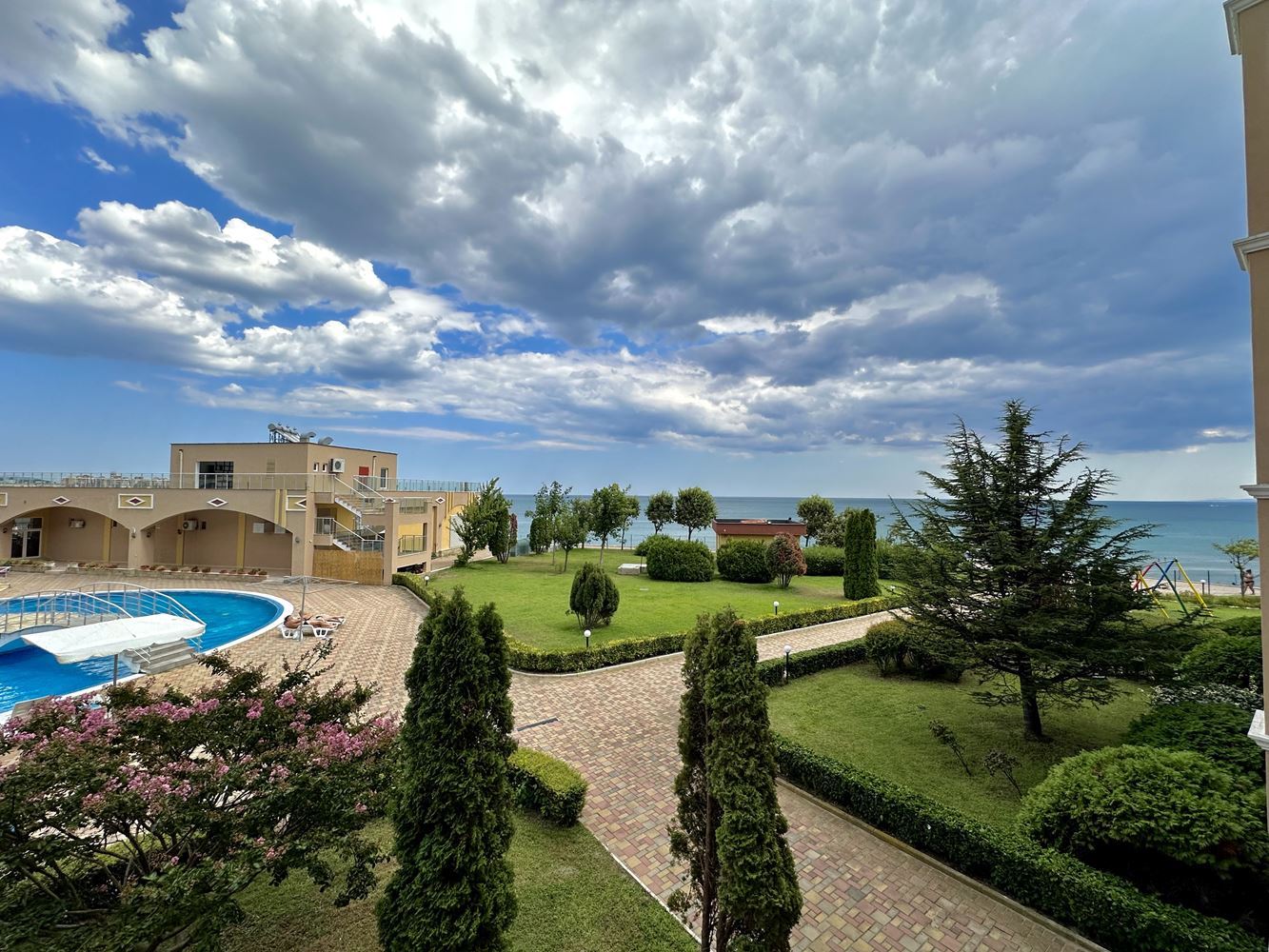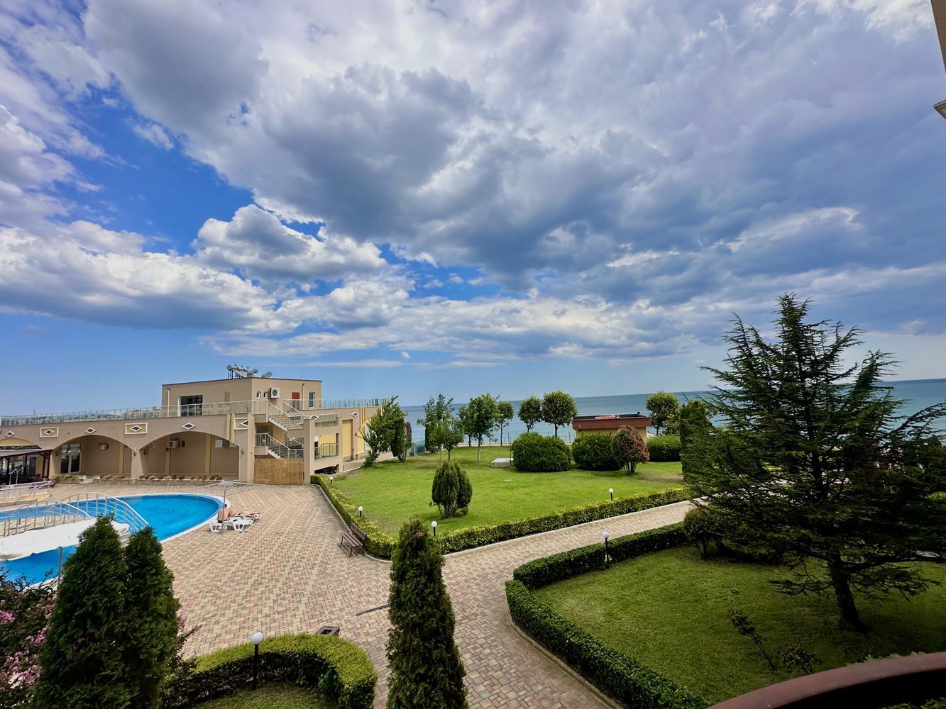 Spacious 94 m2 one bedroom apartment in an incredible beachfront complex in Aheloy. Second floor, there is an elevator. The balcony has a beautiful sea view, well maintained courtyard and swimming pool. The apartment consists of an entrance hall, a large living room with kitchenette, a bedroom, a large bathroom with WC and two balconies. It is offered for sale with quality equipment, furniture and appliances. The complex offers a wide and full comfortable list of services for both adults and children, ranging from animation programs and ending with the rental of conference rooms and cars - there is everything here. Clean and well-maintained beach - right outside the gates of the territory.