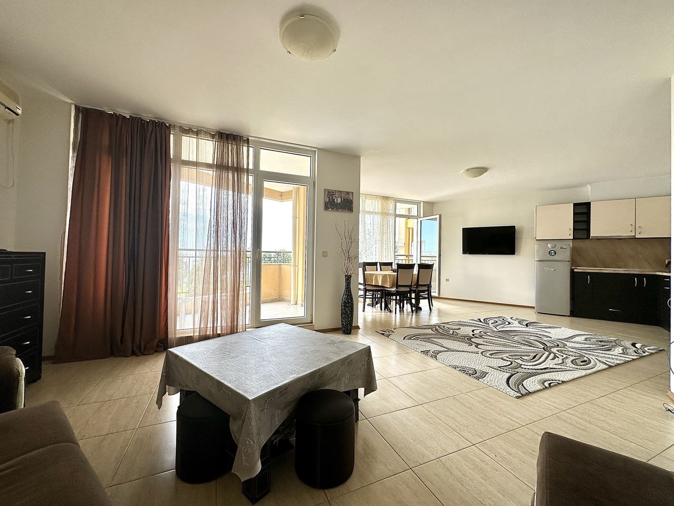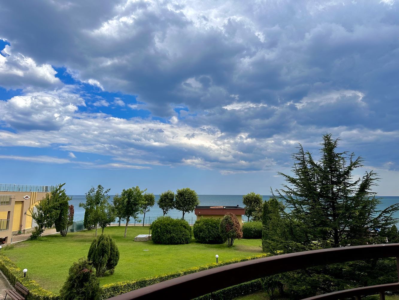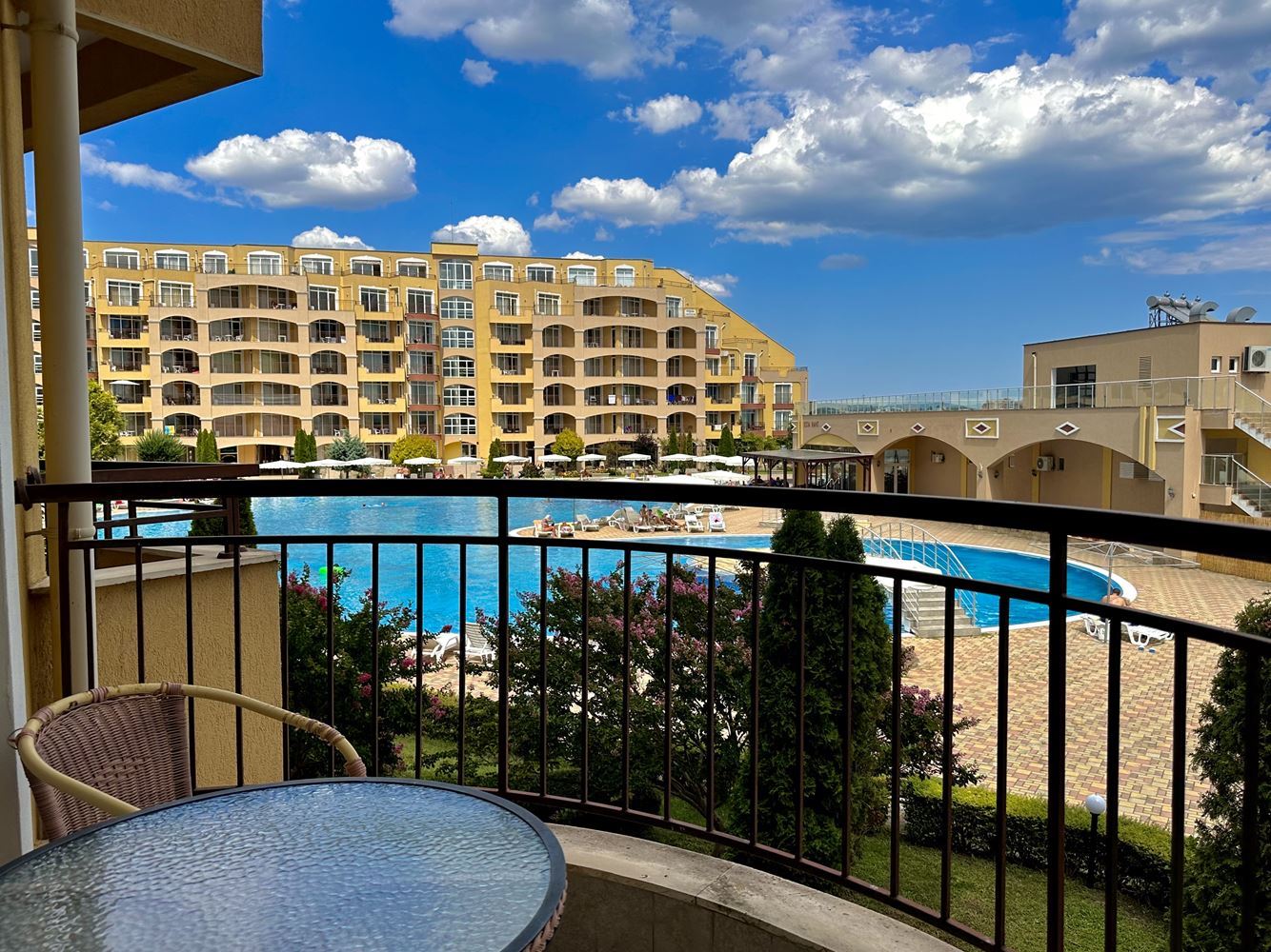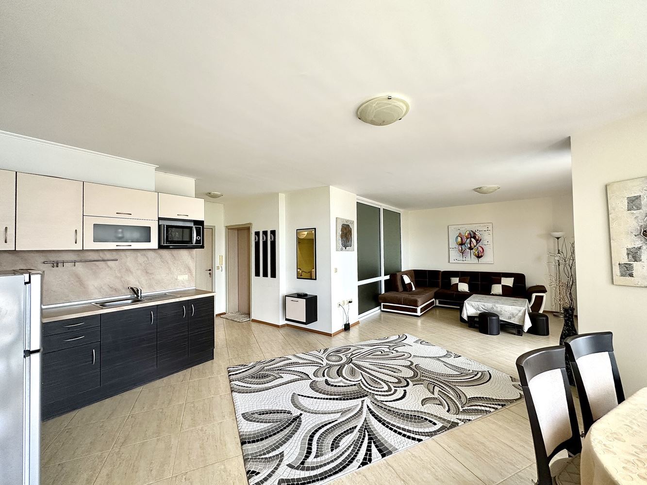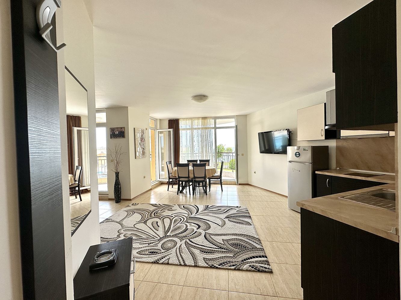 Spacious 94 m2 one bedroom apartment in an incredible beachfront complex in Aheloy. Second floor, there is an elevator. The balcony has a beautiful sea view, well maintained courtyard and swimming pool. The apartment consists of an entrance hall, a large living room with kitchenette, a bedroom, a large bathroom with WC and two balconies. It is offered for sale with quality equipment, furniture and appliances. The complex offers a wide and full comfortable list of services for both adults and children, ranging from animation programs and ending with the rental of conference rooms and cars - there is everything here. Clean and well-maintained beach - right outside the gates of the territory.