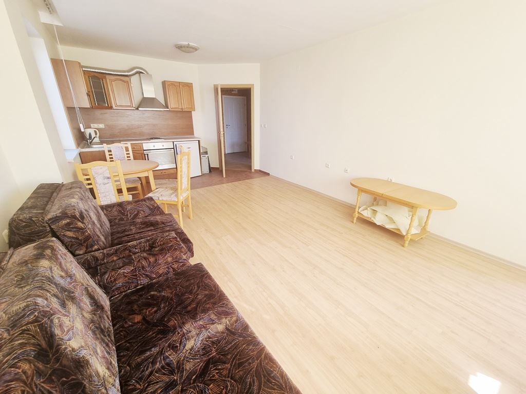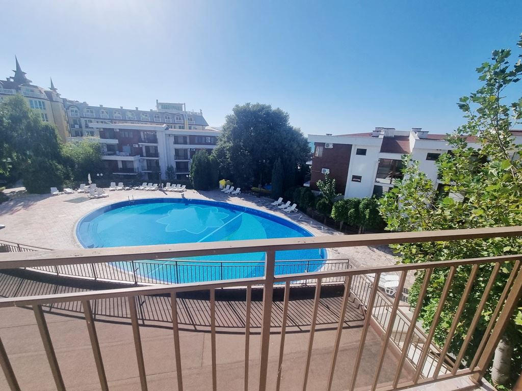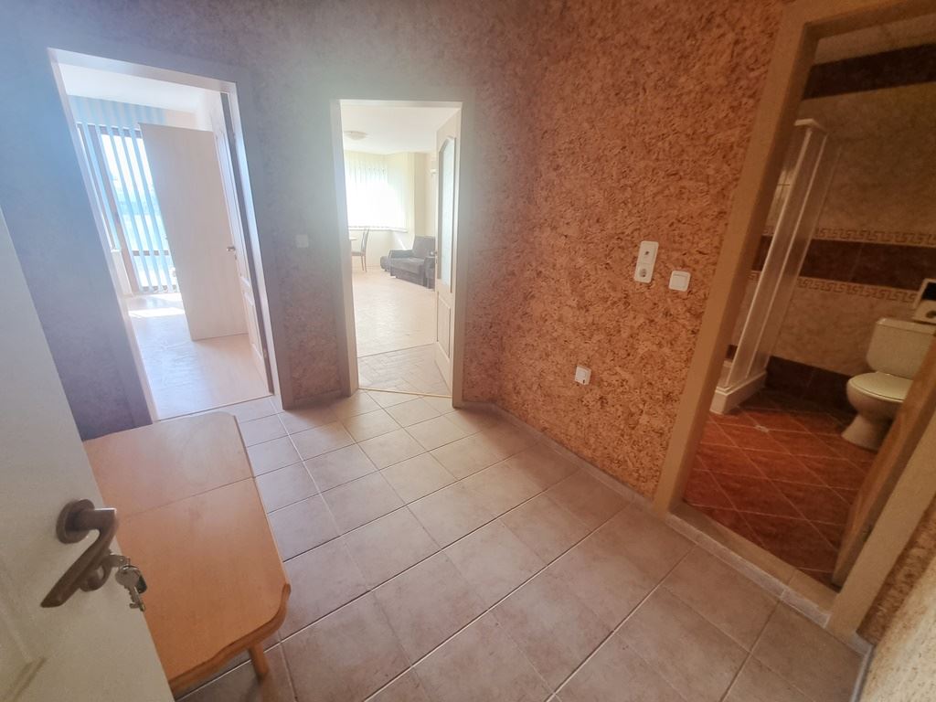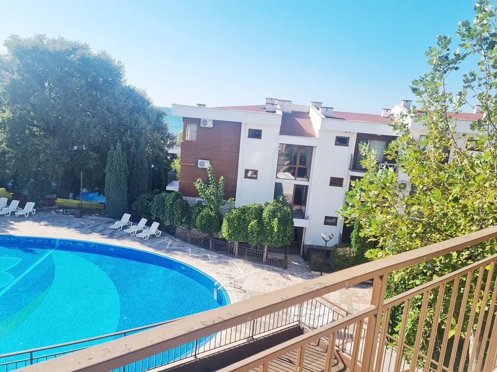 A large two-bedroom apartment is located in a complex on the seaside, right at the foot of the Balkan Mountains. The property has an area of 80 m² on the second floor and consists of a spacious living room with a kitchenette, a large bedroom, a comfortable bathroom with a toilet, and a terrace with a view of the pool and partial sea view. The apartment is fully furnished and equipped with everything needed for a cozy stay and living.