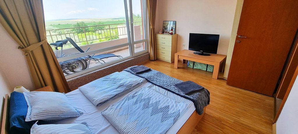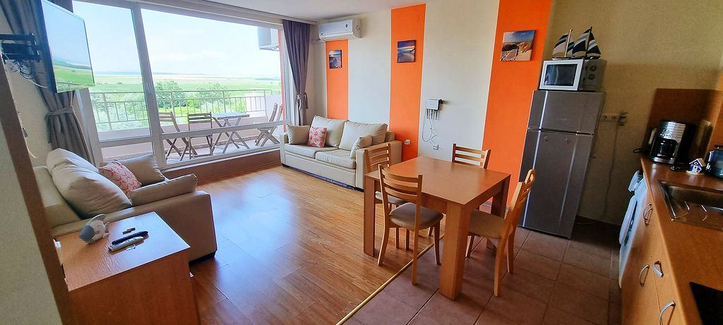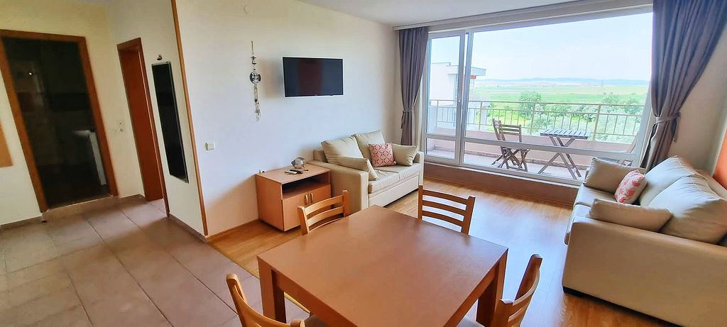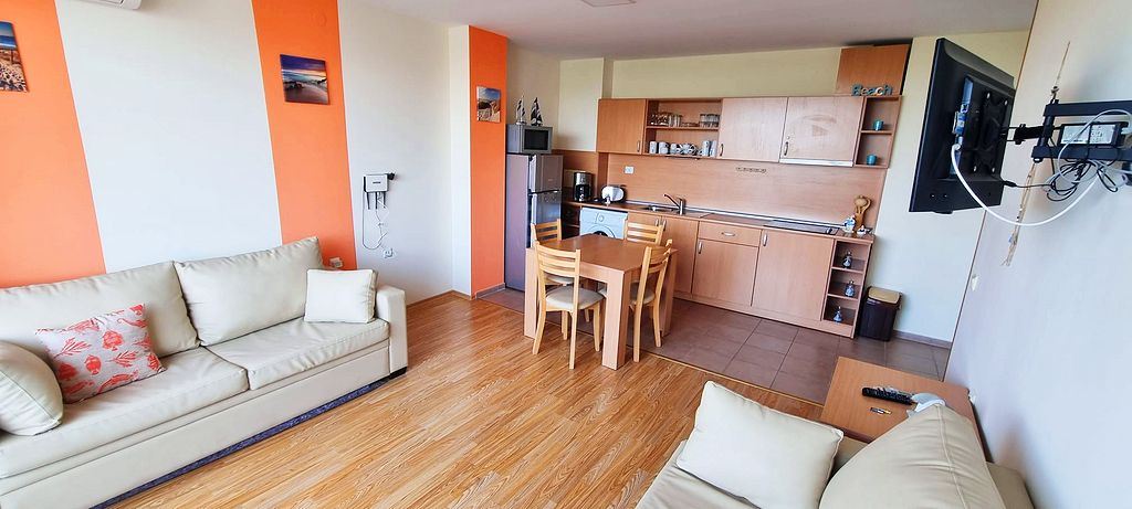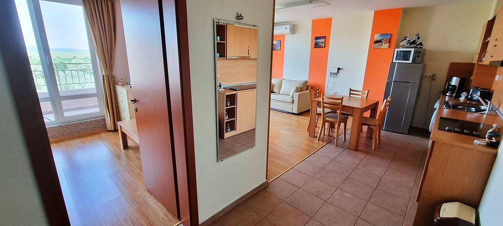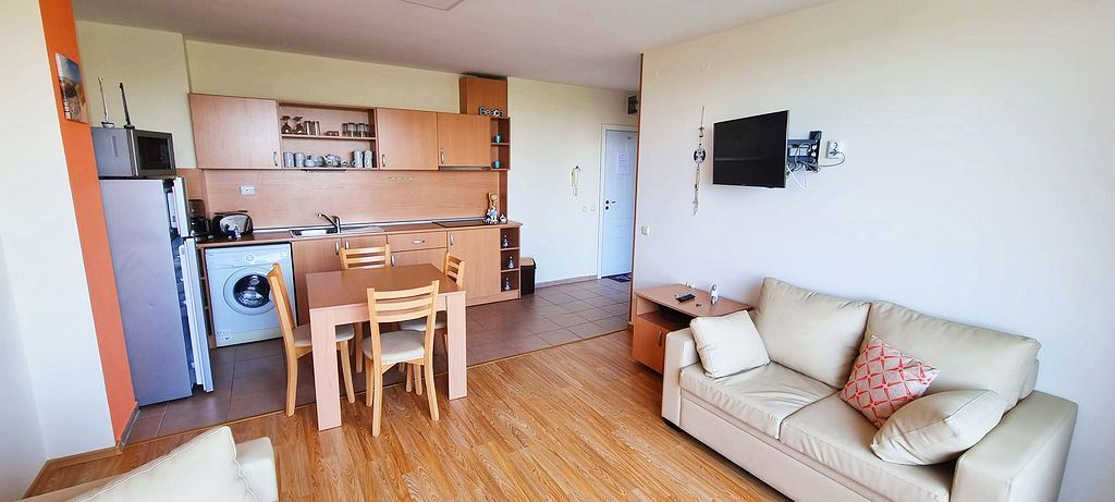 Spacious one-bedroom flat in a complex in the resort town of Sunny Beach. The centre of the resort is only 400m away. The main urban infrastructure is within walking distance. You can have a great time at the Aqua Park, which is located in close proximity to the complex. It takes just a few minutes to reach one of the best beaches in the resort. The complex is well located but also has many facilities such as shops, restaurants and a bar, sauna, swimming pools for children and adults with lifeguard, tennis court, fitness room, dentist and cosmetologist offices. There is a guarded car park and a car rental service for residents. There is constant video surveillance. This flat of 63 m2 is located on the third floor. It has a separate bedroom, living room with kitchen, bathroom with shower, large balcony. All furniture and equipment is included in the price. This flat would be an excellent choice for permanent residence.
