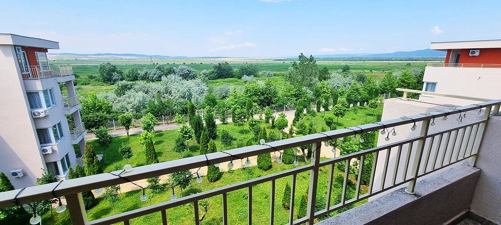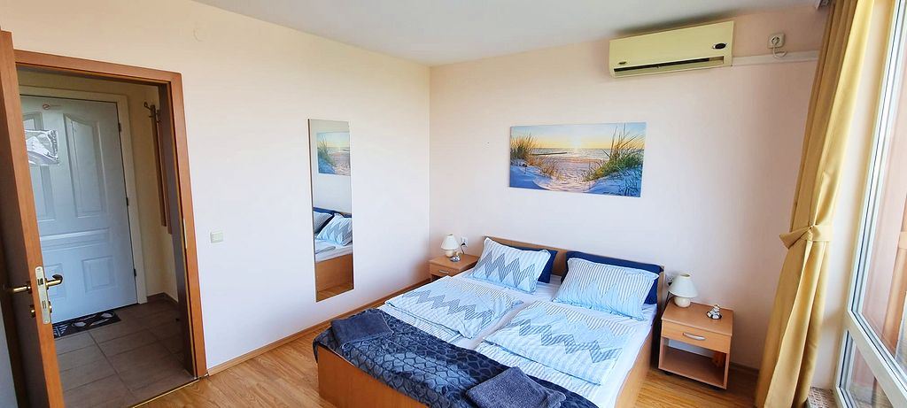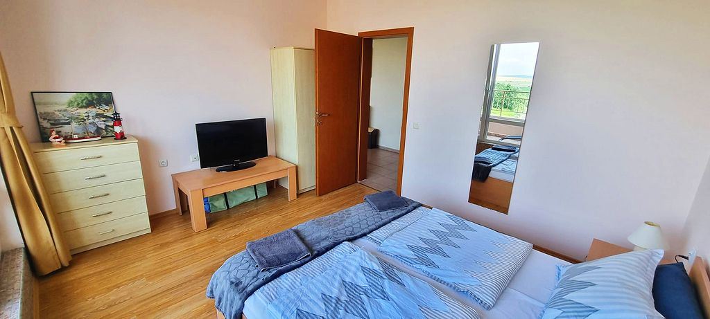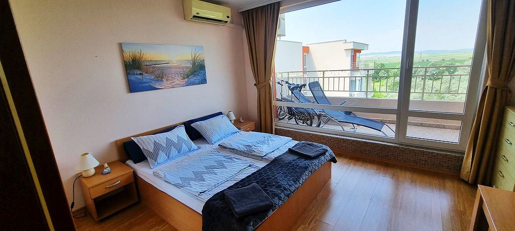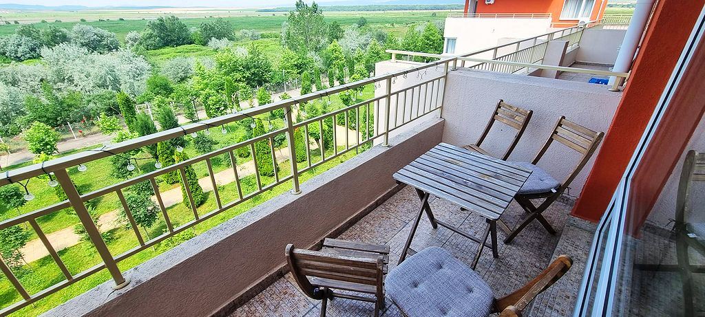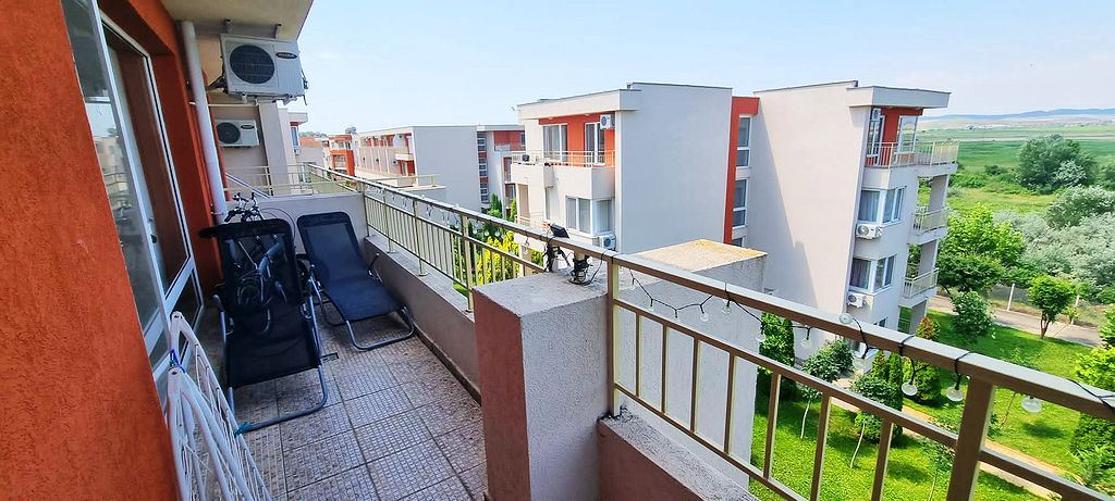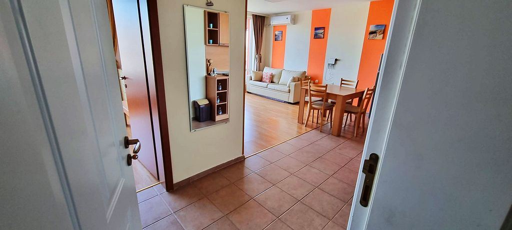 Spacious one-bedroom flat in a complex in the resort town of Sunny Beach. The centre of the resort is only 400m away. The main urban infrastructure is within walking distance. You can have a great time at the Aqua Park, which is located in close proximity to the complex. It takes just a few minutes to reach one of the best beaches in the resort. The complex is well located but also has many facilities such as shops, restaurants and a bar, sauna, swimming pools for children and adults with lifeguard, tennis court, fitness room, dentist and cosmetologist offices. There is a guarded car park and a car rental service for residents. There is constant video surveillance. This flat of 63 m2 is located on the third floor. It has a separate bedroom, living room with kitchen, bathroom with shower, large balcony. All furniture and equipment is included in the price. This flat would be an excellent choice for permanent residence.