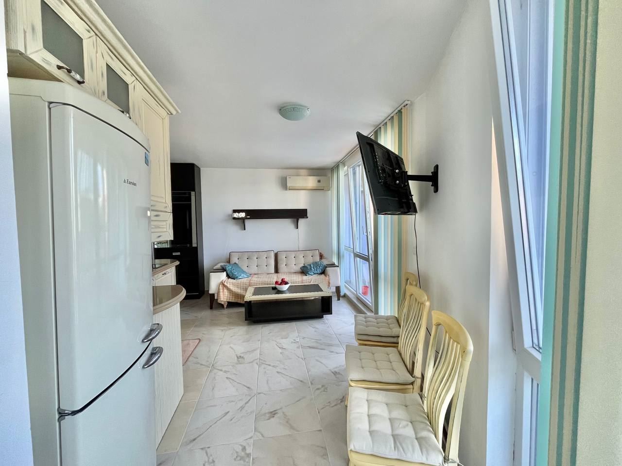 We present an exceptionally attractive one-bedroom apartment, located only 100 meters from the beach, in one of the most beautiful, peaceful, and preferred areas of Ravda. The property combines an excellent location, a panoramic sea view, and a low maintenance fee, making it an ideal choice for both personal use and investment.