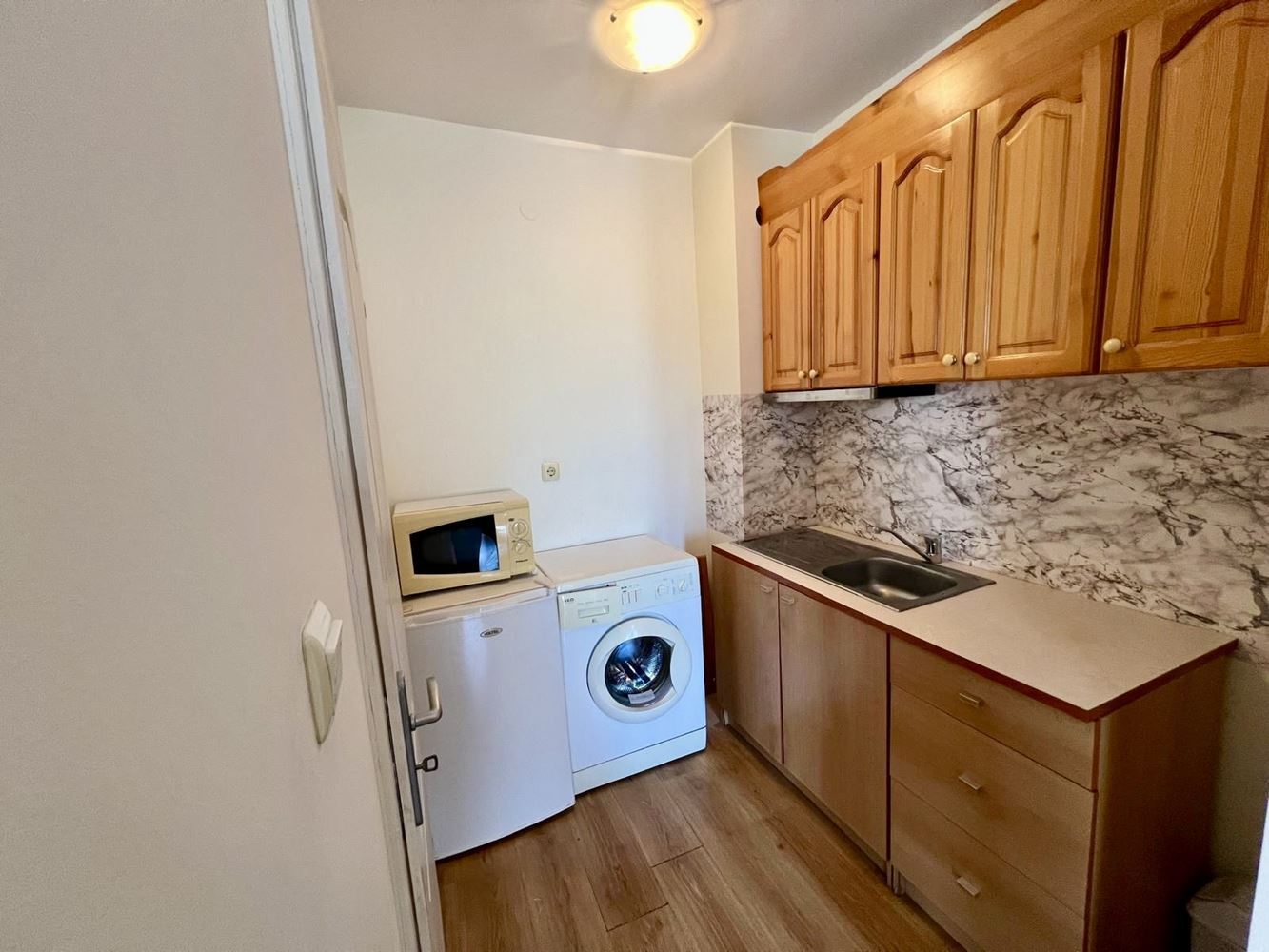 The apartment features a hallway, a cozy living area, a separate kitchen, and a functional bathroom. It is fully furnished and equipped, ready for immediate move-in – no additional investment required.