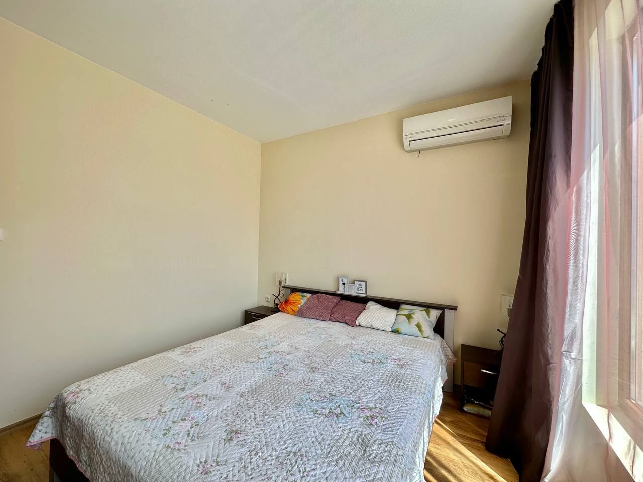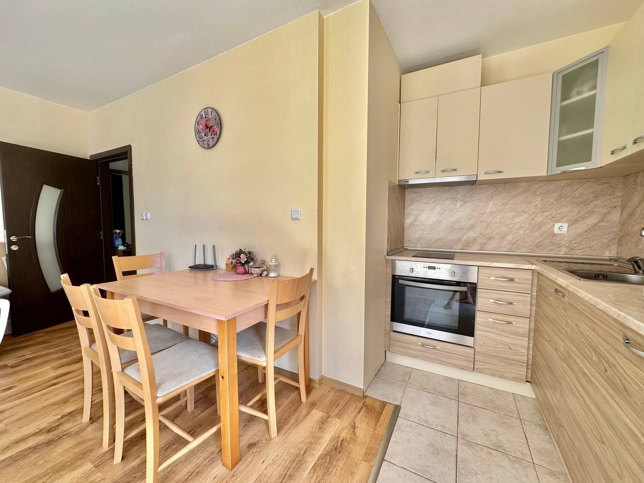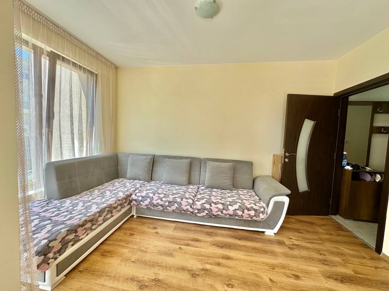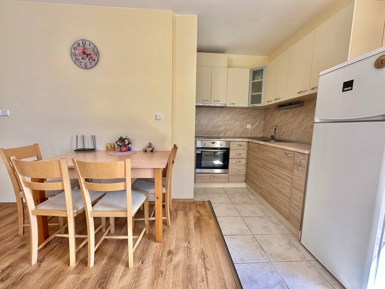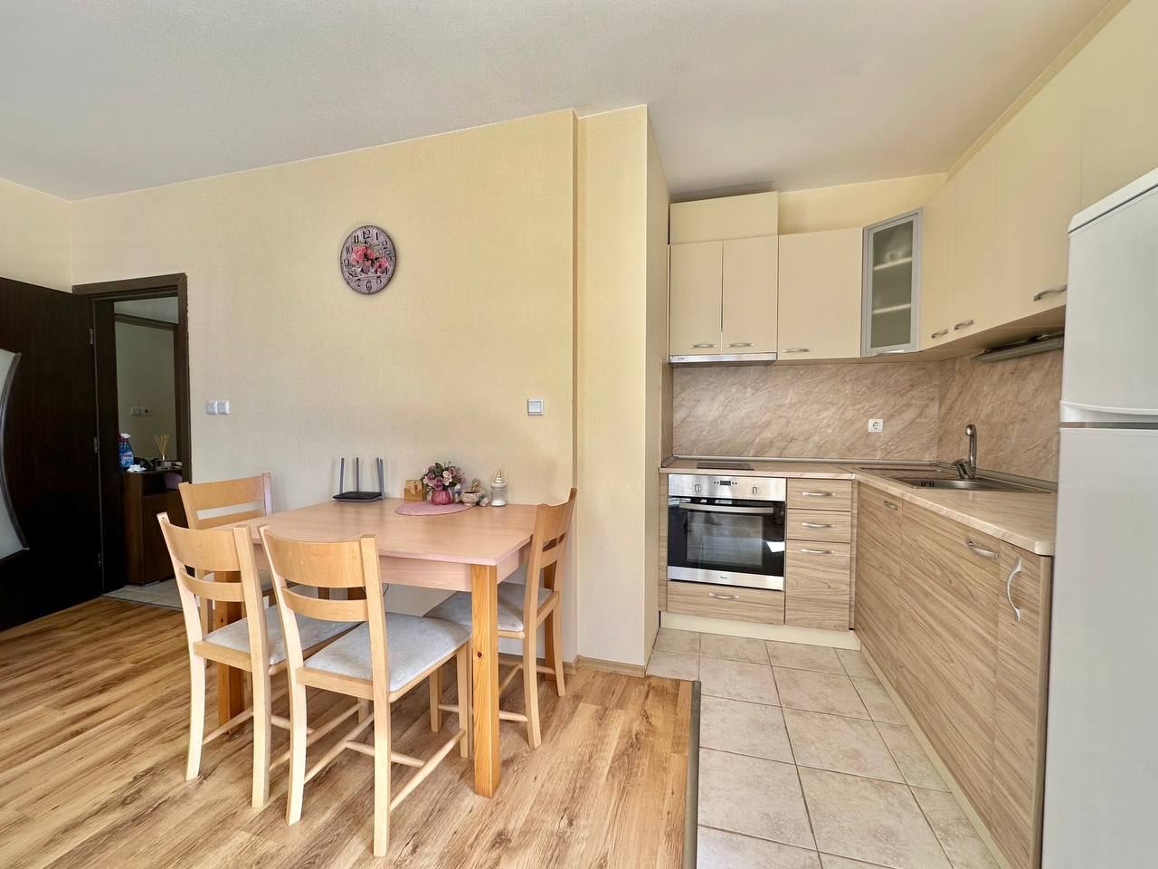 Spacious and bright one bedroom apartment in a residential building in a cozy resort town Ravda. From the house to the beach, as well as to the center and year-round infrastructure, about five minutes walk. The apartment is located on the second floor of the building. Living area is 59 m2. It consists of an entrance hall, living room with kitchenette and dining area, bedroom, bright bathroom with WC and a spacious terrace. The apartment is in very good condition, offered with furniture, appliances and equipment. No fees and service charges! An excellent choice for permanent residence and vacation.