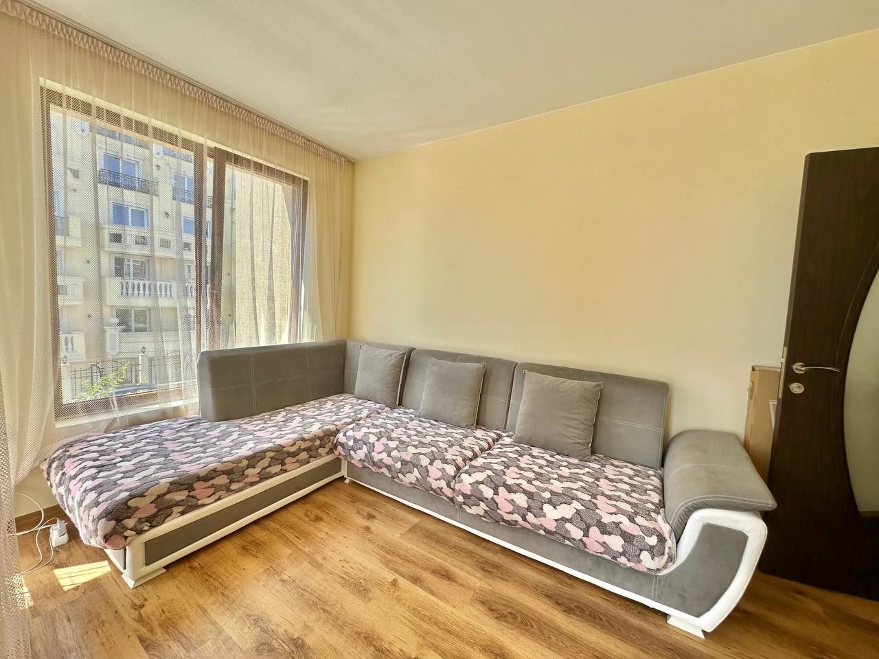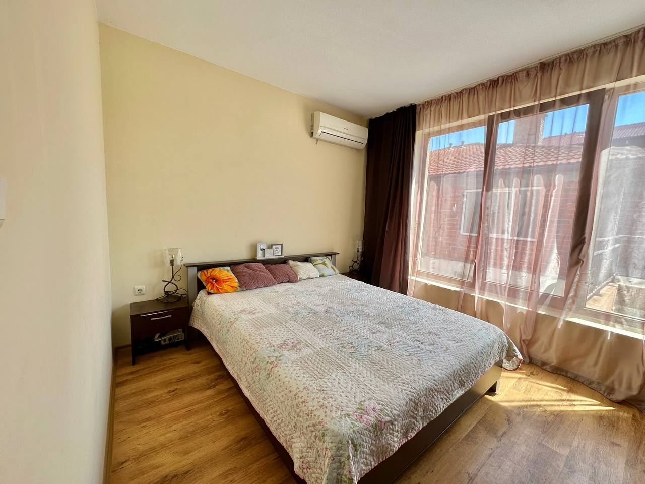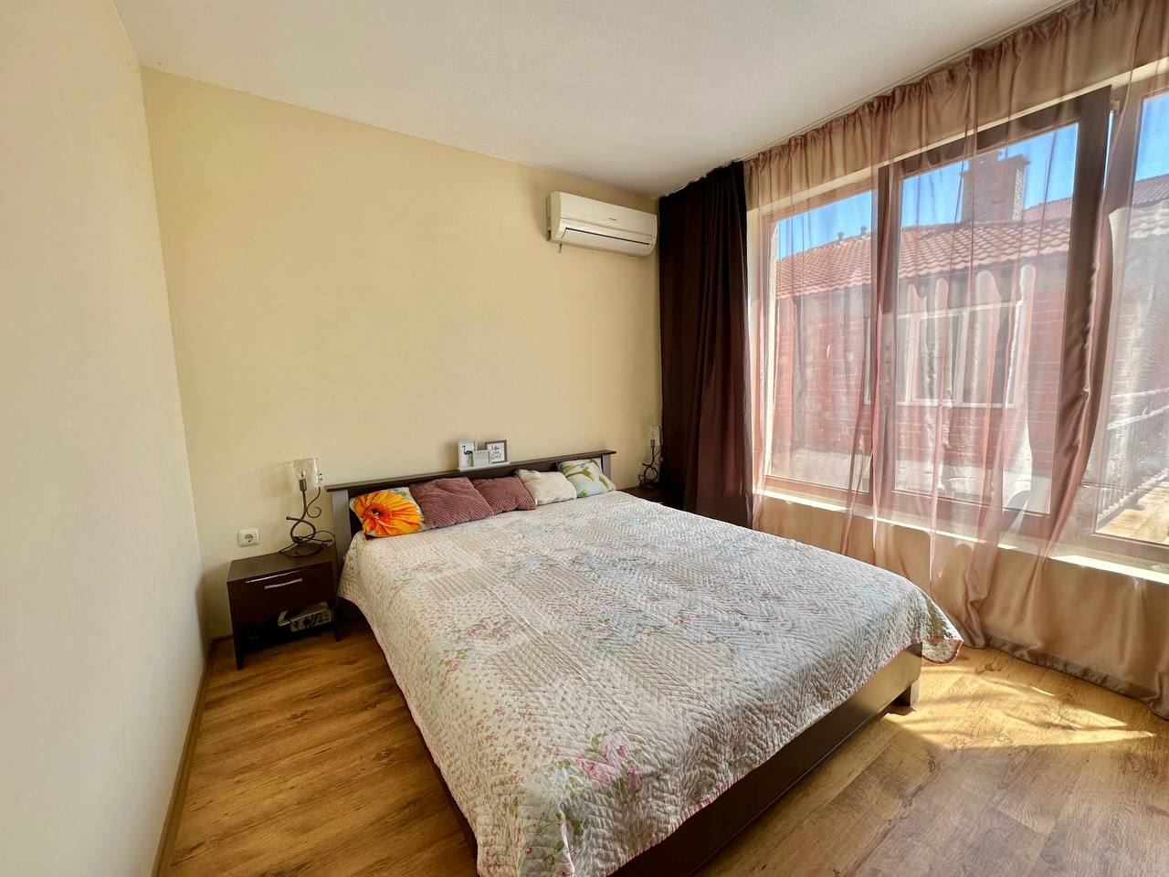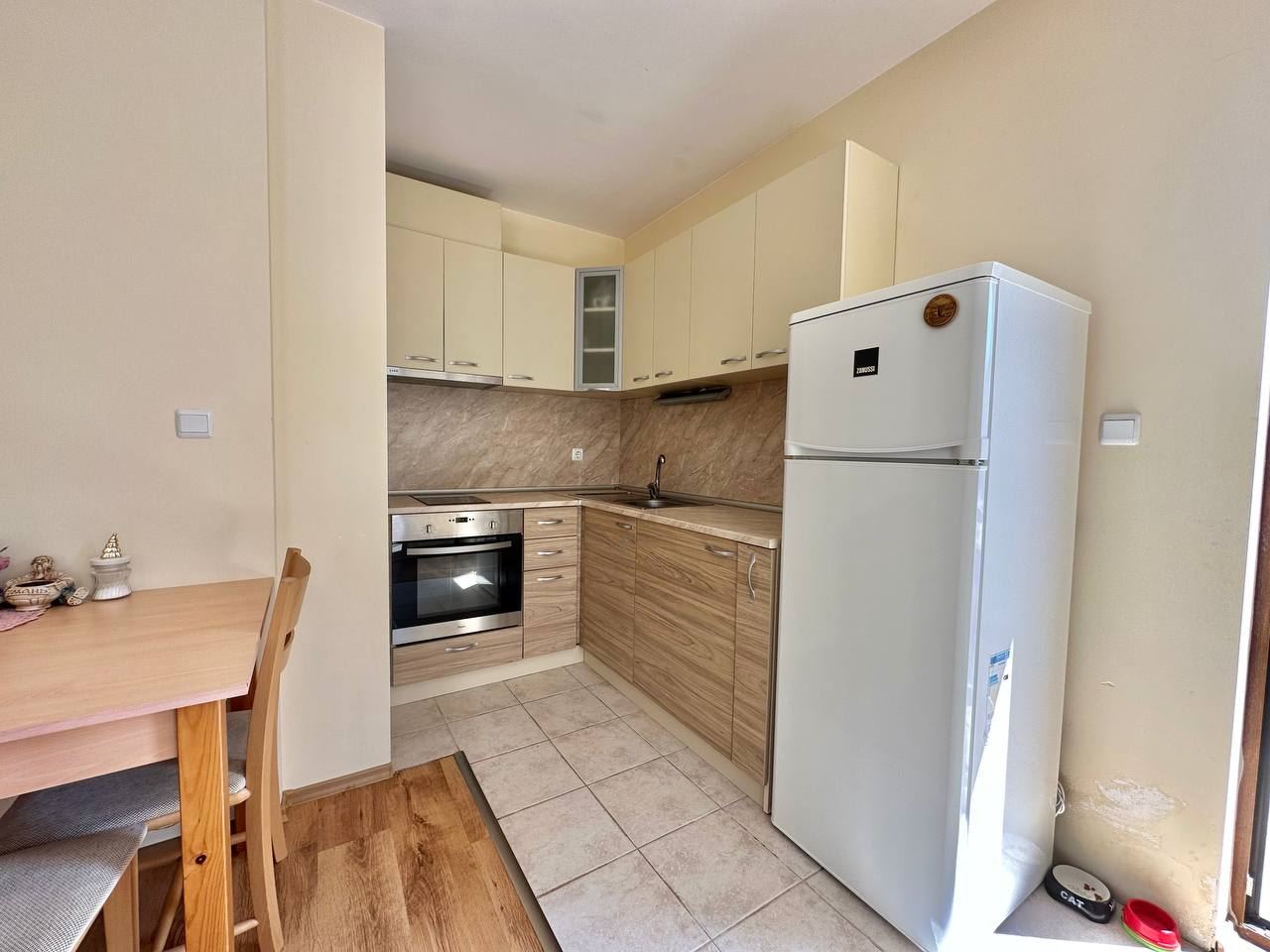 Spacious and bright one bedroom apartment in a residential building in a cozy resort town Ravda. From the house to the beach, as well as to the center and year-round infrastructure, about five minutes walk. The apartment is located on the second floor of the building. Living area is 59 m2. It consists of an entrance hall, living room with kitchenette and dining area, bedroom, bright bathroom with WC and a spacious terrace. The apartment is in very good condition, offered with furniture, appliances and equipment. No fees and service charges! An excellent choice for permanent residence and vacation.