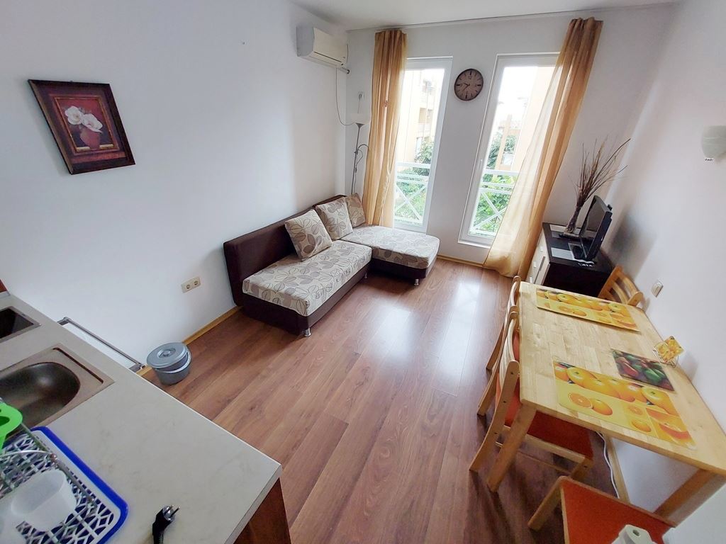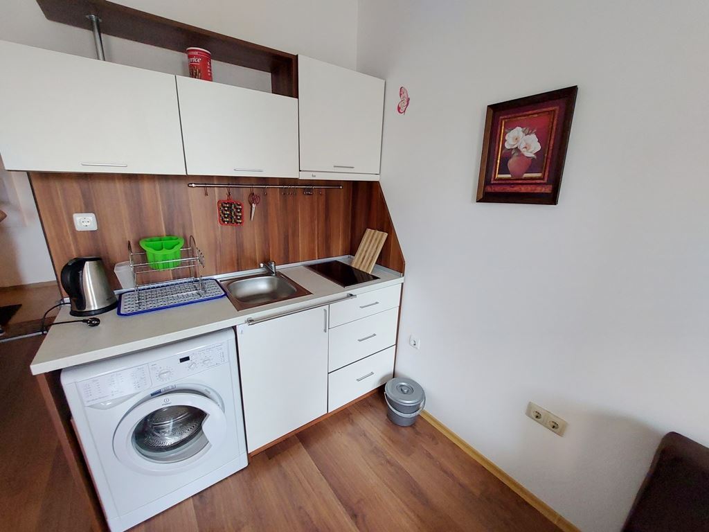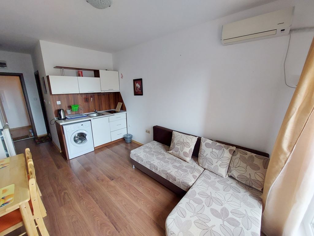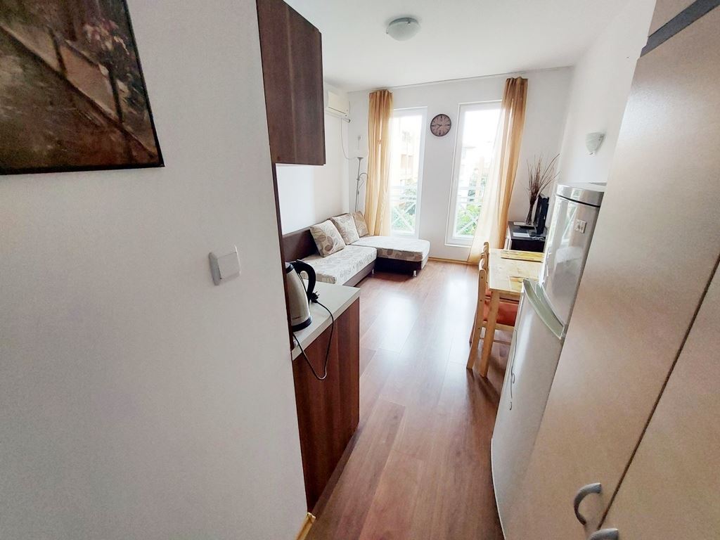 Affordable studio flat in Sunny Beach is located in a residential complex for year-round living. The 25m2 flat is located on the second to last floor. The apartment is fully furnished and appliances and furniture are included in the price. The remote location of the complex from the city centre allows tenants and owners to live in a quiet and calm part of the spa town. Local buses go to the beach and the centre of the resort. All infrastructure necessary for living and recreation is equipped directly in the complex. There are swimming pool, shops, restaurant, cafes, sports and children's playgrounds, parking and so on.