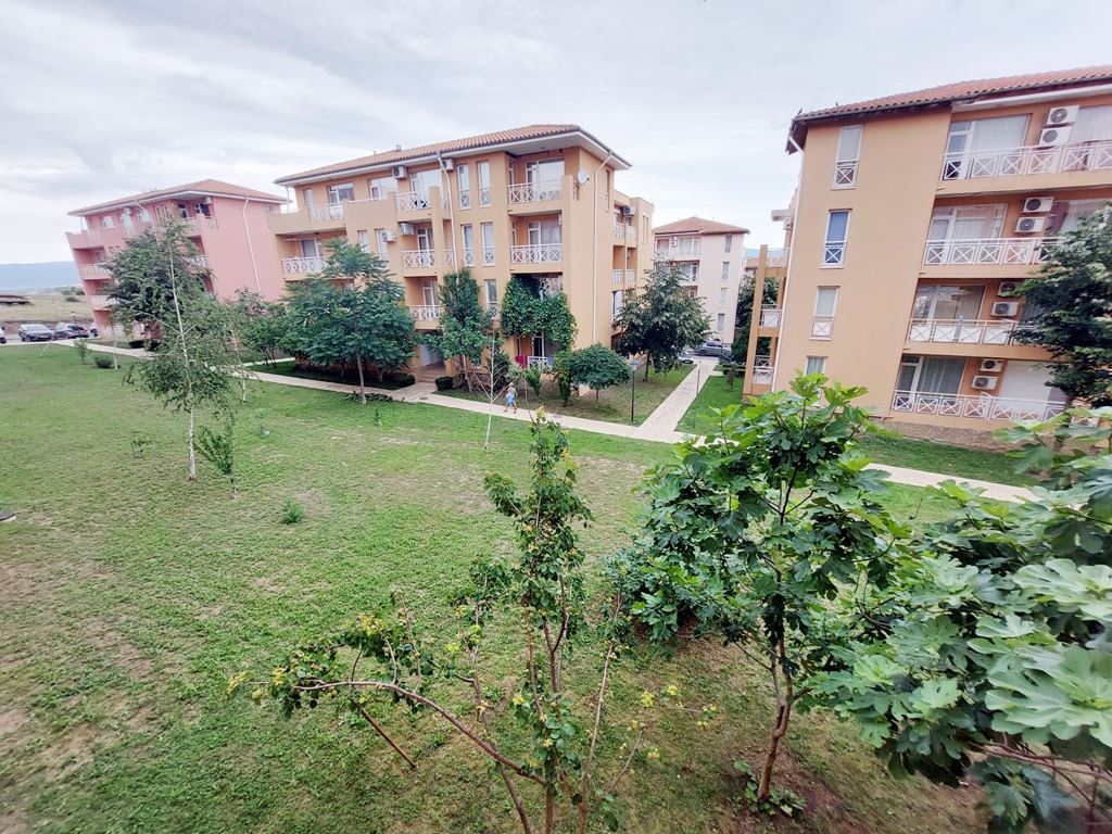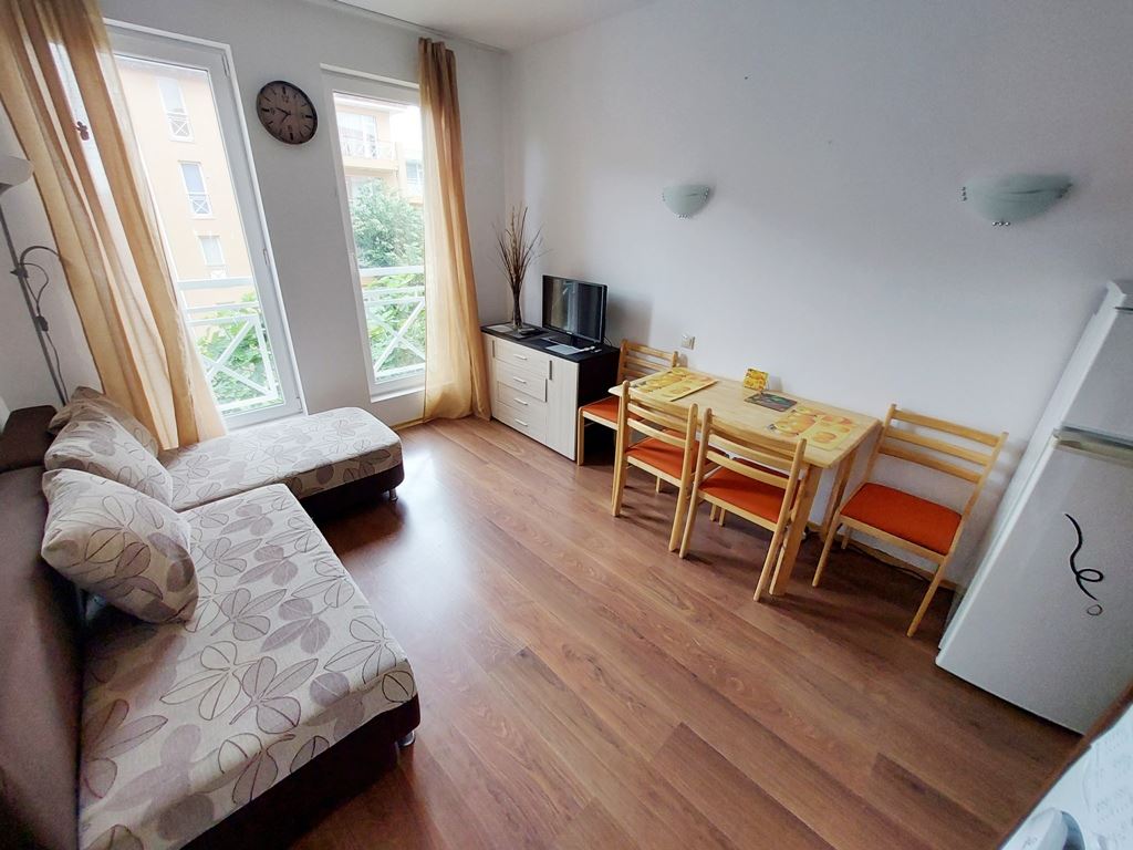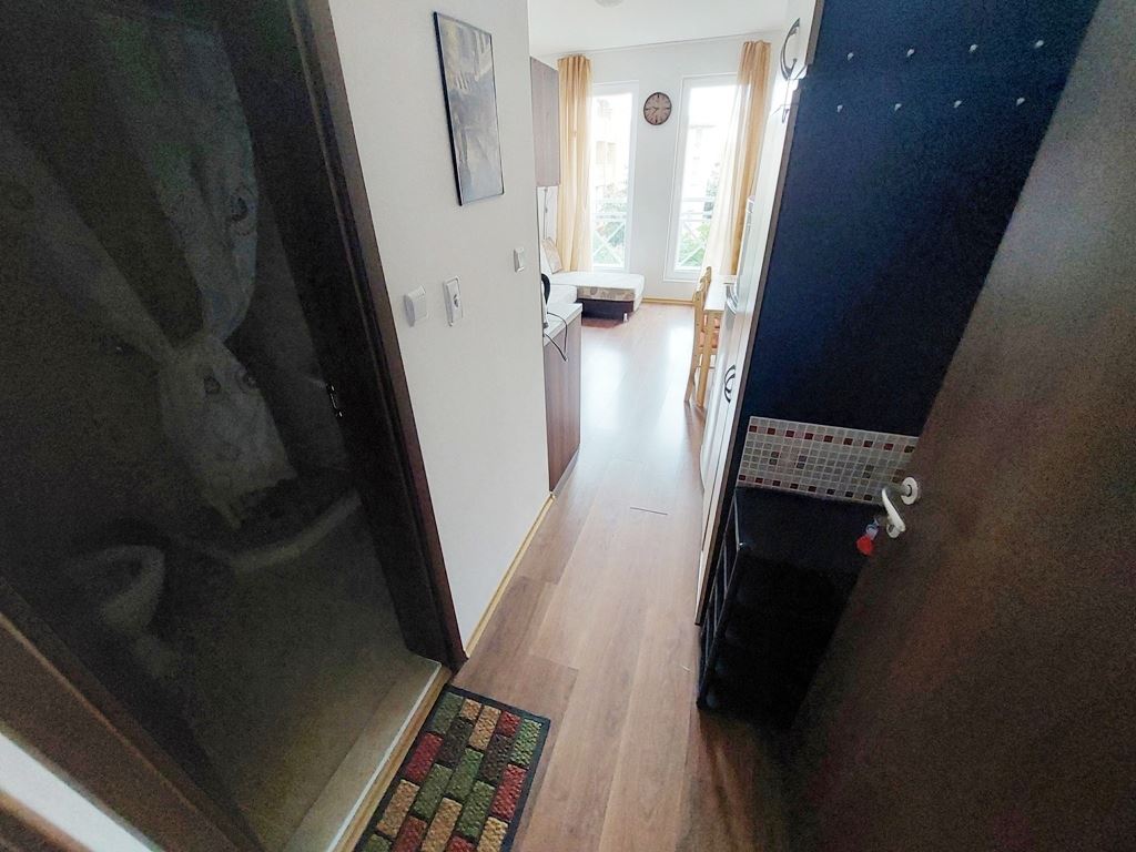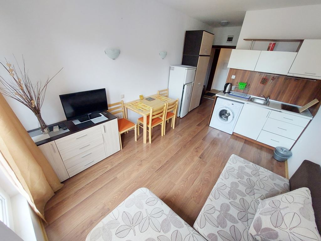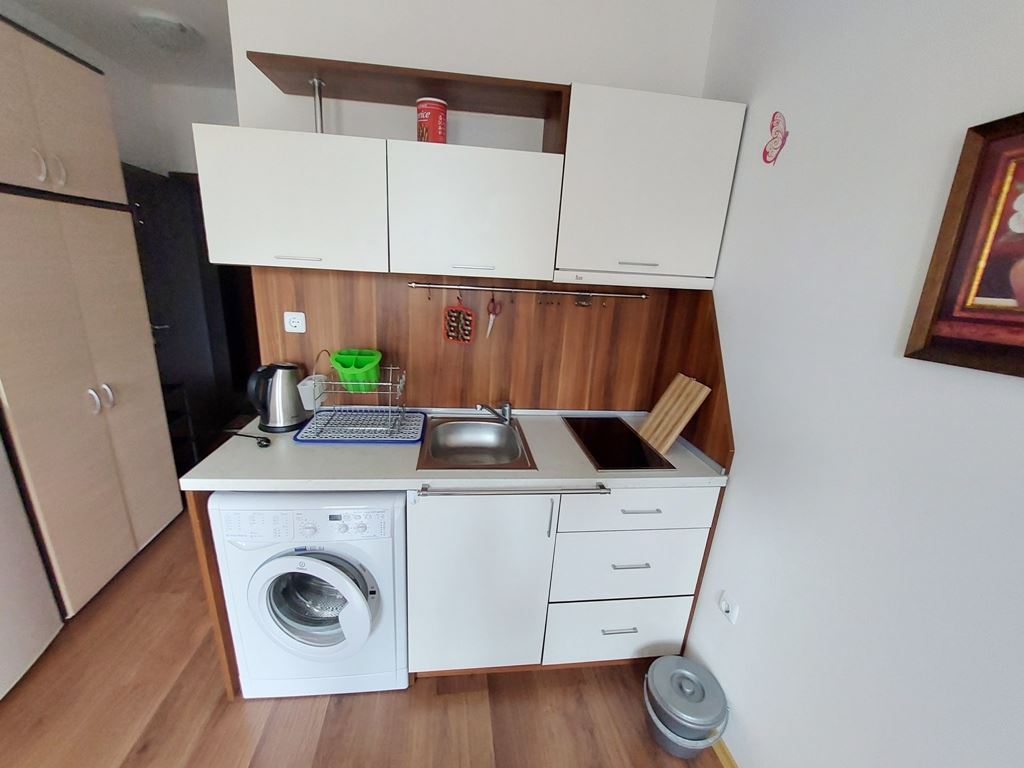 Affordable studio flat in Sunny Beach is located in a residential complex for year-round living. The 25m2 flat is located on the second to last floor. The apartment is fully furnished and appliances and furniture are included in the price. The remote location of the complex from the city centre allows tenants and owners to live in a quiet and calm part of the spa town. Local buses go to the beach and the centre of the resort. All infrastructure necessary for living and recreation is equipped directly in the complex. There are swimming pool, shops, restaurant, cafes, sports and children's playgrounds, parking and so on.