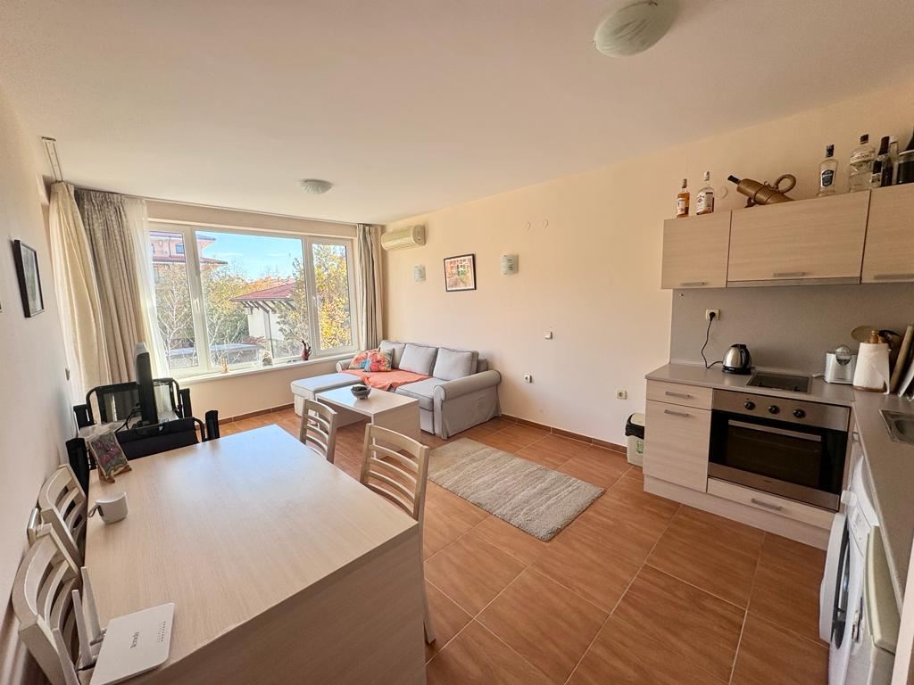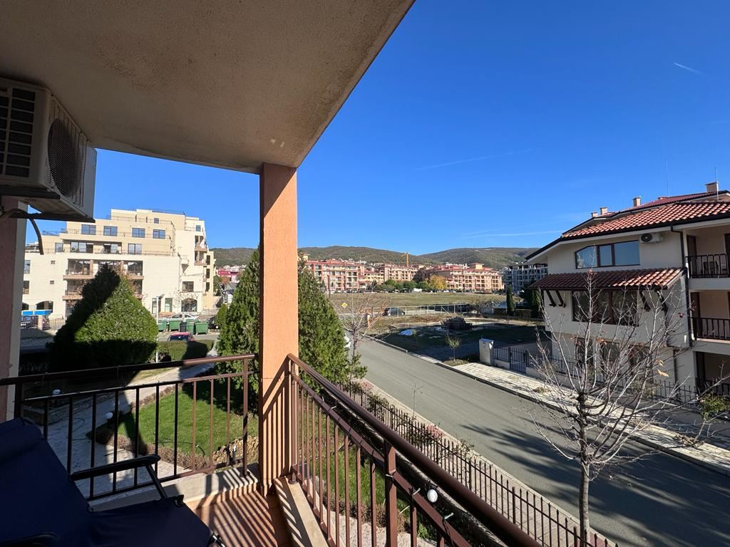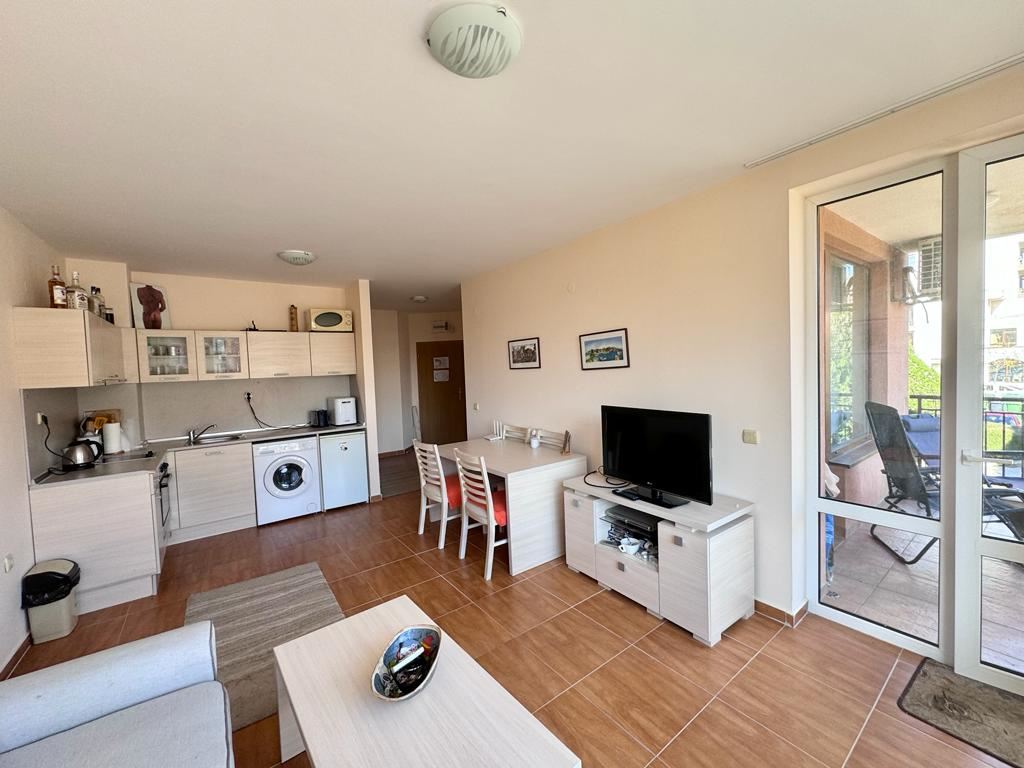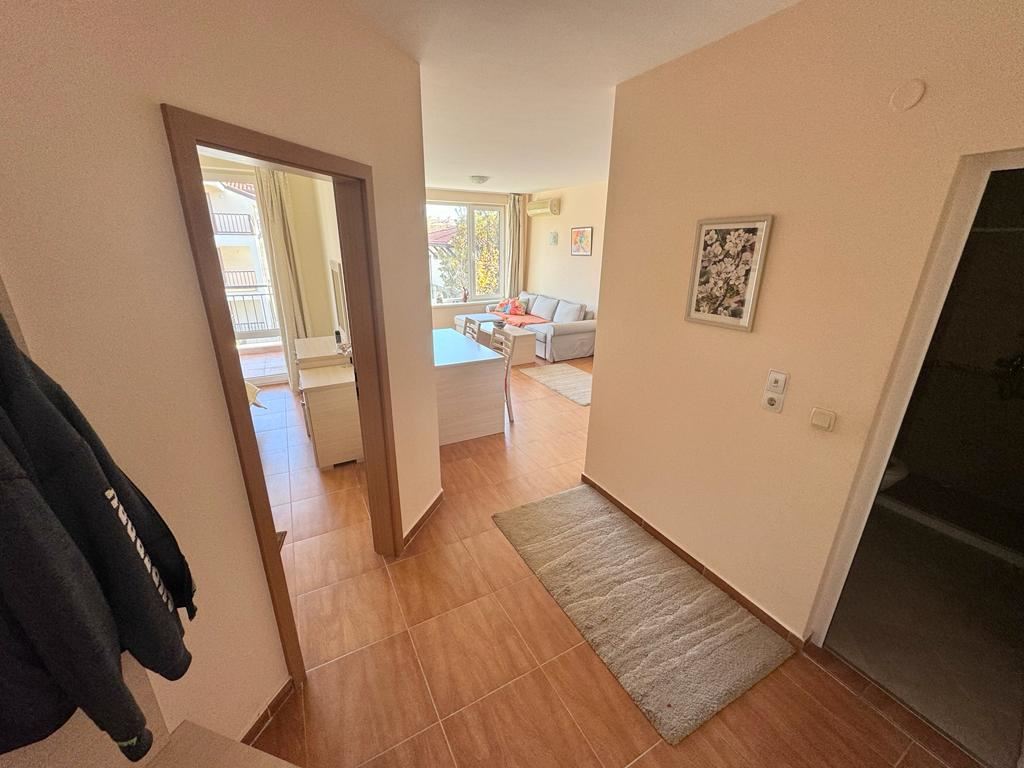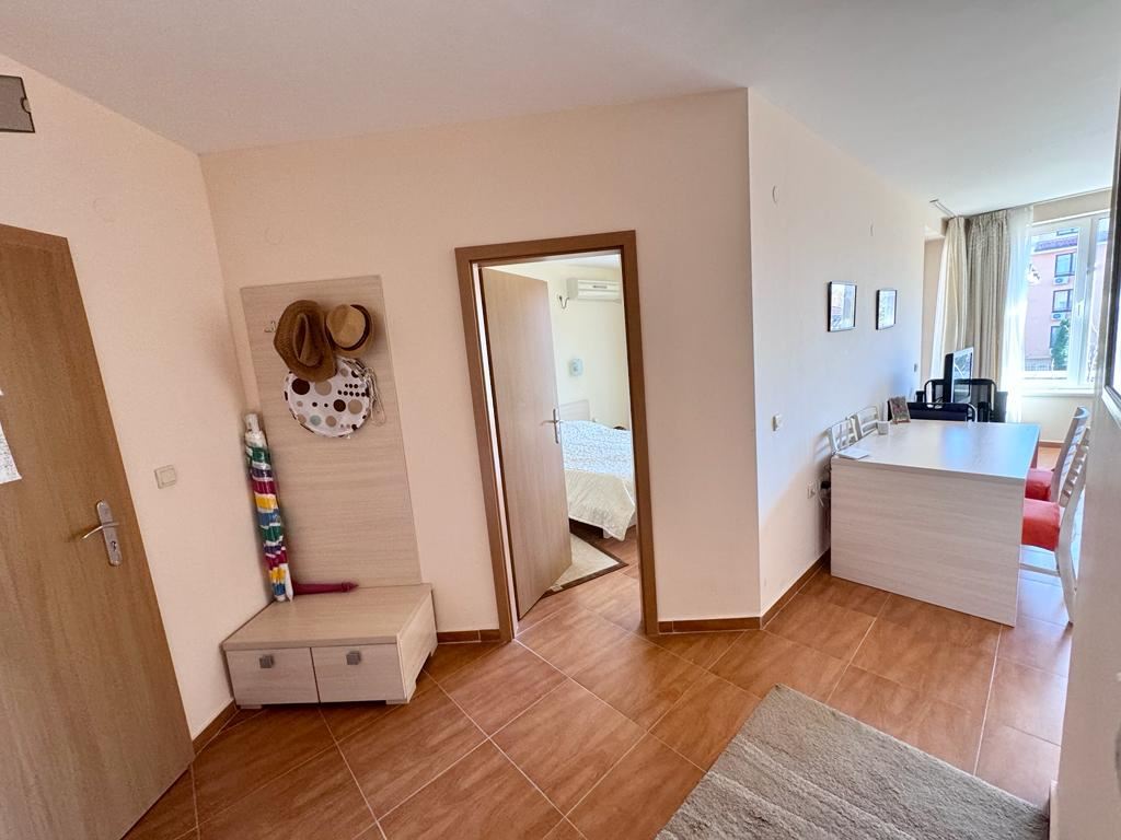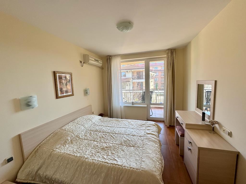 This comfortable one bedroom apartament in a beautiful complex in the town of Sveti Vlas is an ideal accommodation for a comfortable and pleasant holiday. The complex, located just 200 metres from the beach, offers a wide range of amenities for residents. The complex is equipped with swimming pools with children's sectors, making it an ideal place for family holidays. There is also a playground in the complex where children can play and have fun under supervision. The restaurant in the complex provides the opportunity to enjoy delicious cuisine right on its premises, which adds to the convenience for the residents. The apartament is located on the second residential floor of the building and provides 63 square metres of living space. The layout includes a spacious entrance hall, a cosy living room with kitchenette, a separate bedroom, a bathroom with toilet and a terrace where you can enjoy the fresh air and views of the mountains and the city. The accommodation is fully equipped with furniture, appliances and equipment, making it ready for living. The car park in front of the complex provides convenience for car owners and the security system provides safety and peace of mind. This apartament is ideal for those who appreciate comfort, convenience and proximity to the sea in the picturesque resort town of Sveti Vlas.