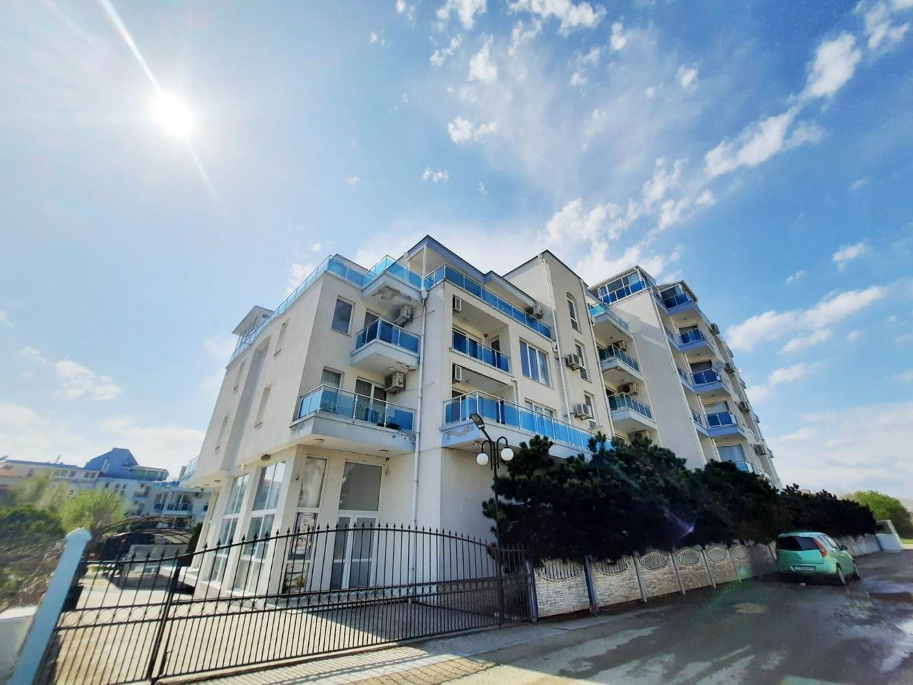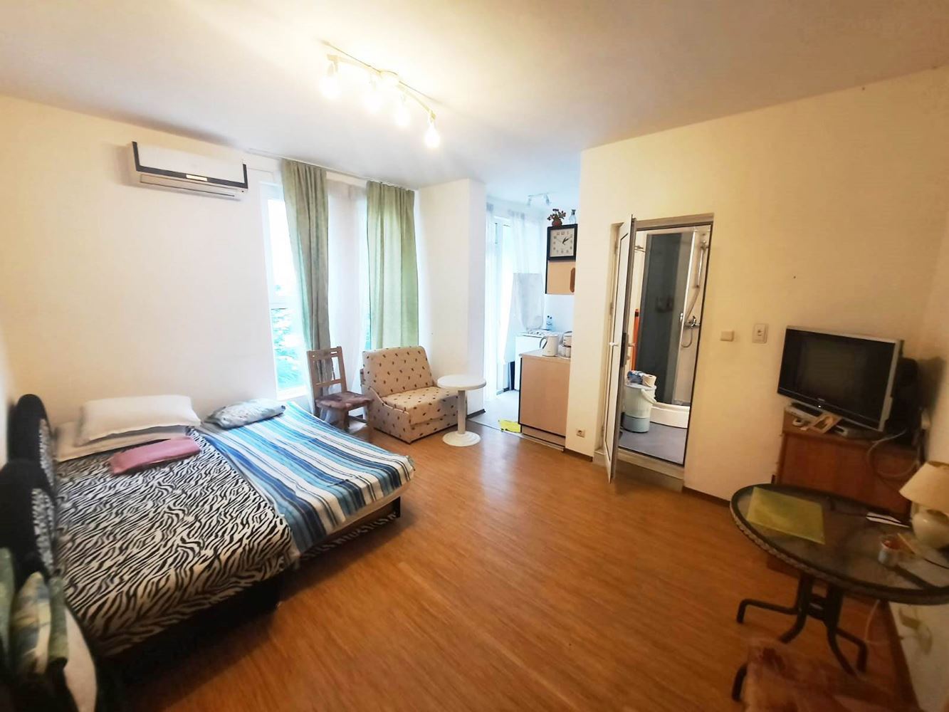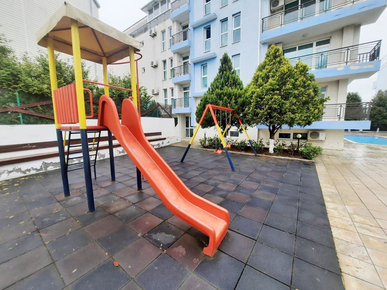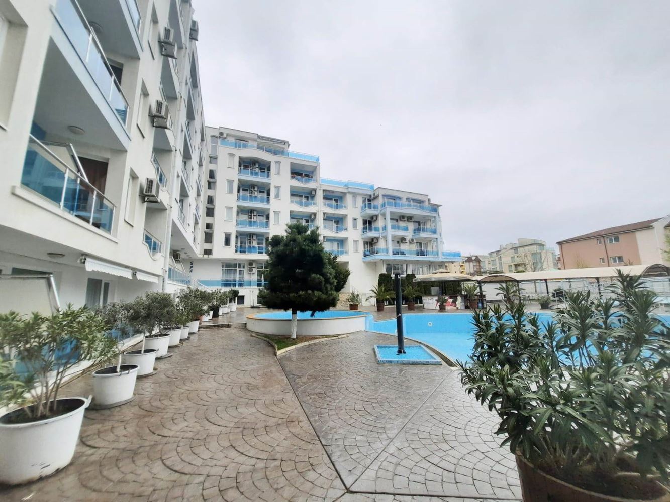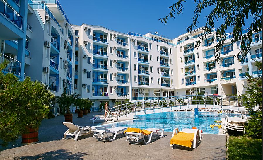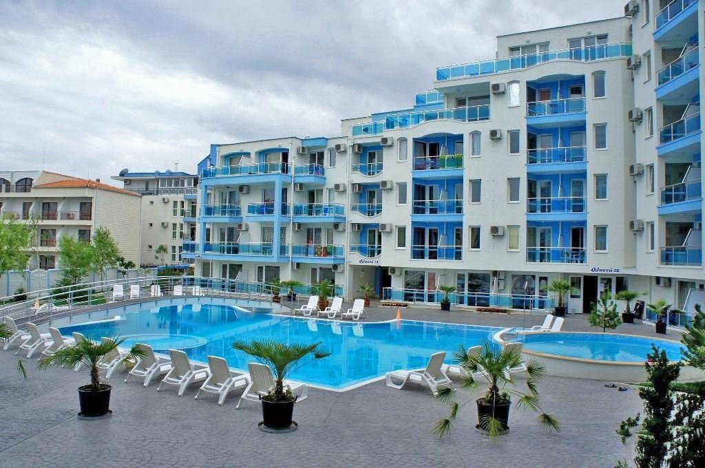 Compact comfortable studio in a wonderful complex in the town of Nessebar. The flat is located in a beautiful sea complex in a quiet area of the resort. The complex is 300 m away from the beach and the sea. All amenities are within walking distance. The complex is gated and well maintained and has a big swimming pool, playground, cafe, bar, fitness, SPA, security and parking. The flat with total area of 33,12 m2 is located on the first floor of the building. The flat has an entrance hall, a room with separate kitchen area, a bathroom with toilet and a balcony. The property is sold furnished and equipped.