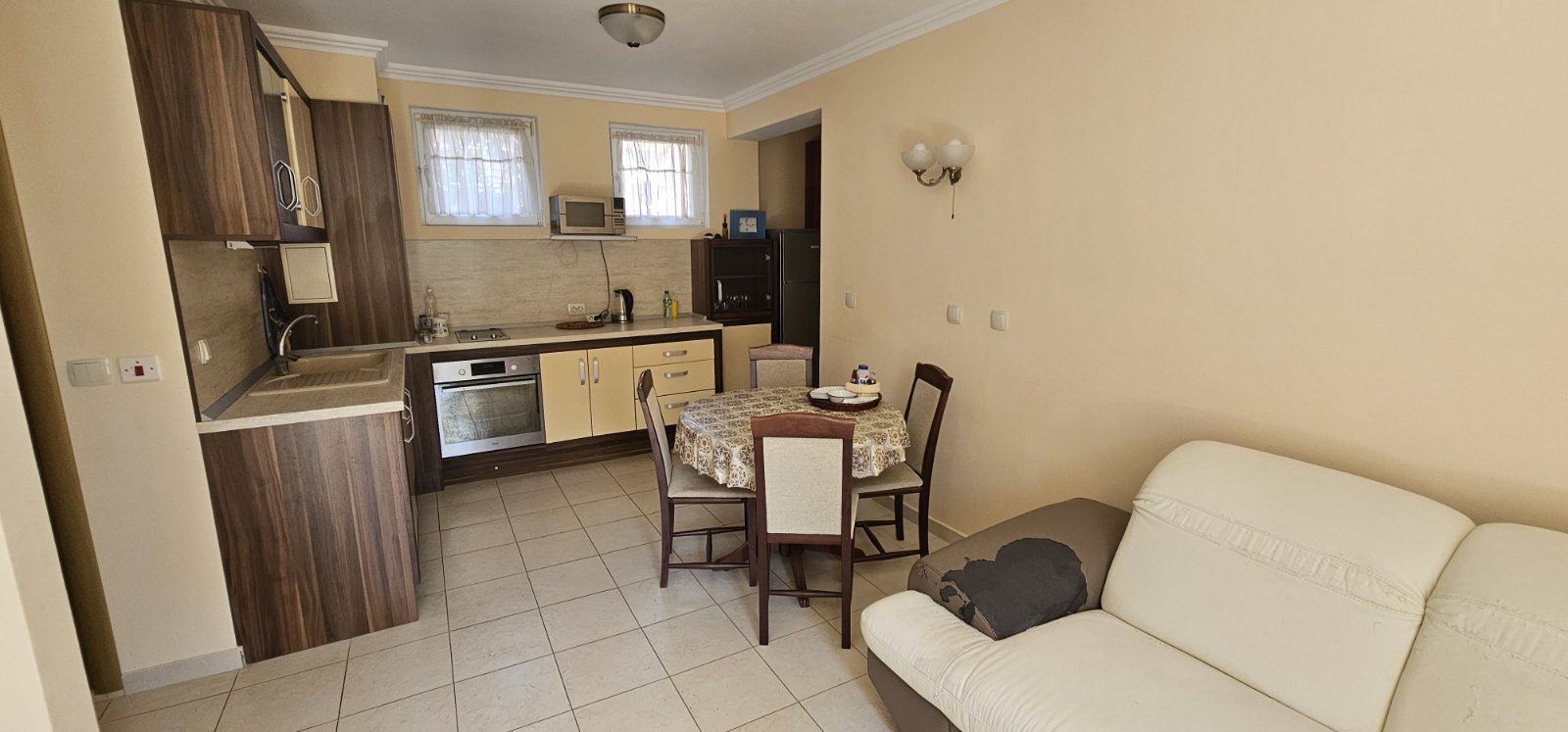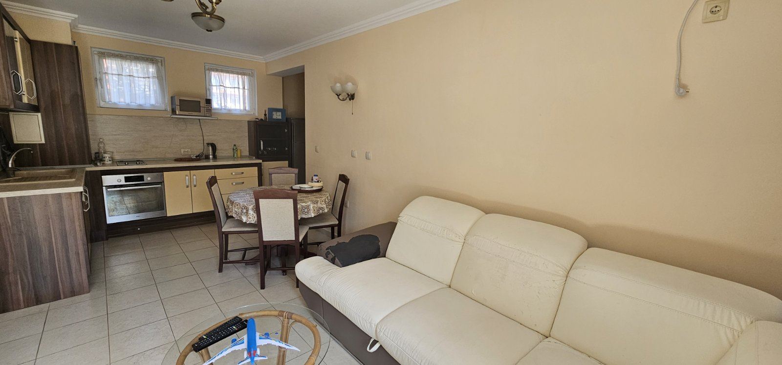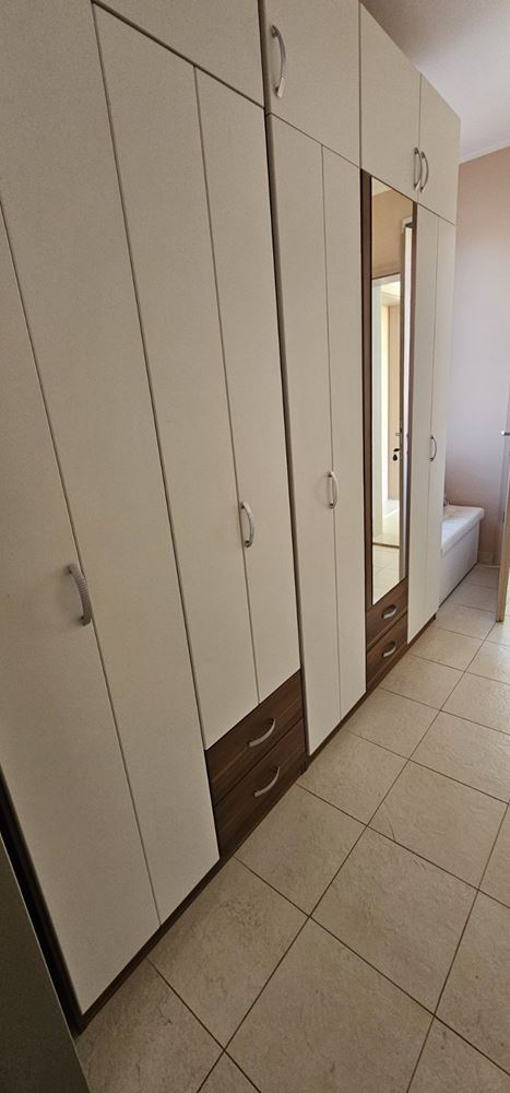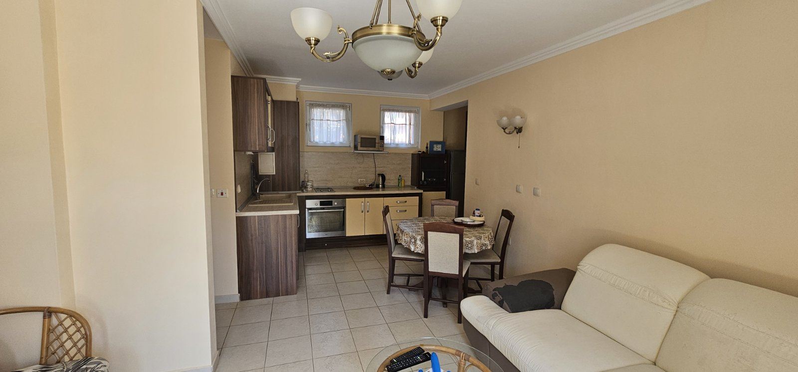 The apartment features a well-thought-out layout that provides comfort and practicality in everyday life. The entrance hall leads to a spacious and bright living room with a fully equipped kitchen, suitable for household needs and family gatherings. The two bedrooms are separate, offering a calm and cozy atmosphere ideal for complete relaxation. The property includes a bathroom with toilet, as well as an additional separate toilet, which is especially convenient for families and guests. From the living room and one of the bedrooms there is access to a terrace with a pleasant view of the swimming pool, providing an excellent space for outdoor relaxation. It is ideal for morning coffee, afternoon rest, or evening relaxation in a peaceful setting. The apartment is offered fully ready to move in, with no need for additional investments. The furniture and equipment have been carefully selected with a focus on comfort and functionality, allowing immediate use or rental.
