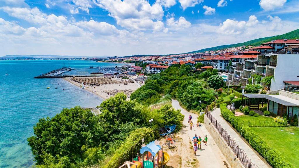 Compact one bedroom apartment of 43 square meters in a complex in the luxurious resort of Sveti Vlas, which is located on the first line of the sea and just a few meters from the sandy beach. The complex is known for its prestigious status and convenient location. The complex is located in the southern part of Sveti Vlas resort, just 250 meters away from the yacht port. In the vicinity there are various shopping outlets, trendy bars and cozy restaurants, which provides ample opportunities for entertainment and relaxation. You will also find it convenient to reach the city center by public transport, as a bus stop and a supermarket are within walking distance. The complex has magnificent views of the Nessebar bay, yacht port and the coast. This creates a unique atmosphere for living. The location near the sea and mountainous areas, as well as the absence of industrial enterprises in the vicinity, guarantee clean and healing air. The complex offers developed infrastructure and many opportunities for tourism and active recreation.