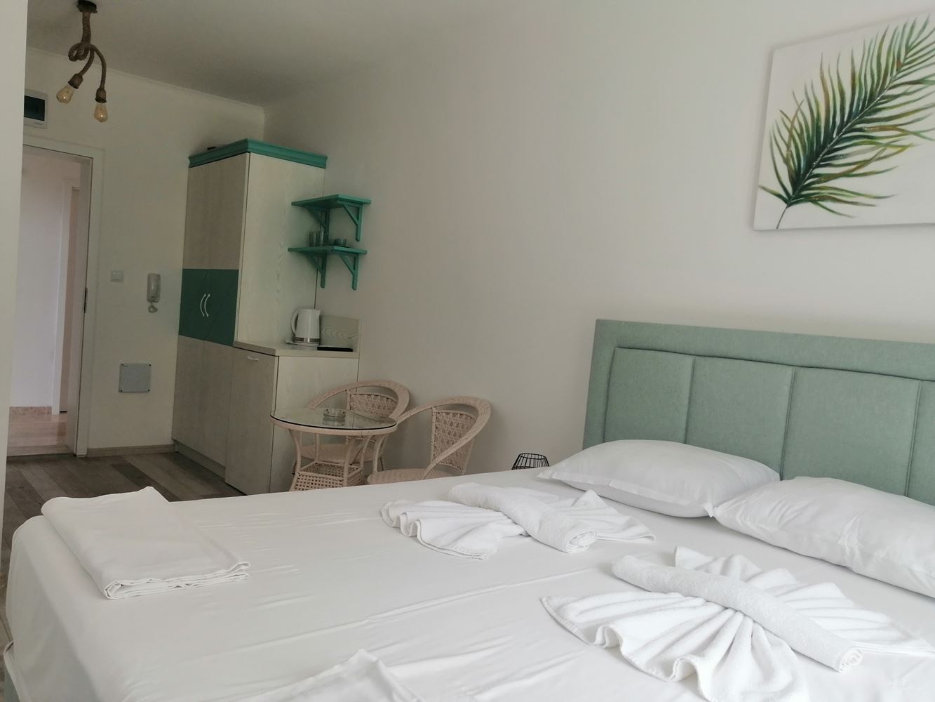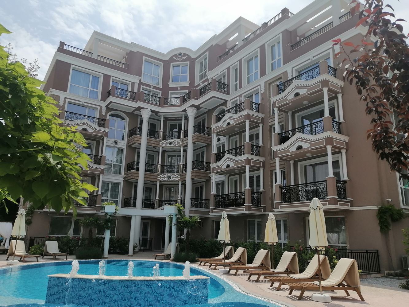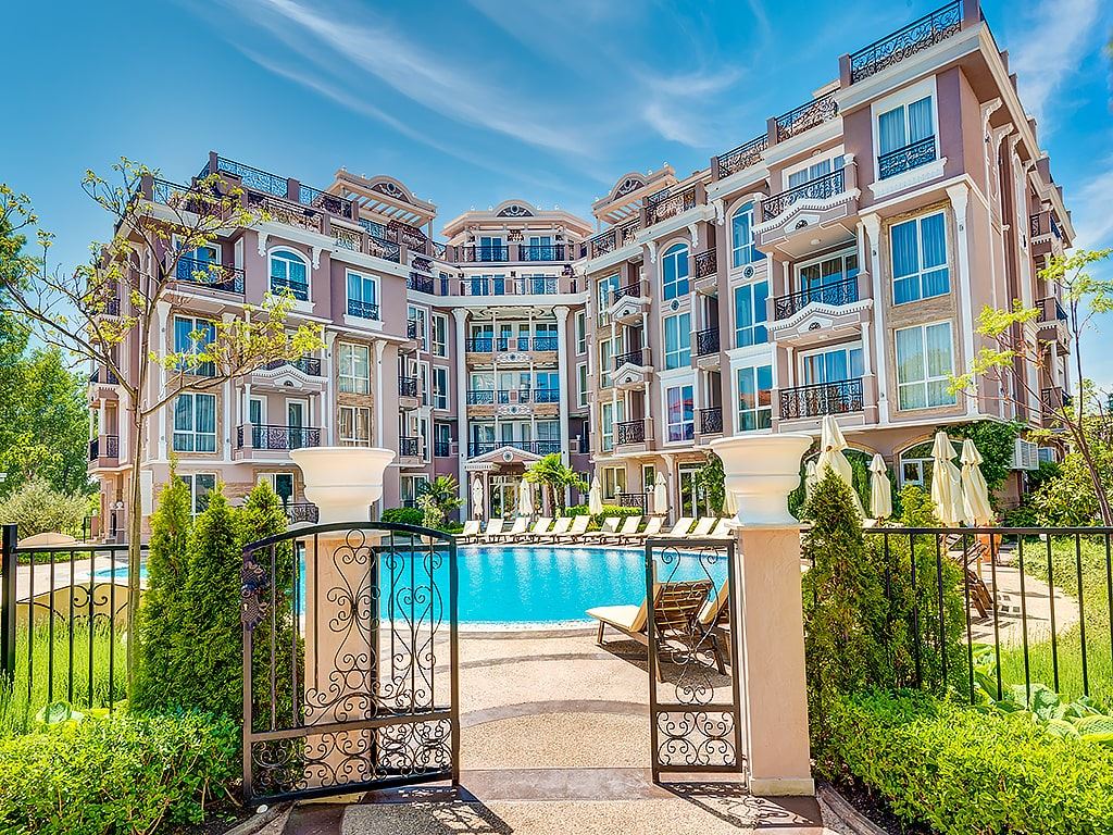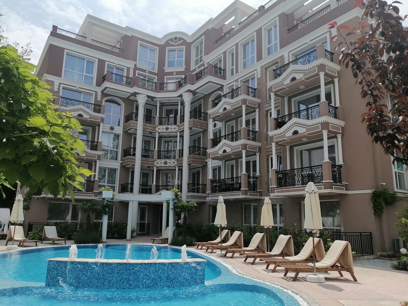 A compact studio flat in an elegant development in Sunny Beach. A cosy, furnished, with appliances flat of 31 m2 is located on the low ground floor. The apartment has a view of the surrounding area and the resort complex. The architecture and interior of the complex strongly resemble the palace exterior and interior. The aesthetically pleasing grounds are a true epicentre of amenities and comfort. There is a beautiful garden, a non-standard swimming pool, a restaurant and a bar, as well as spa services. There is a billiard room, children's playground and parking and other amenities on site. The entire space of the complex is under vigilant security.