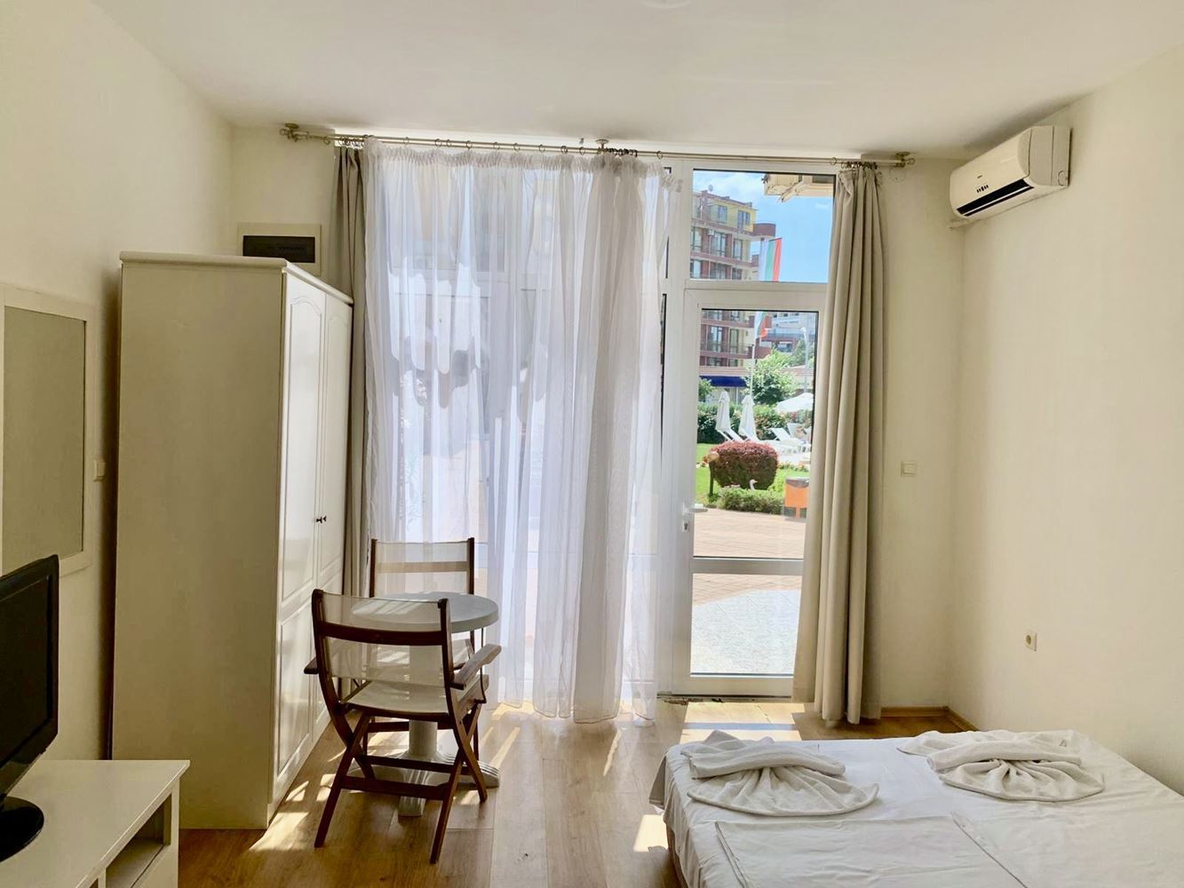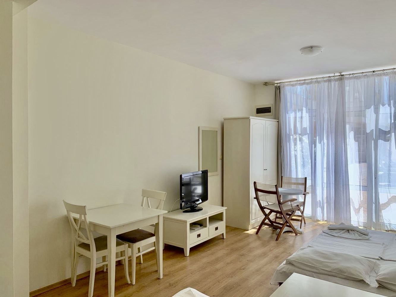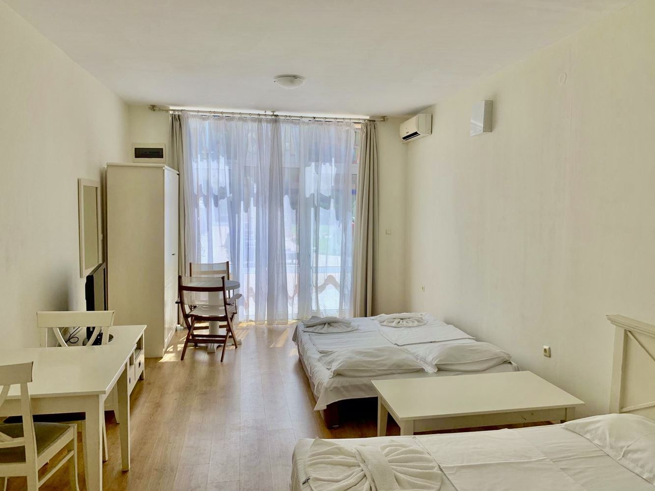 Spacious stylishly furnished studio located in a complex in the center of Sunny Beach. The apartment is on the ground floor and has an area of 52 m2. It consists of an entrance hall, a spacious living room combined with a kitchenette and a bedroom, a bathroom with toilet and a veranda with access to the yard and the pool. The apartment is fully furnished and ready to move in.