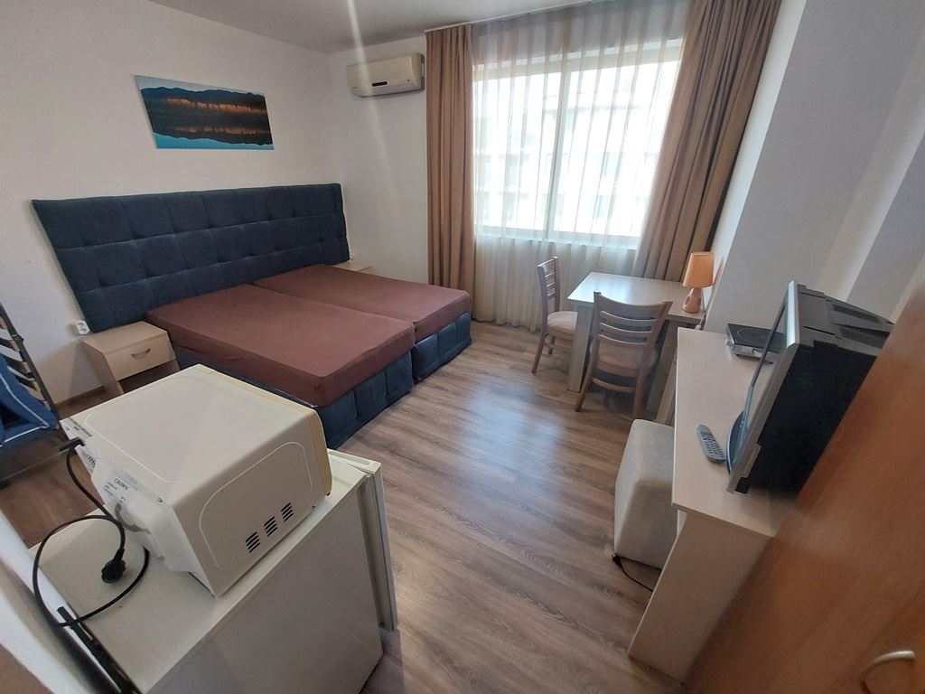 A friendly furnished studio flat in Sunny Beach in a complex located in a well-appointed part of the resort within walking distance of the beach. Nearby is a diverse infrastructure: shops and cafes, pubs and bars, restaurants and supermarkets, etc. It is a comfortable place for comfortable summer holidays. The complex has a swimming pool with relaxation area, restaurant, reception, permanent security, bar. It is 400 metres to the beach. The flat is located on the fifth floor of the building with a lift. The size of the flat is 28 m2. The flat consists of an entrance hall, living room without kitchen unit, but with the possibility of its installation and a bathroom with toilet. Without balcony. The apartment is for sale furnished.
