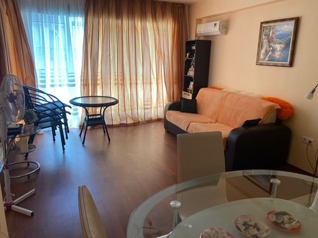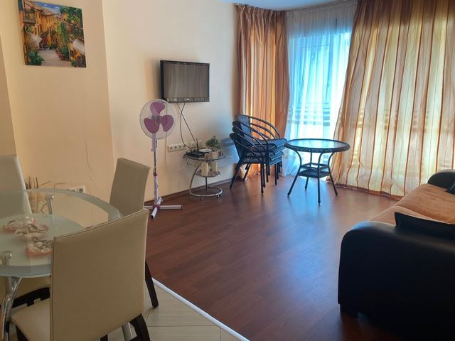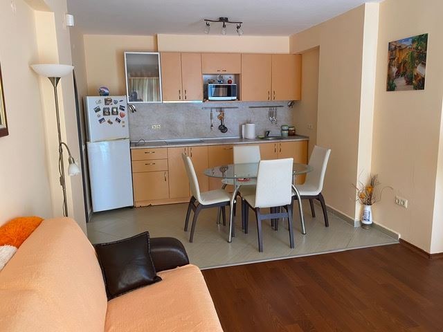 The apartment has a functional layout and convenient East/West orientation, ensuring plenty of light and ventilation throughout the day. It consists of a spacious living room with a kitchen and dining area, a cozy bedroom, a bathroom with toilet, and a terrace with a pleasant view of the surroundings. The property is fully furnished and equipped, ready for immediate use.