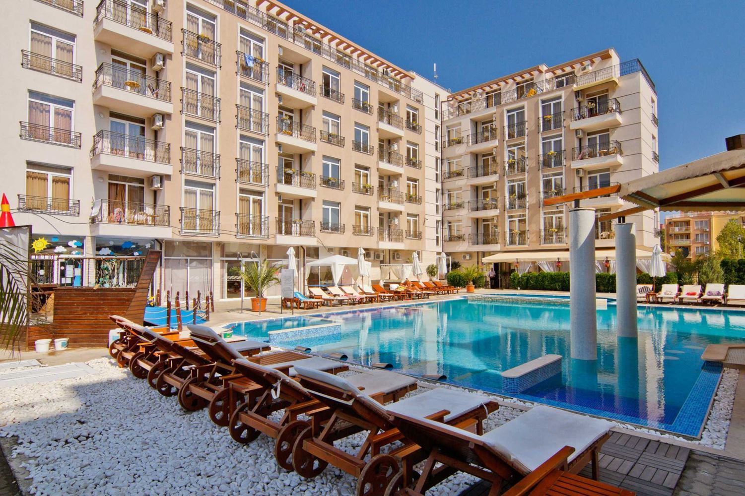 The complex offers a wide range of amenities for a calm and active holiday: a large outdoor pool for adults with jacuzzi and underwater massage beds, pool bar, children's pool and educational kids’ center, spacious restaurant with open terrace facing the pool, lobby bar, reception, office, and parking. The complex operates year-round and is located next to the water park and only a 10-minute walk from the resort center and the beach.