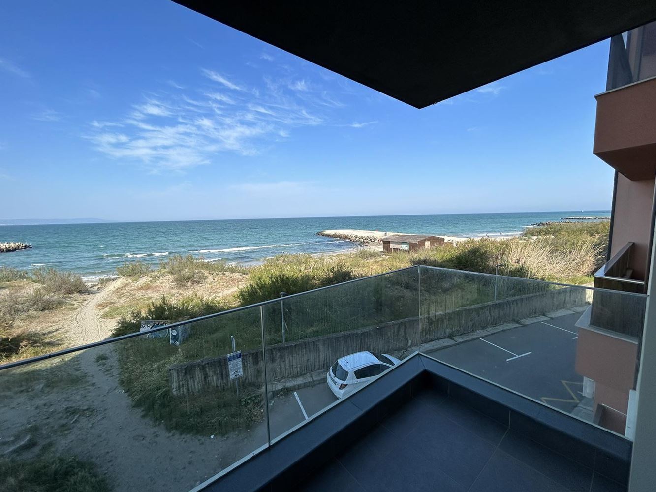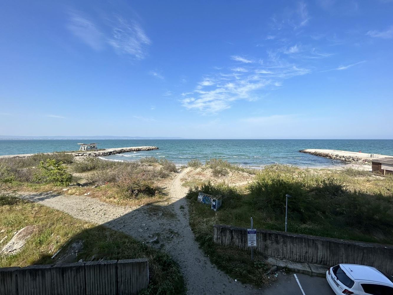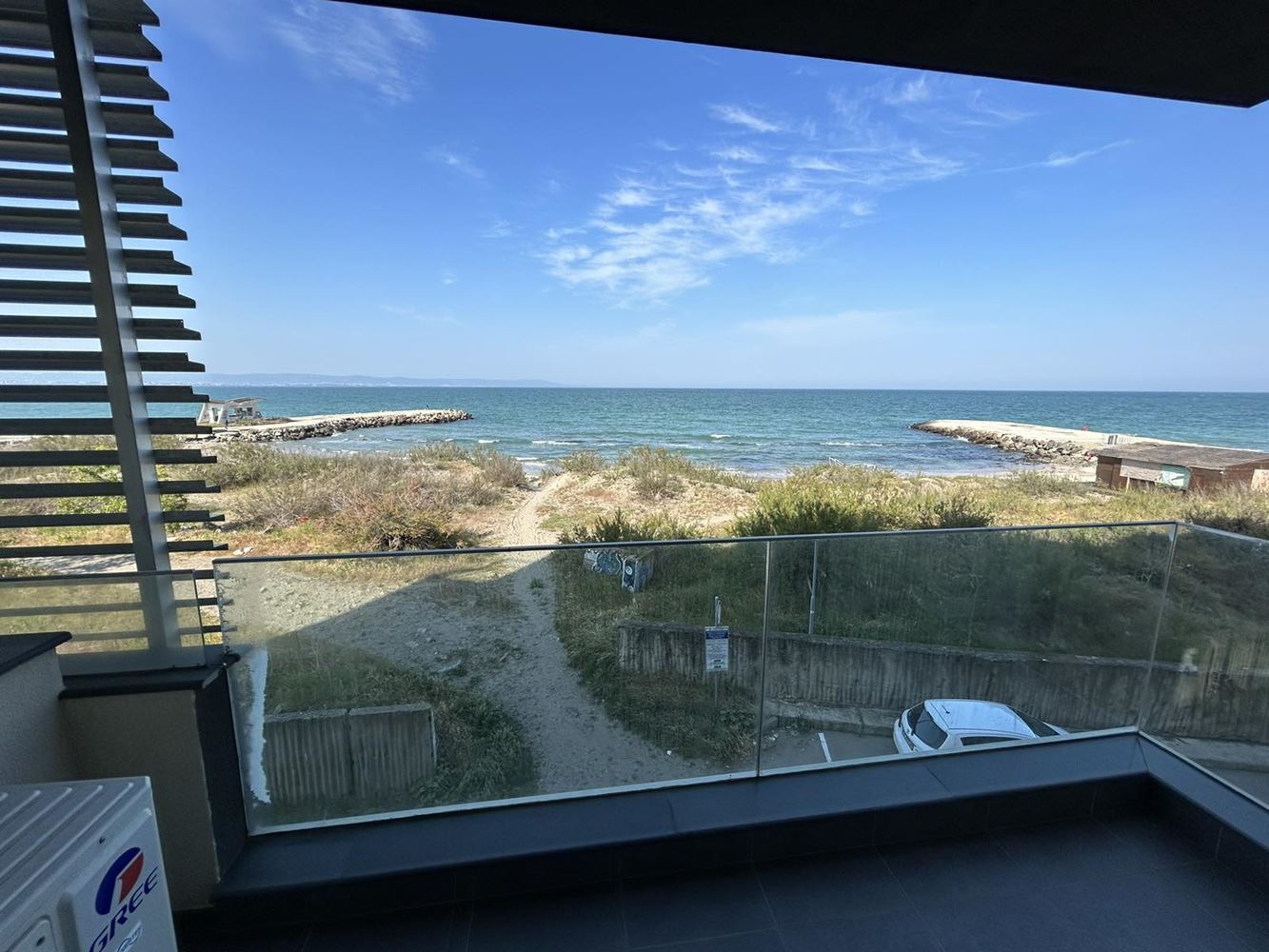 Elegant and modern two-bedroom apartment with sea view in a front line residential building, suitable for permanent residence in the town of Pomorie. The apartment is located on the second floor of a six-storey house. Its area is 90 m2. It consists of a spacious kitchen-living room, bedroom, bathroom unit and a large balcony with beautiful sea view. The apartment is offered fully furnished with stylish modern furniture and equipped bathroom unit. The house is already commissioned, located 30 meters away from the sea. In walking distance to all urban amenities, grocery supermarket, market, bus station, bars, restaurants and all kinds of entertainment. Year-round accommodation, a spa town with balneology and mud baths. Burgas airport is about 7 km away. Comfortable bus service every 30 minutes to Burgas and nearby resorts.