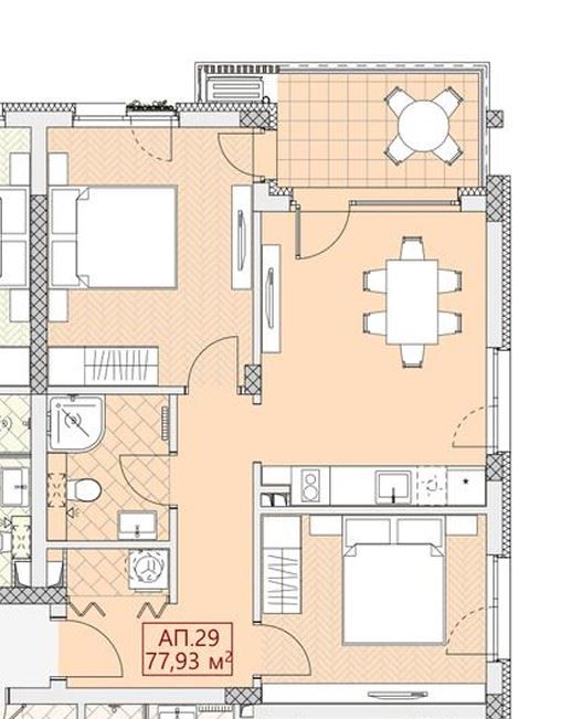 The apartment has a total area of 78.84 m² and is located on the fourth floor. The layout is functional and well-thought-out, including an entrance hall, a spacious living room with a kitchen area, two separate bedrooms, a bathroom with a toilet, and a terrace suitable for rest and relaxation. The property is offered turnkey, without furniture, which gives the new owners the opportunity to furnish it entirely according to their own taste and style.