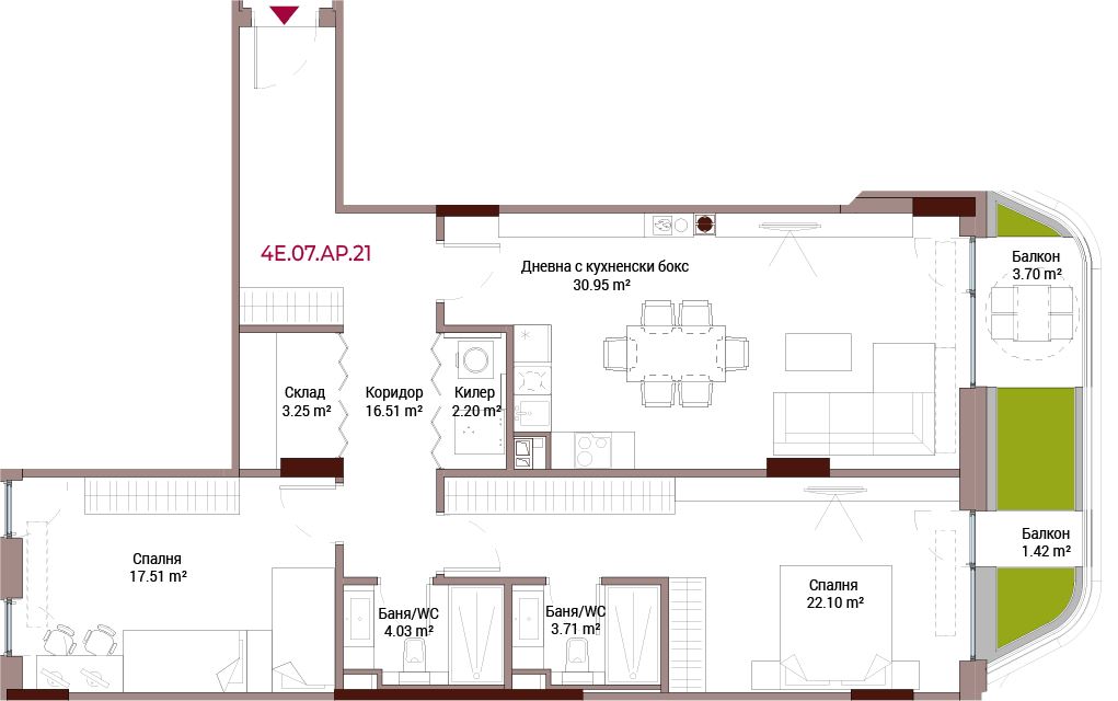 We present a three-room apartment on the 7th floor with a built-up area of 122.27 m², a total area of 157.33 m², and an area including landscaped terraces of 164.69 m². The residence offers timeless elegance and distinctive character inspired by Sofia’s iconic architecture.