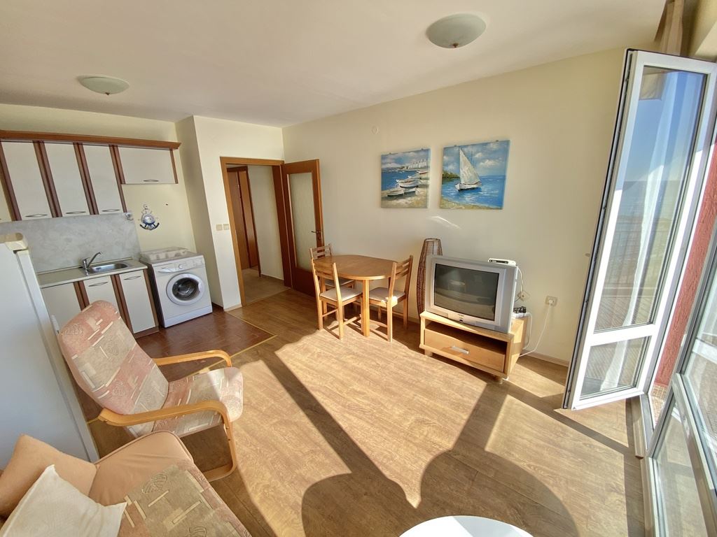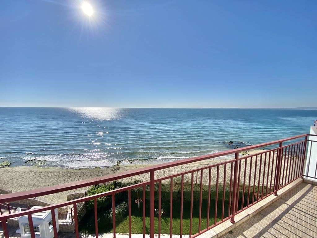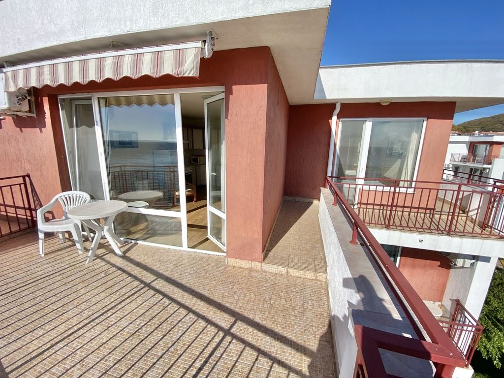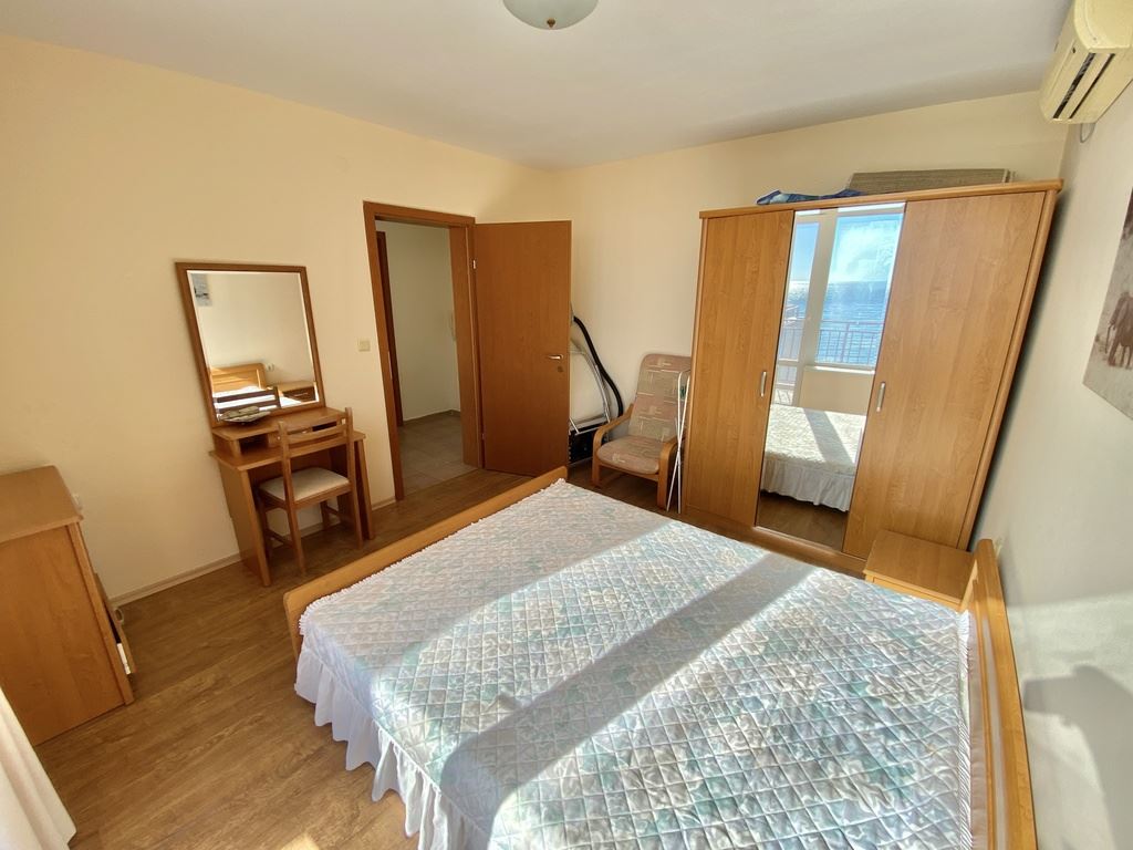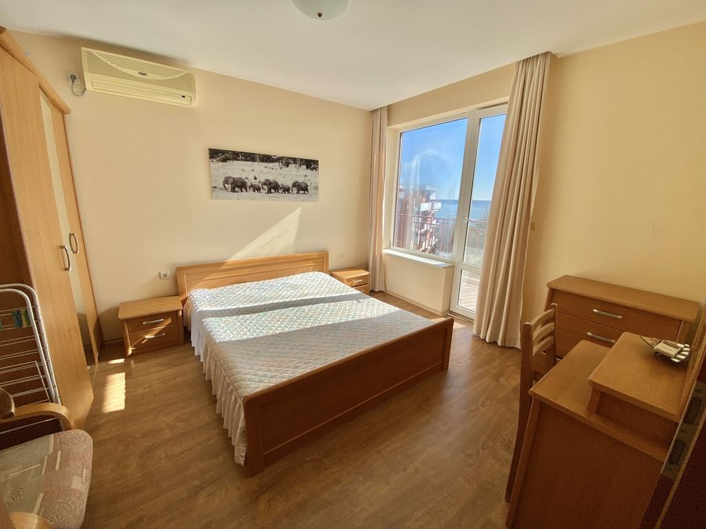 We are pleased to present a one-bedroom apartment with an incredible sea view, located in a beachfront complex in Elenite. The apartment is situated on the fourth floor (without an elevator) with a total area of 73 m² (living area – 69 m²). It consists of an entrance hall, a living room with a kitchenette, a bedroom, a combined bathroom, and a large terrace running along the entire perimeter of the apartment. The property has a southeast exposure. From the windows of the bedroom and living room, as well as from the terrace, you can enjoy breathtaking views of the sea and the bay of Sunny Beach. Each room is equipped with air conditioning. The apartment is sold fully furnished and with household appliances.