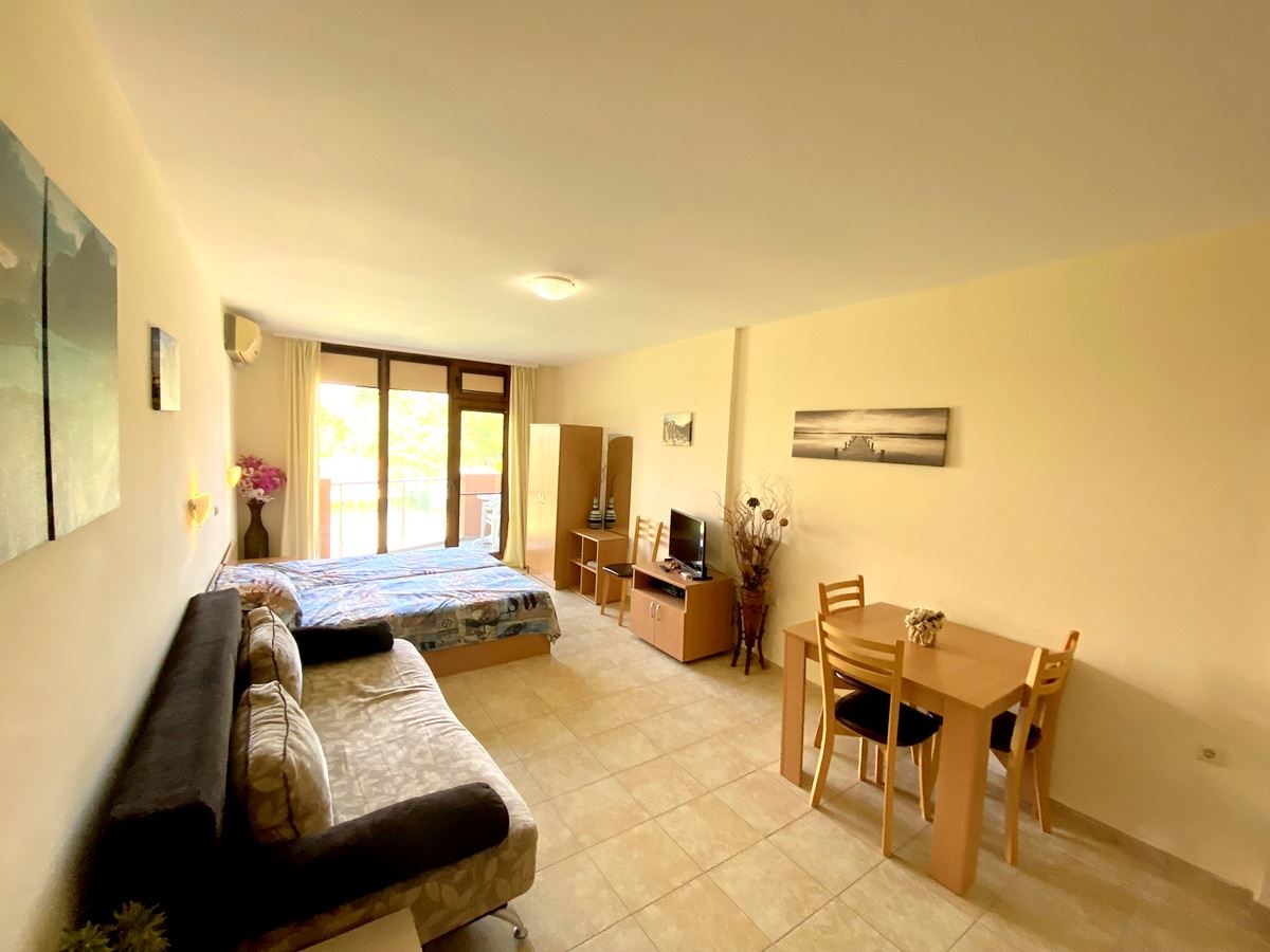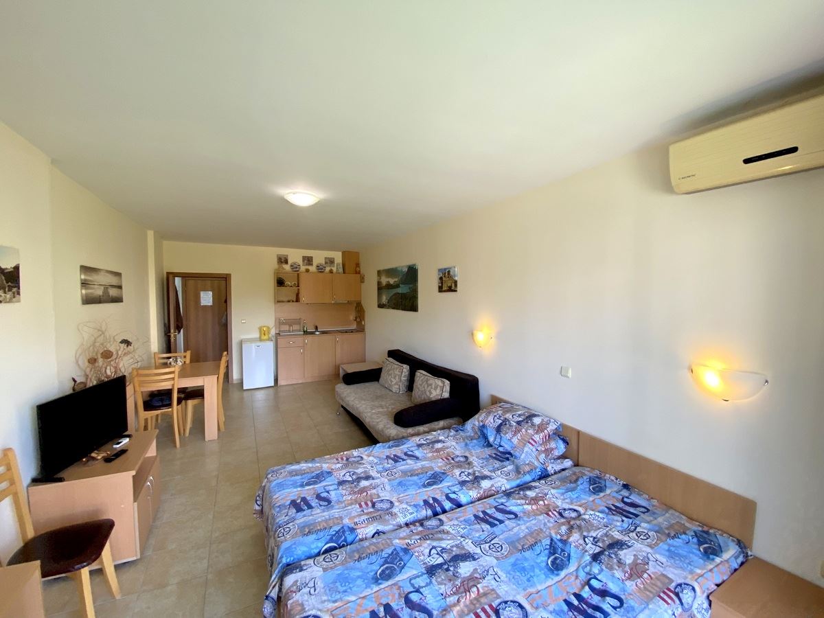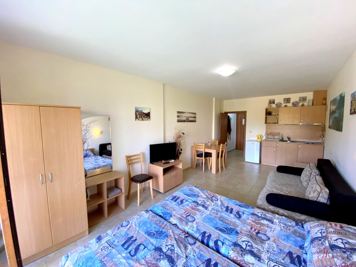 Spacious studio in a beachfront development. The five-storey building has modern architecture and a unique design. The flats are finished with high quality finishes, thermal and waterproofed walls, which allows for year-round living. There is a wide range of amenities and entertainment for residents: landscaped garden, outdoor swimming pool with lounge area, with sun loungers and umbrellas, children's playground, shops with convenience goods, ample parking for cars, constant security, video surveillance and maintenance. The flat is offered furnished and equipped and has a size of 42 m2. It is located on the third floor.