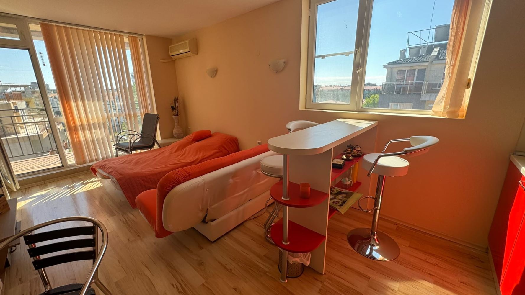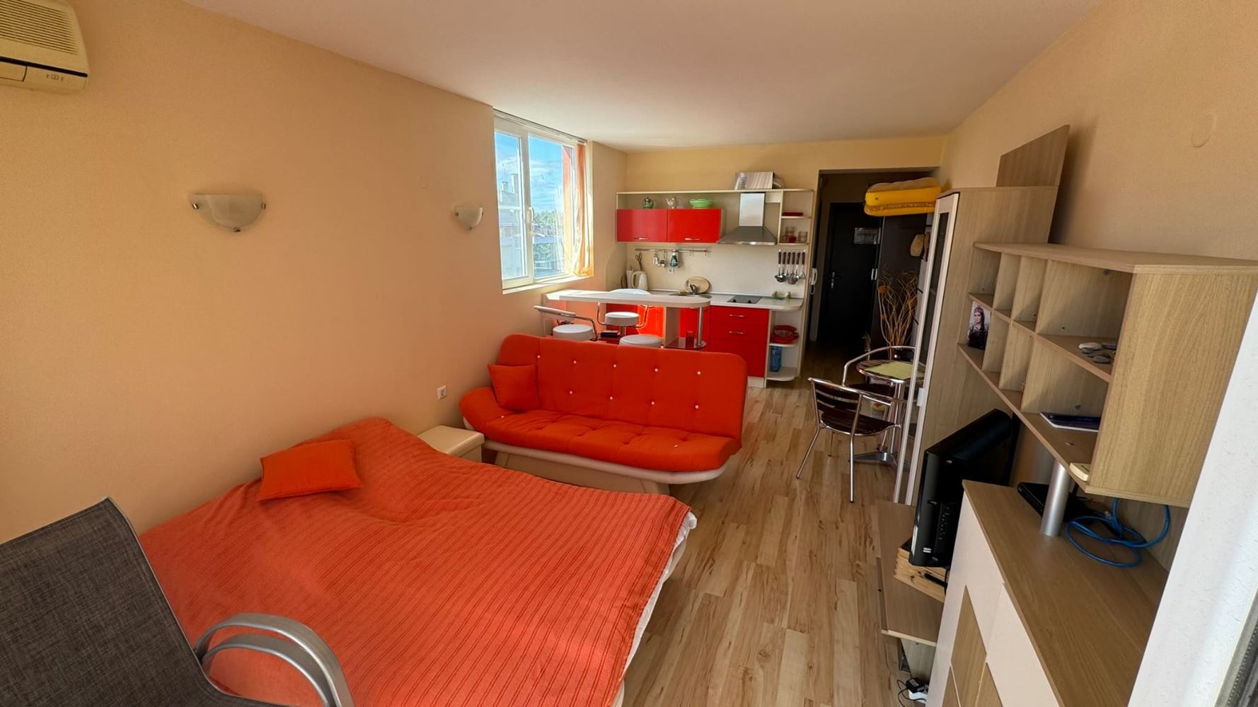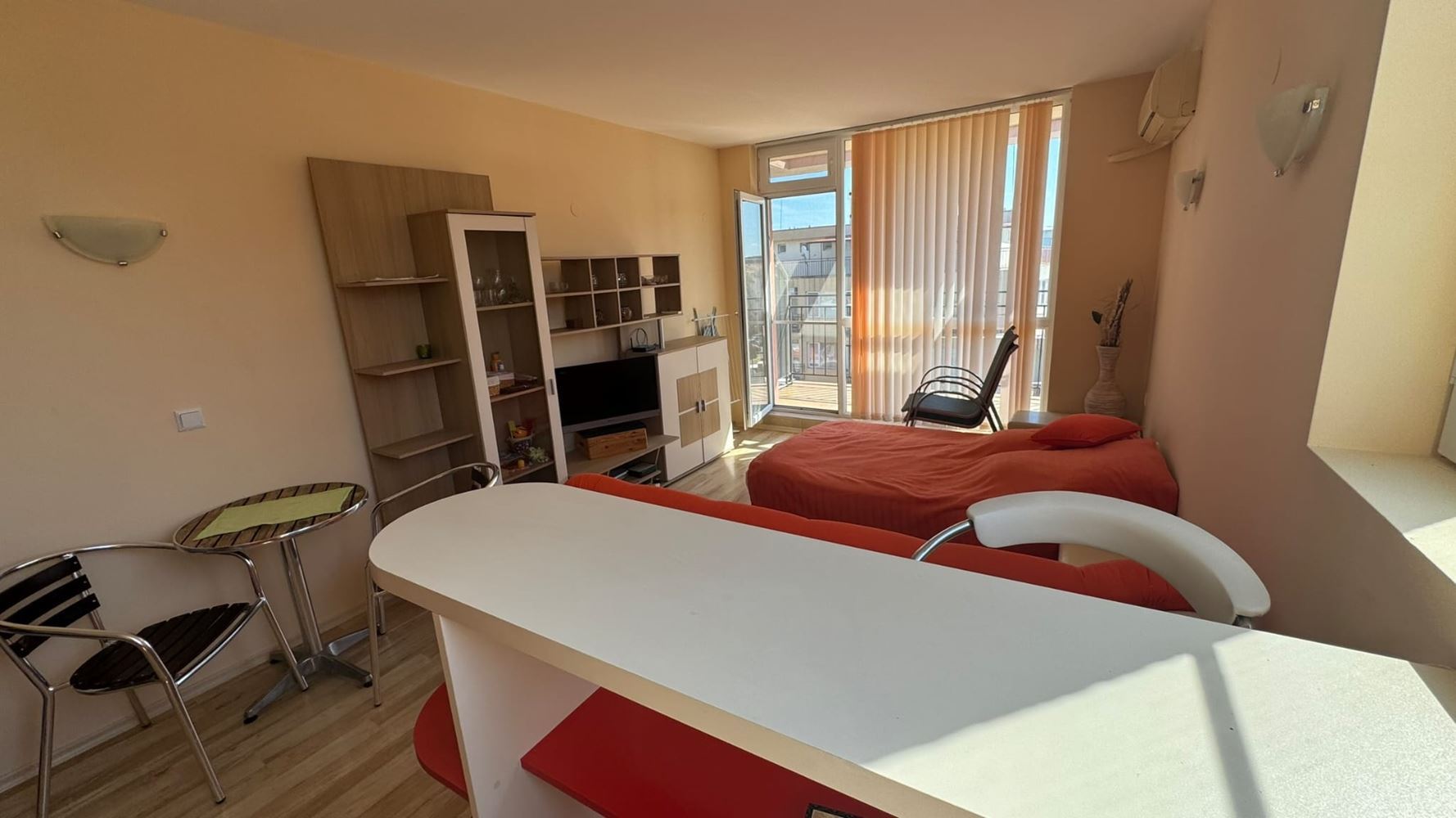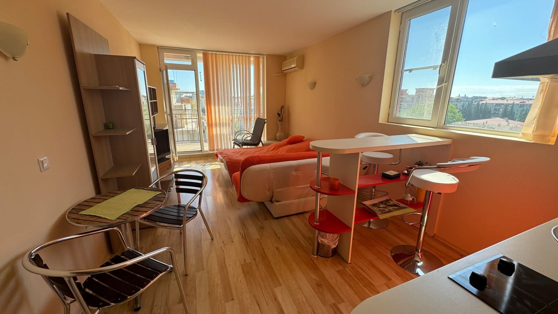 We present to you an excellent spacious studio located in a quiet and well-maintained area of the popular seaside resort of Sunny Beach. This cozy apartment is located on the fifth floor in a modern complex and offers everything you need for comfortable relaxation and year-round living. The studio has a total area of 46 m2 and is intelligently planned to provide maximum convenience and functionality. Entering the home, you will be charmed by a stylish entrance hall leading to a spacious living area that cleverly combines a kitchenette and seating area. The convenient bathroom with toilet completes the comfort of the inhabitants. From the terrace you can enjoy a picturesque view of the swimming pool and the beautiful grounds of the complex.