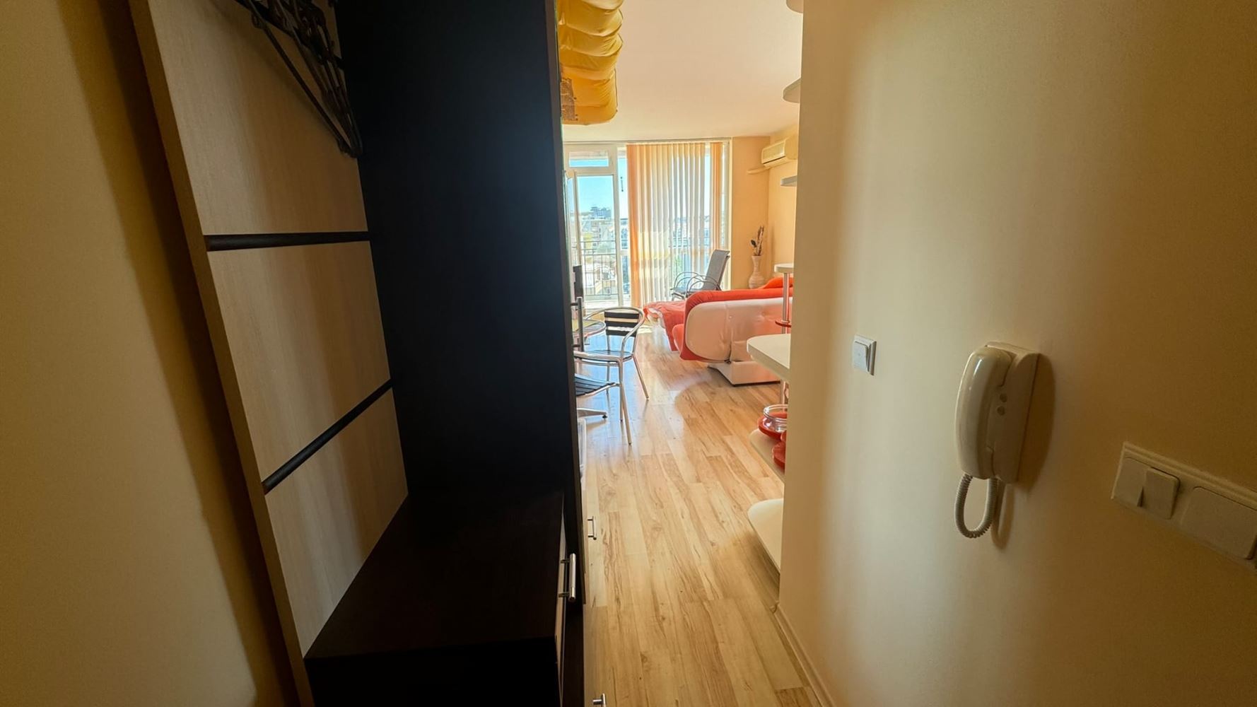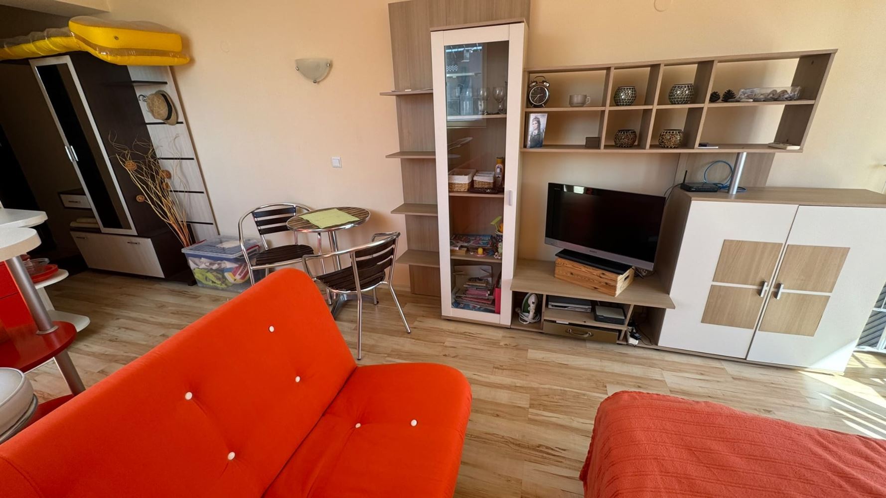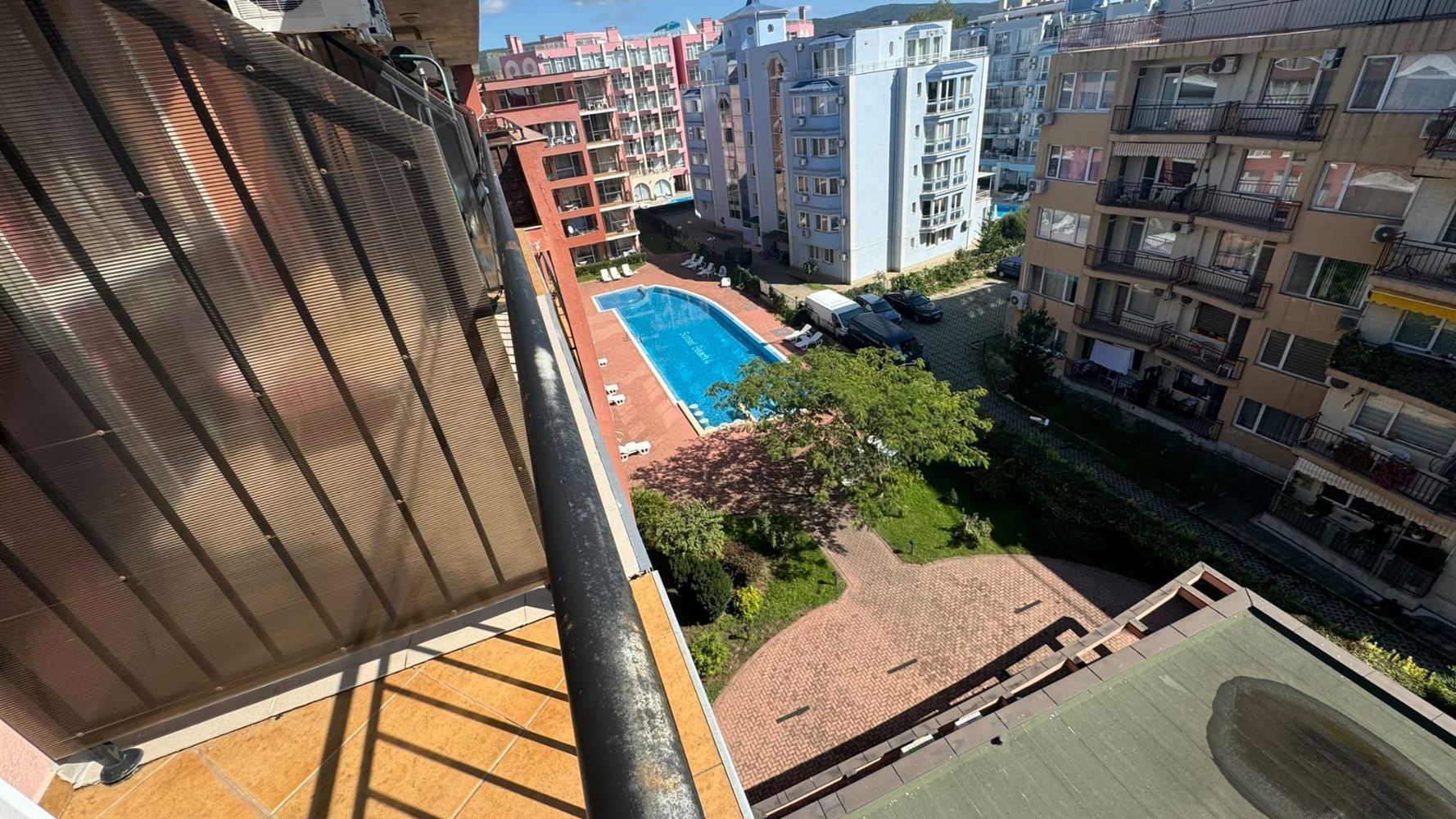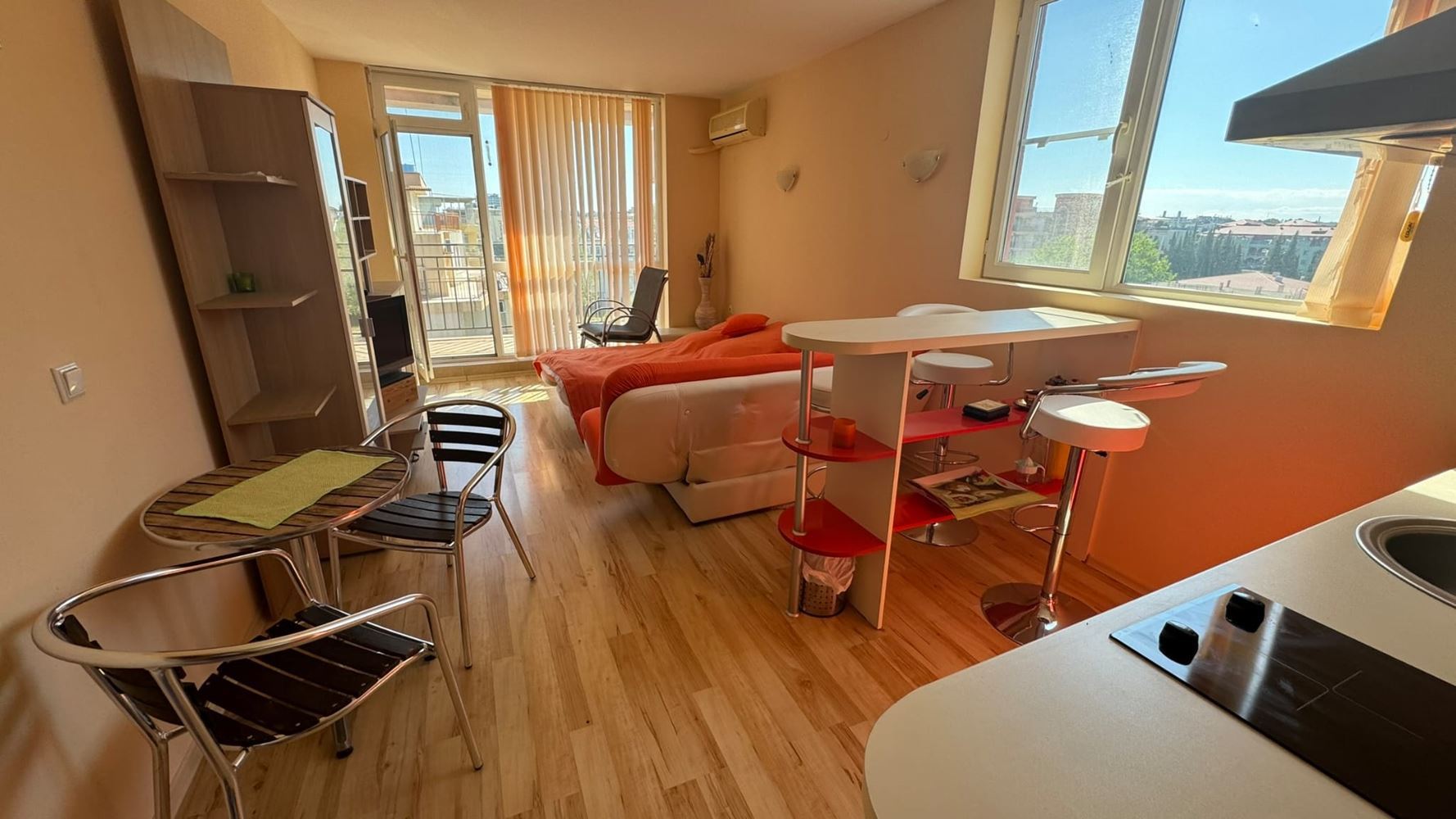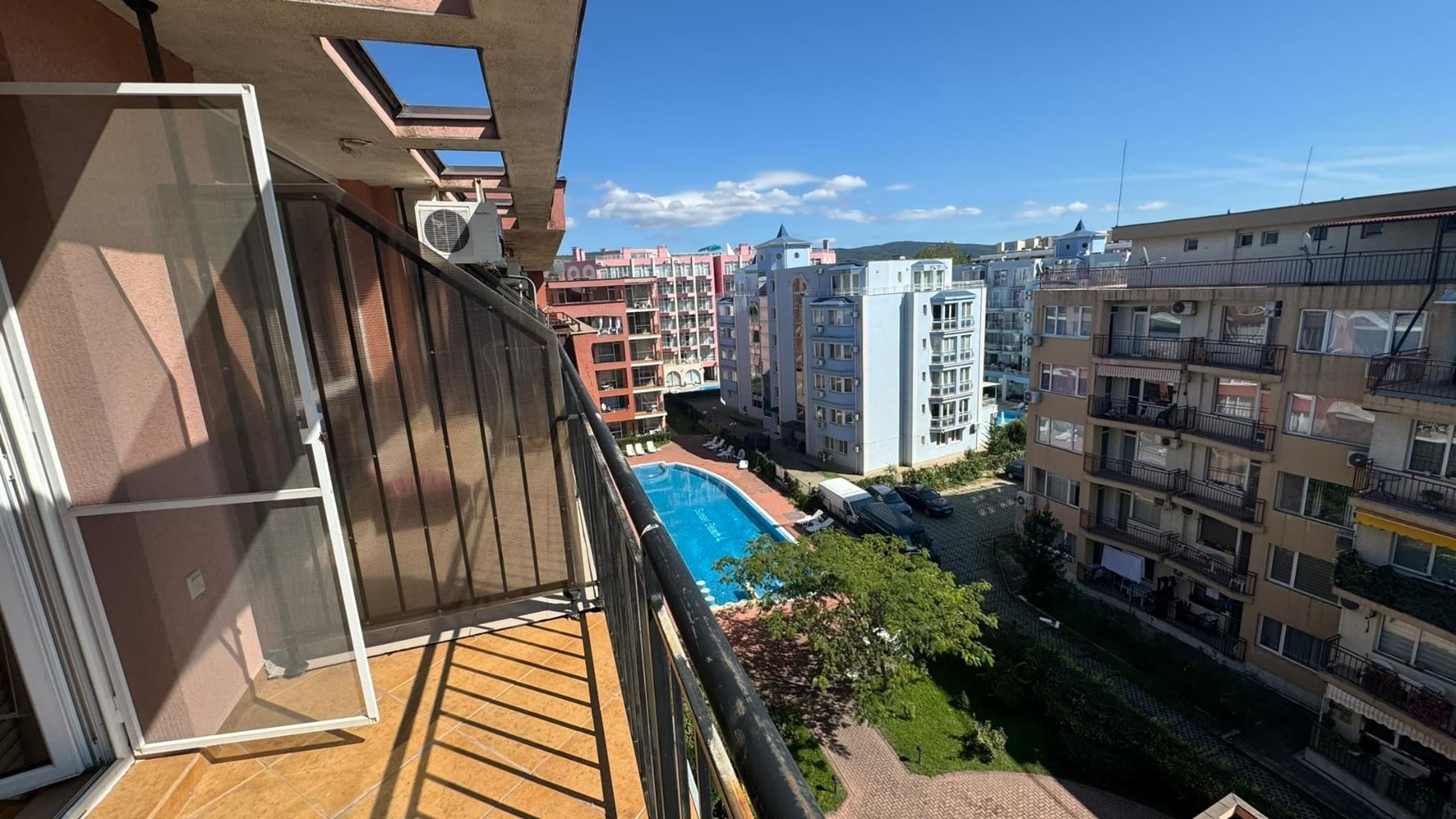 We present to you an excellent spacious studio located in a quiet and well-maintained area of the popular seaside resort of Sunny Beach. This cozy apartment is located on the fifth floor in a modern complex and offers everything you need for comfortable relaxation and year-round living. The studio has a total area of 46 m2 and is intelligently planned to provide maximum convenience and functionality. Entering the home, you will be charmed by a stylish entrance hall leading to a spacious living area that cleverly combines a kitchenette and seating area. The convenient bathroom with toilet completes the comfort of the inhabitants. From the terrace you can enjoy a picturesque view of the swimming pool and the beautiful grounds of the complex.