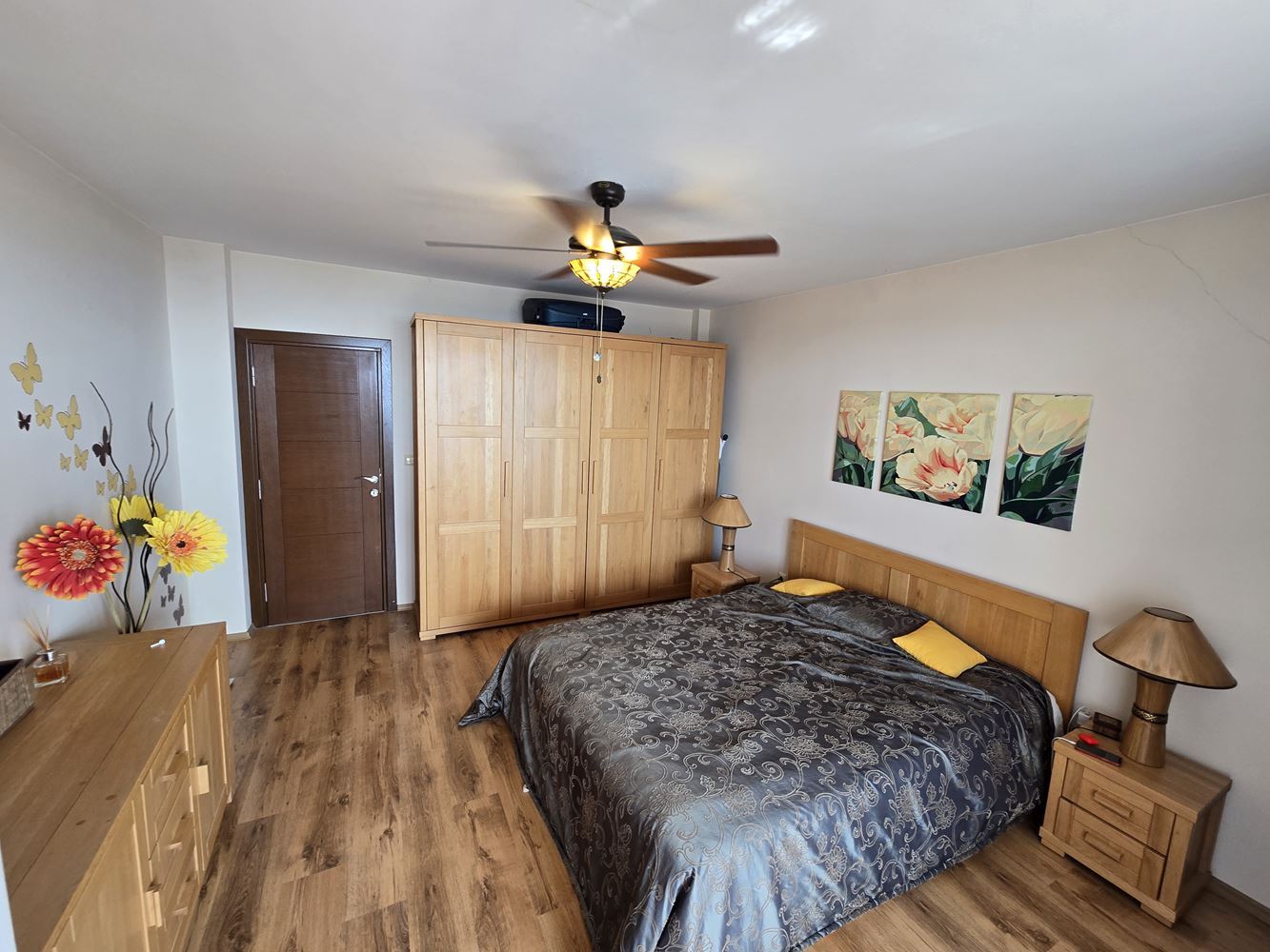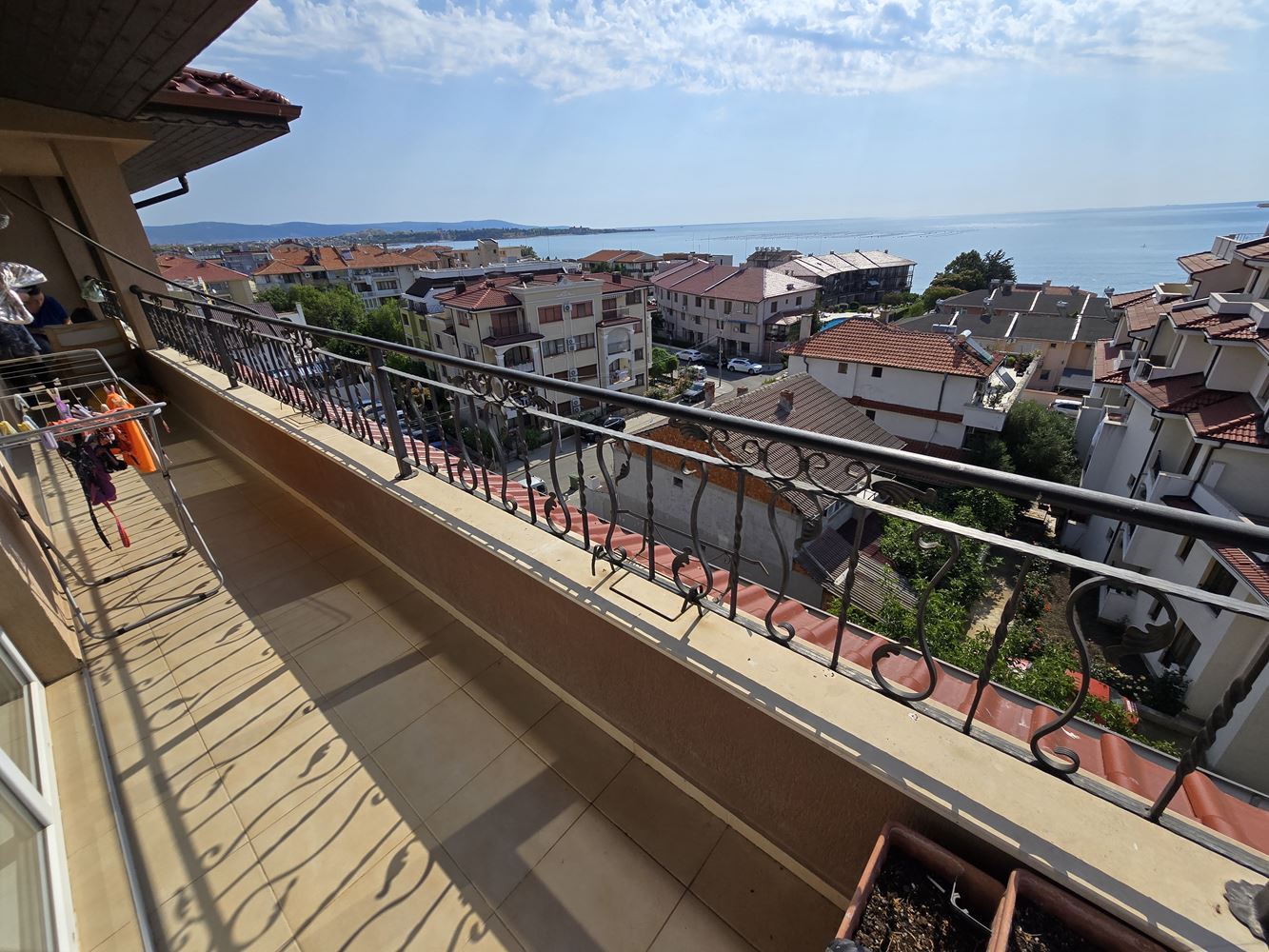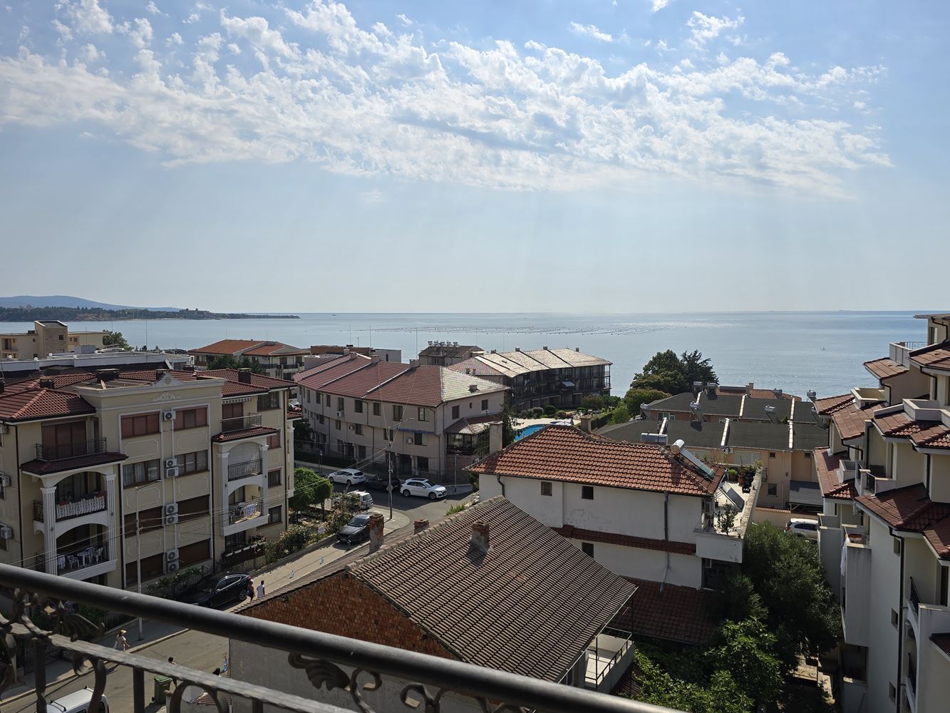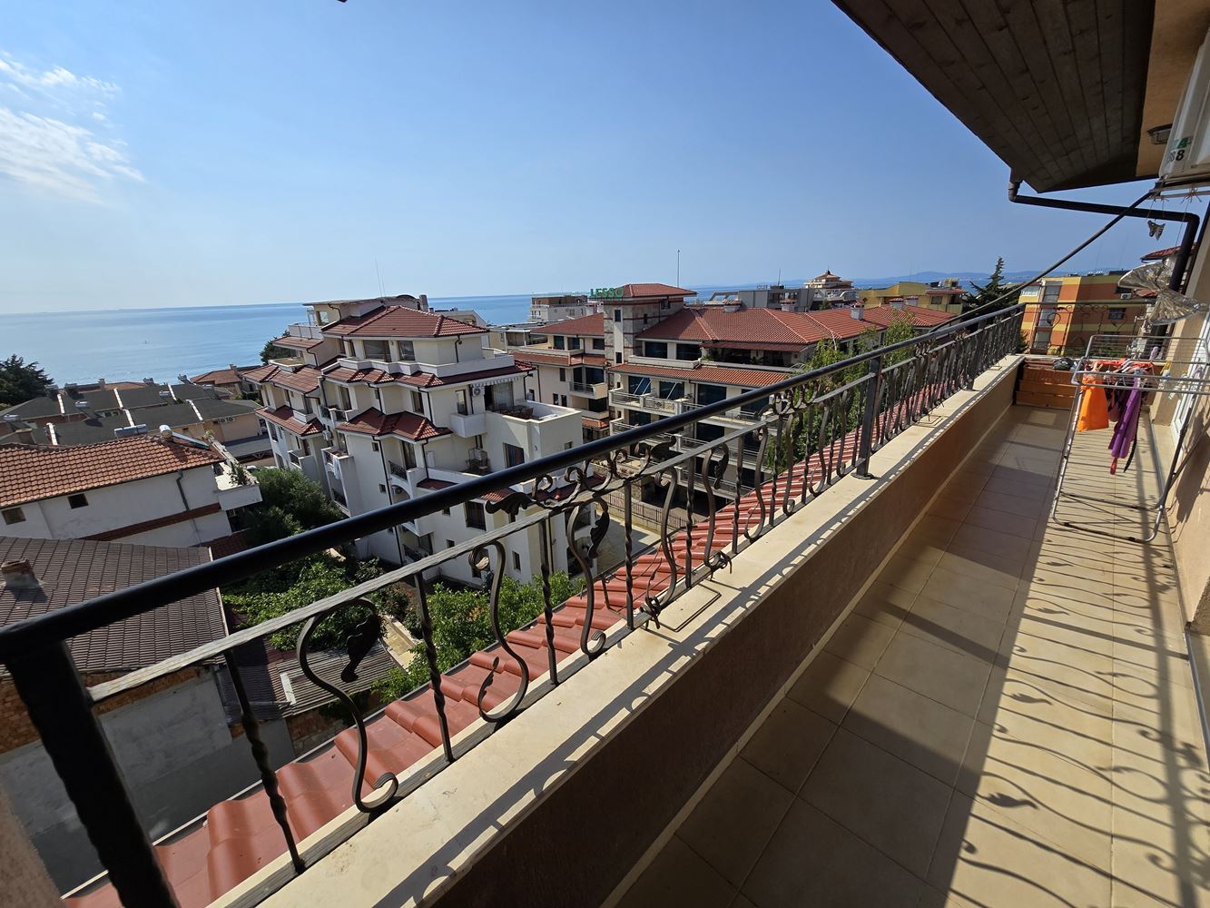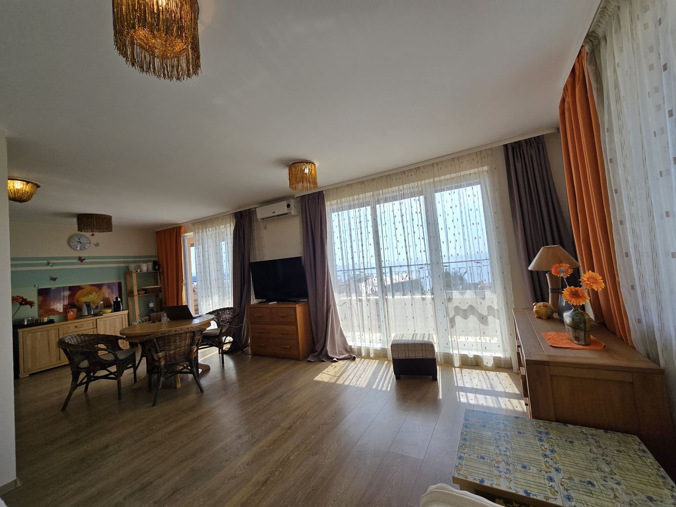 We present to you an exceptional one-bedroom apartment with panoramic sea views, located in the picturesque resort village of Ravda. With a total area of 96 m2, this property combines comfort, elegance, and an incredible location. The apartment consists of a spacious living room with a dining area and a fully equipped kitchen, a cozy bedroom, a modern bathroom, and a balcony offering breathtaking views of the sea waves. All furniture is custom-made from high-quality solid oak, which gives the home a special charm and refined style.