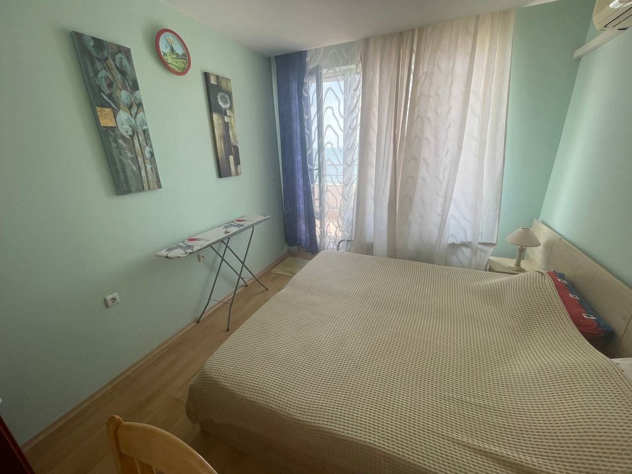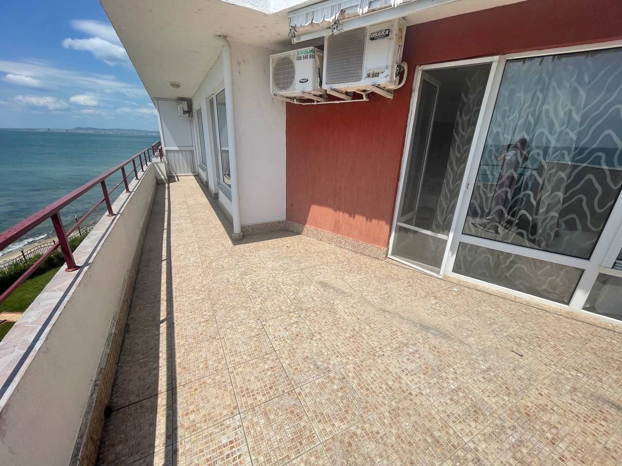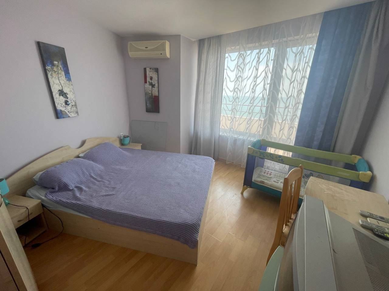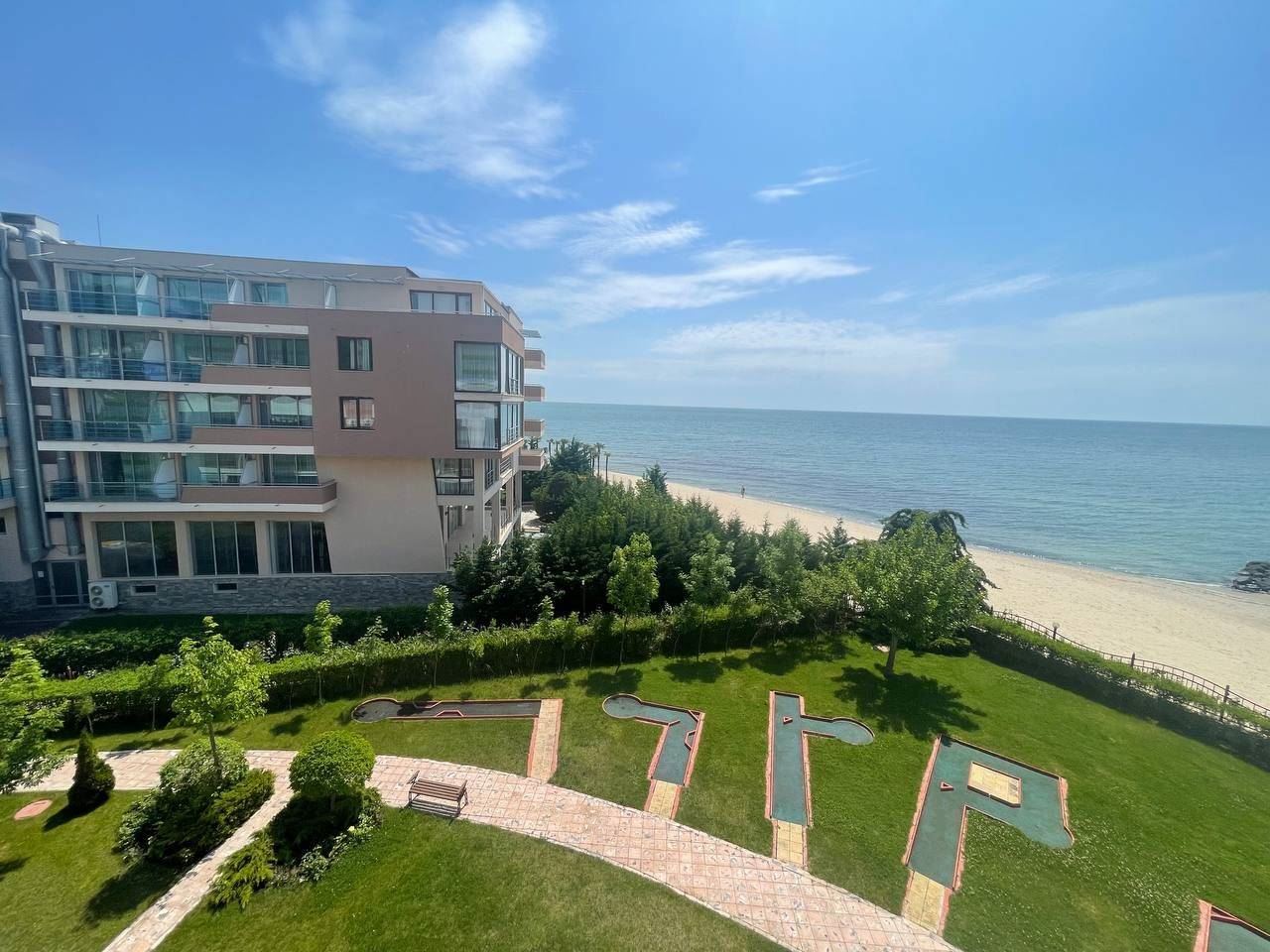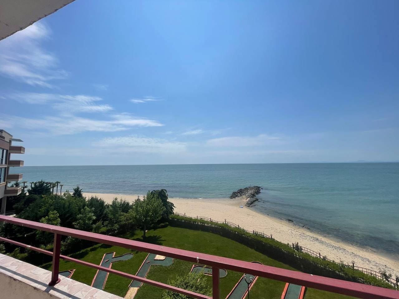 First-class two-bedroom apartment on the first line with direct sea view in the resort Elenite in an excellent family complex. The picturesque resort is a green area at the foot of the mountains and the very sea. A nice private beach is just next to the complex. Comfortable very green and beautiful with a large and well-groomed area, the complex is suitable for permanent residence. It has several swimming pools and recreation areas, playground, play area, supermarket, hair salon, security, parking. The spacious two bedroom apartment is located on the fifth floor of the building. The apartment has a surface of 86 m2 and is for sale fully furnished and equipped. It consists of an entrance hall, a large living room with kitchen area, two bedrooms, a bathroom and a big balcony with beautiful sea view.