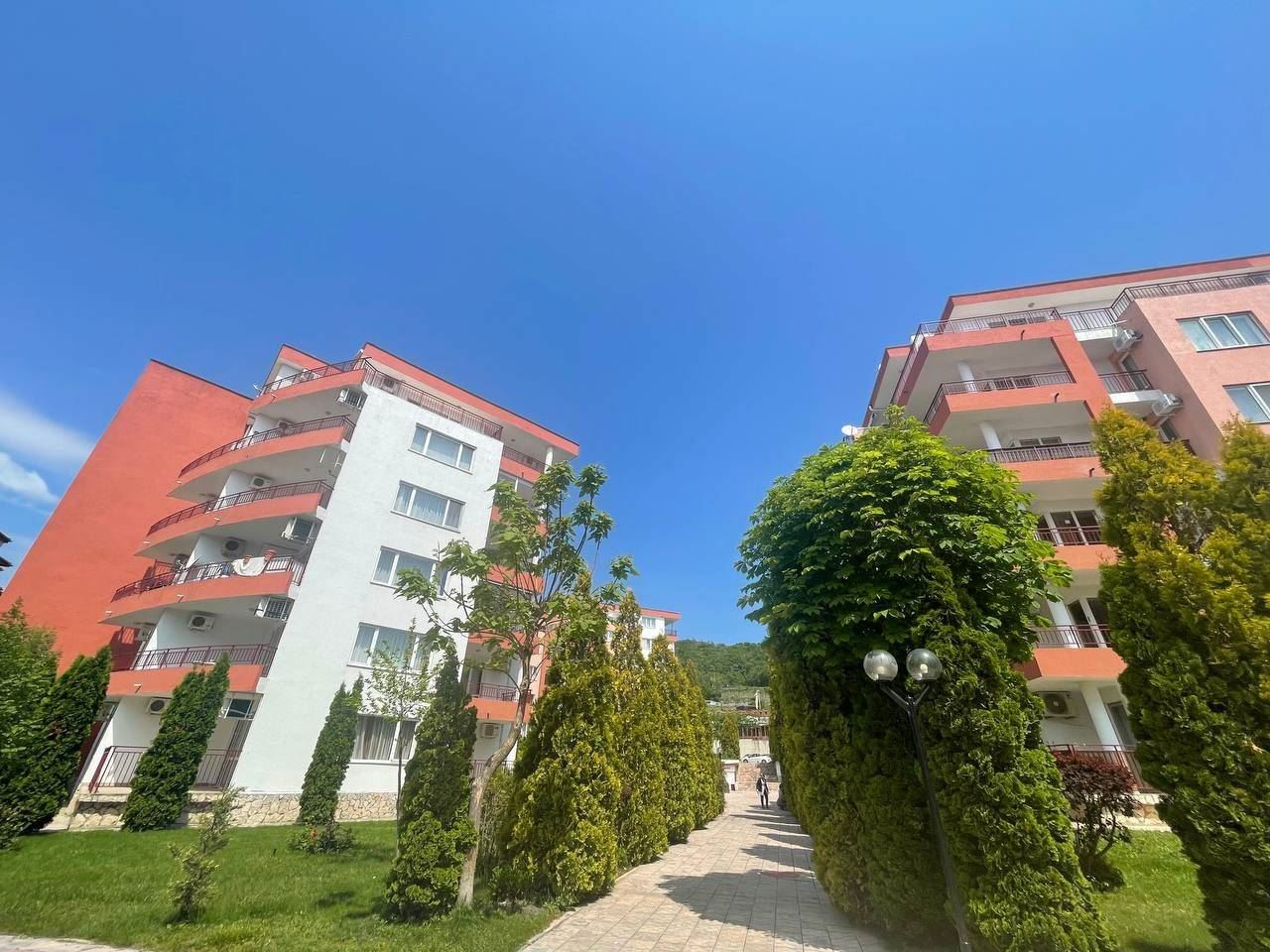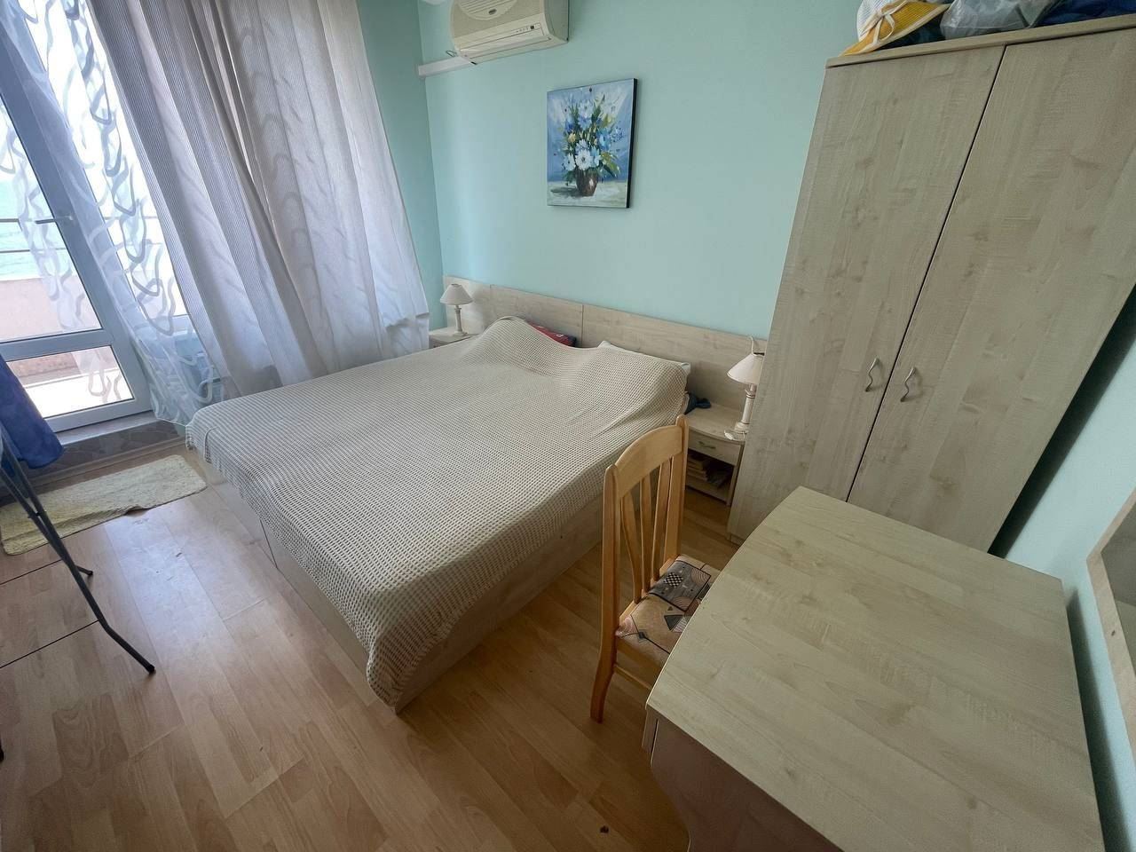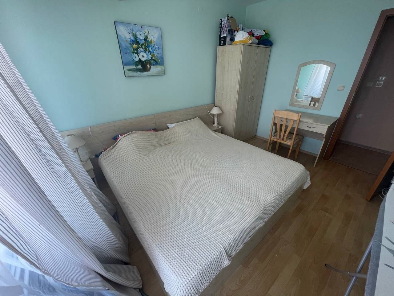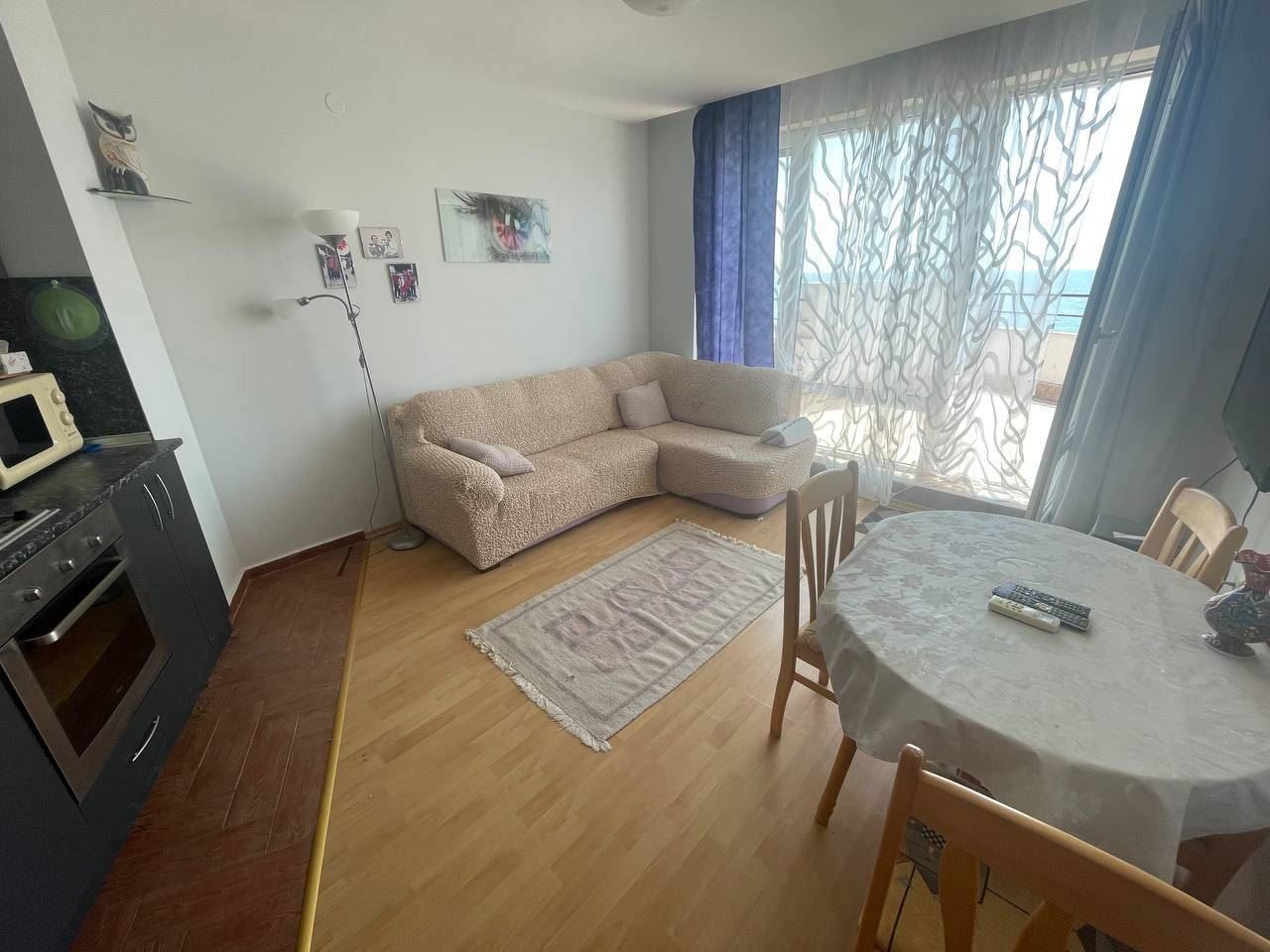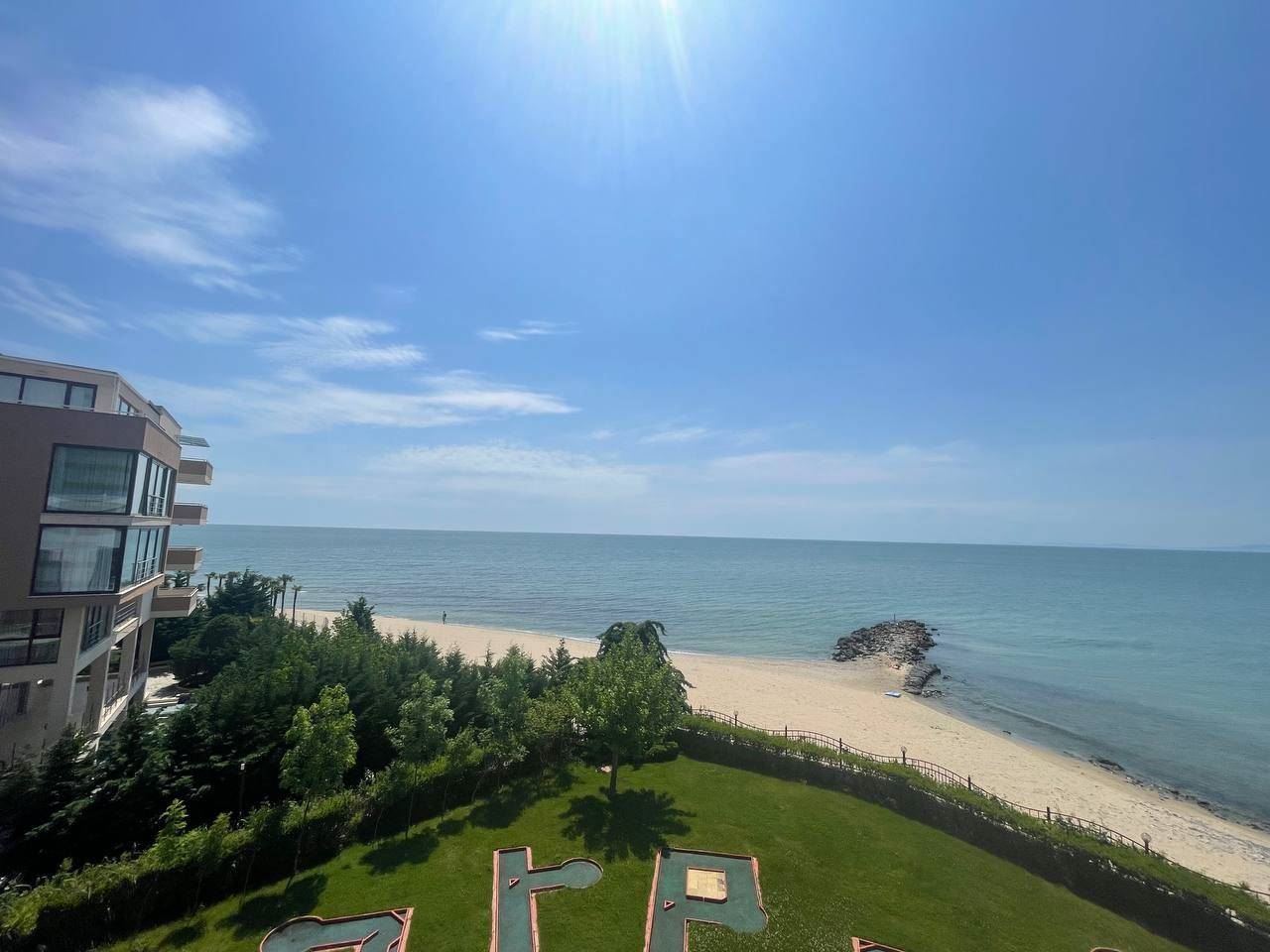 First-class two-bedroom apartment on the first line with direct sea view in the resort Elenite in an excellent family complex. The picturesque resort is a green area at the foot of the mountains and the very sea. A nice private beach is just next to the complex. Comfortable very green and beautiful with a large and well-groomed area, the complex is suitable for permanent residence. It has several swimming pools and recreation areas, playground, play area, supermarket, hair salon, security, parking. The spacious two bedroom apartment is located on the fifth floor of the building. The apartment has a surface of 86 m2 and is for sale fully furnished and equipped. It consists of an entrance hall, a large living room with kitchen area, two bedrooms, a bathroom and a big balcony with beautiful sea view.