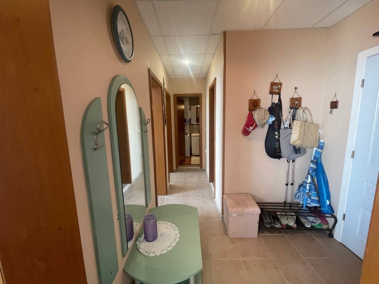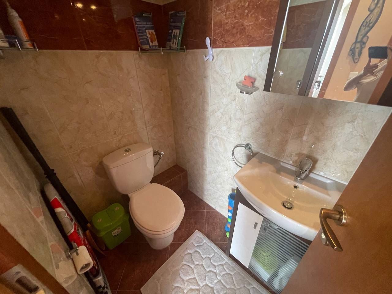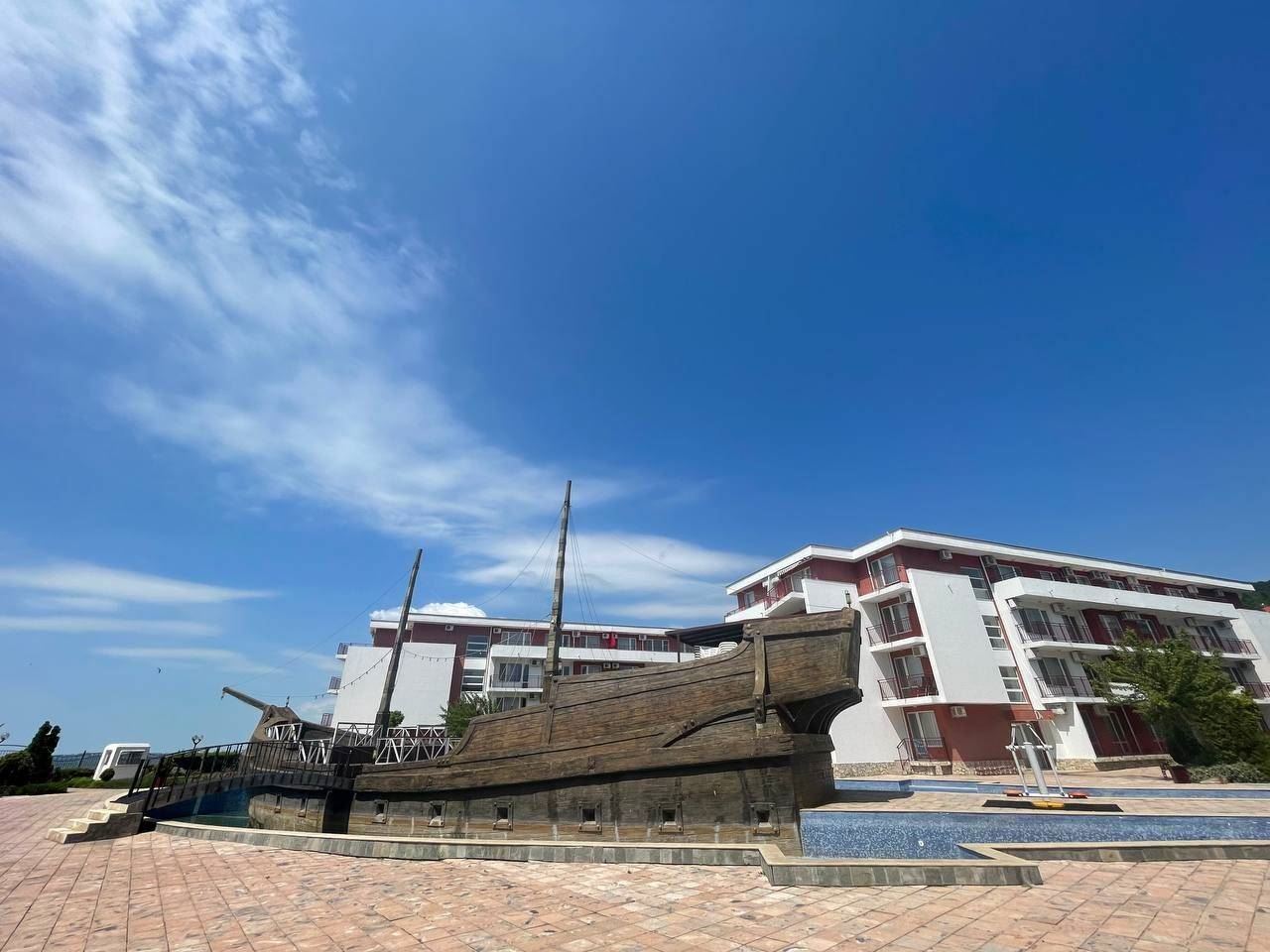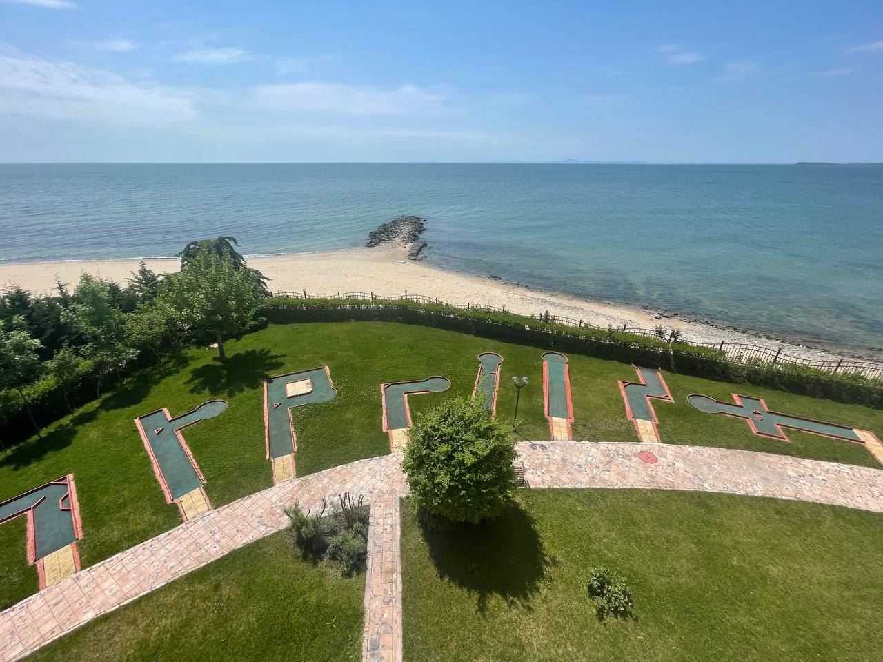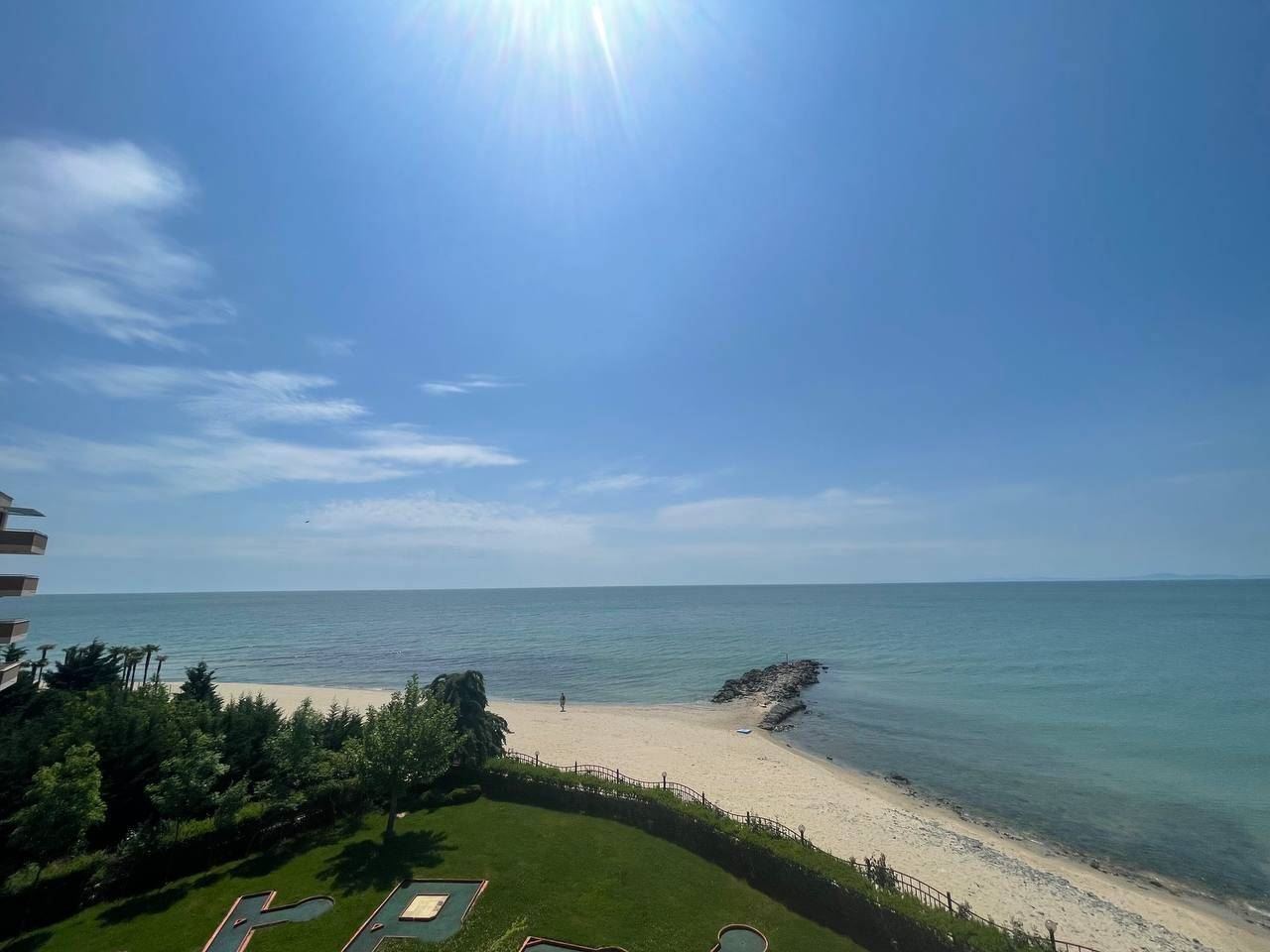 First-class two-bedroom apartment on the first line with direct sea view in the resort Elenite in an excellent family complex. The picturesque resort is a green area at the foot of the mountains and the very sea. A nice private beach is just next to the complex. Comfortable very green and beautiful with a large and well-groomed area, the complex is suitable for permanent residence. It has several swimming pools and recreation areas, playground, play area, supermarket, hair salon, security, parking. The spacious two bedroom apartment is located on the fifth floor of the building. The apartment has a surface of 86 m2 and is for sale fully furnished and equipped. It consists of an entrance hall, a large living room with kitchen area, two bedrooms, a bathroom and a big balcony with beautiful sea view.