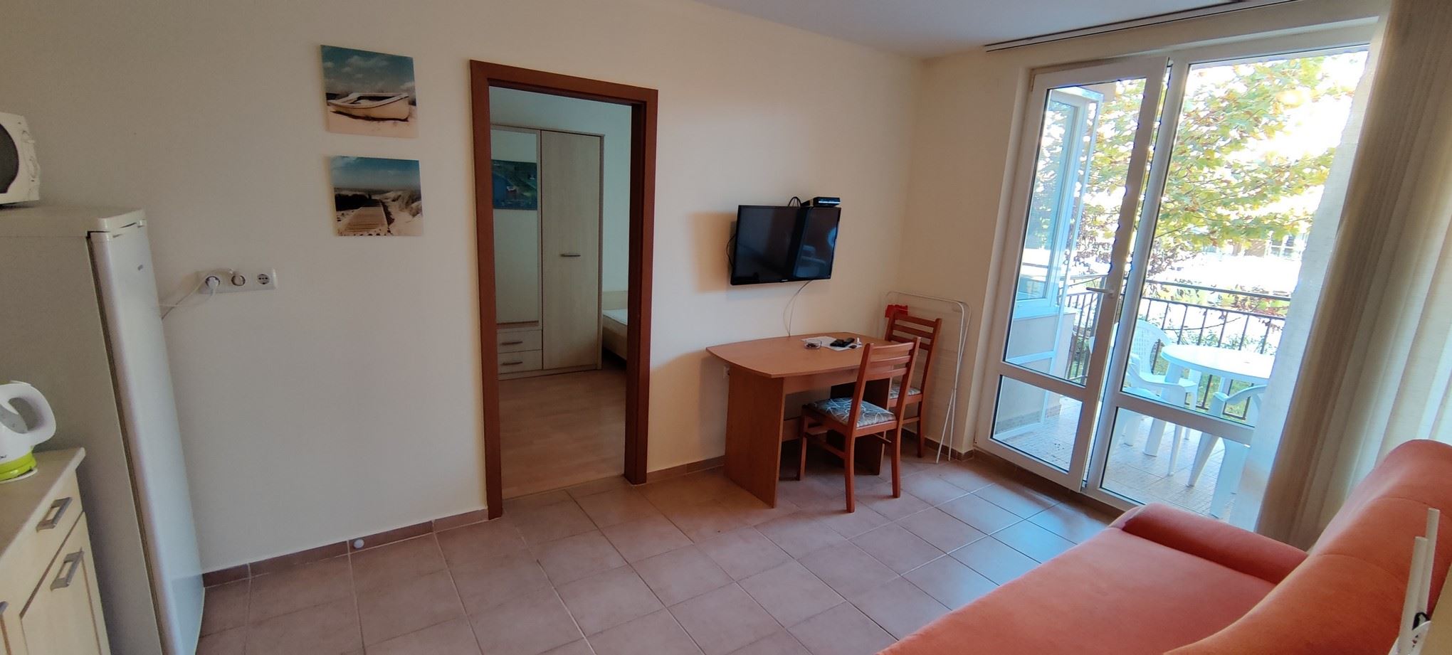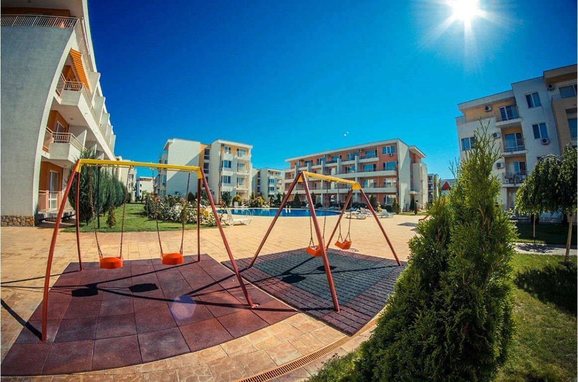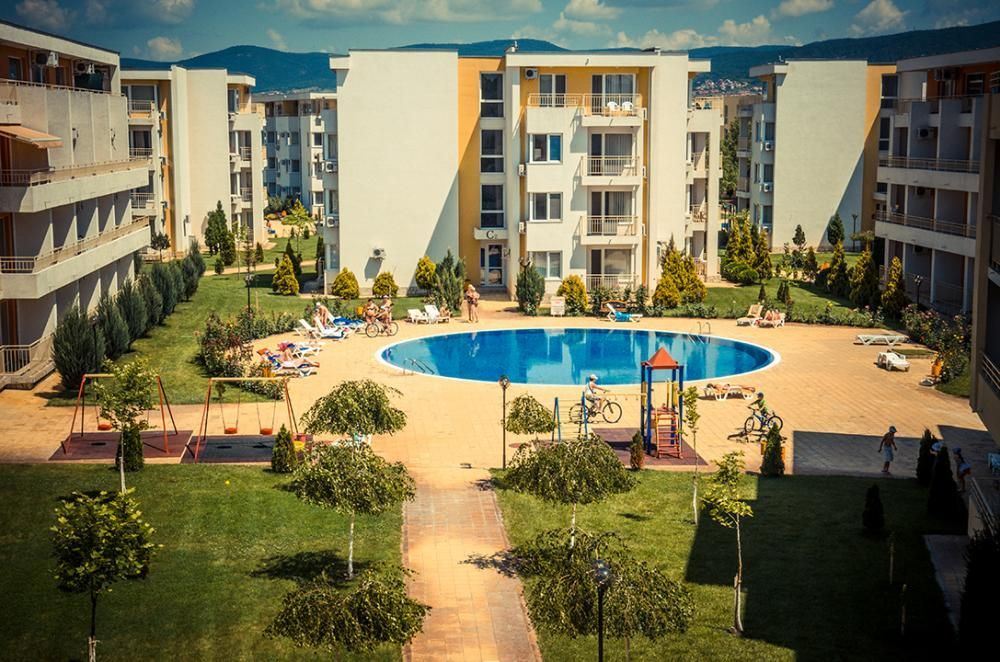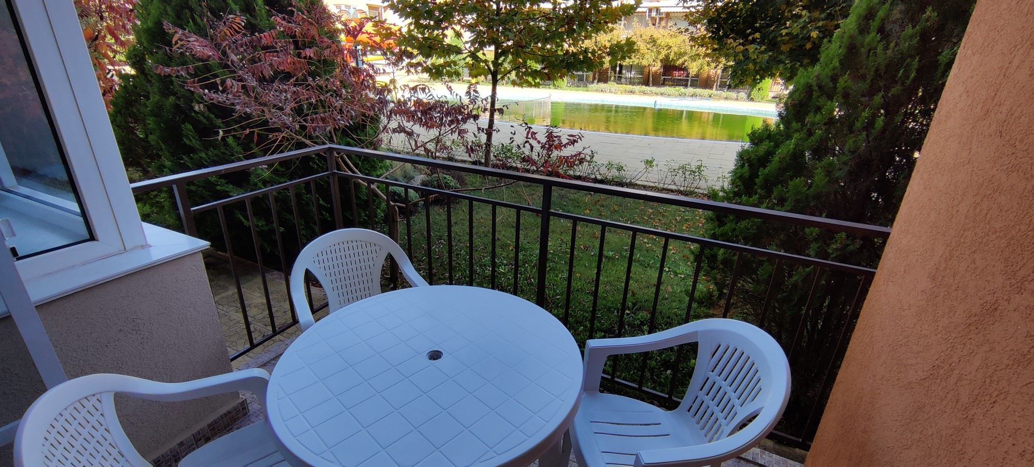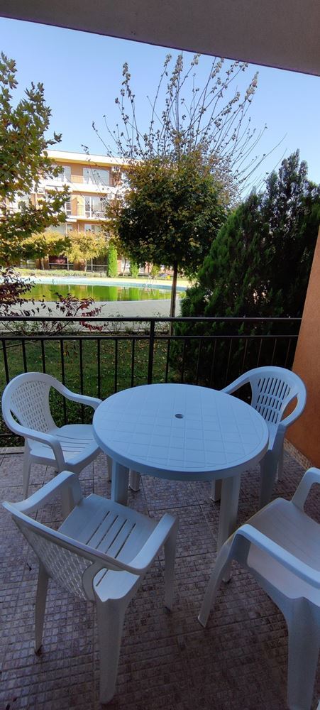 We offer to consider a flat in a unique complex with a large territory and its own infrastructure. The complex is located near the central Aquapark. This is where most people choose to live all year round, as there is a large supermarket close by. The large landscaped and protected area has all the necessary infrastructure including swimming pools, golf course, fitness equipment, children's playgrounds, restaurants, shops, supermarket, tennis courts, football field and much more. The complex also has a medical office. The flat of 44 m2 is located on the ground floor. The property is sold furnished and equipped. Overlooking the swimming pool.