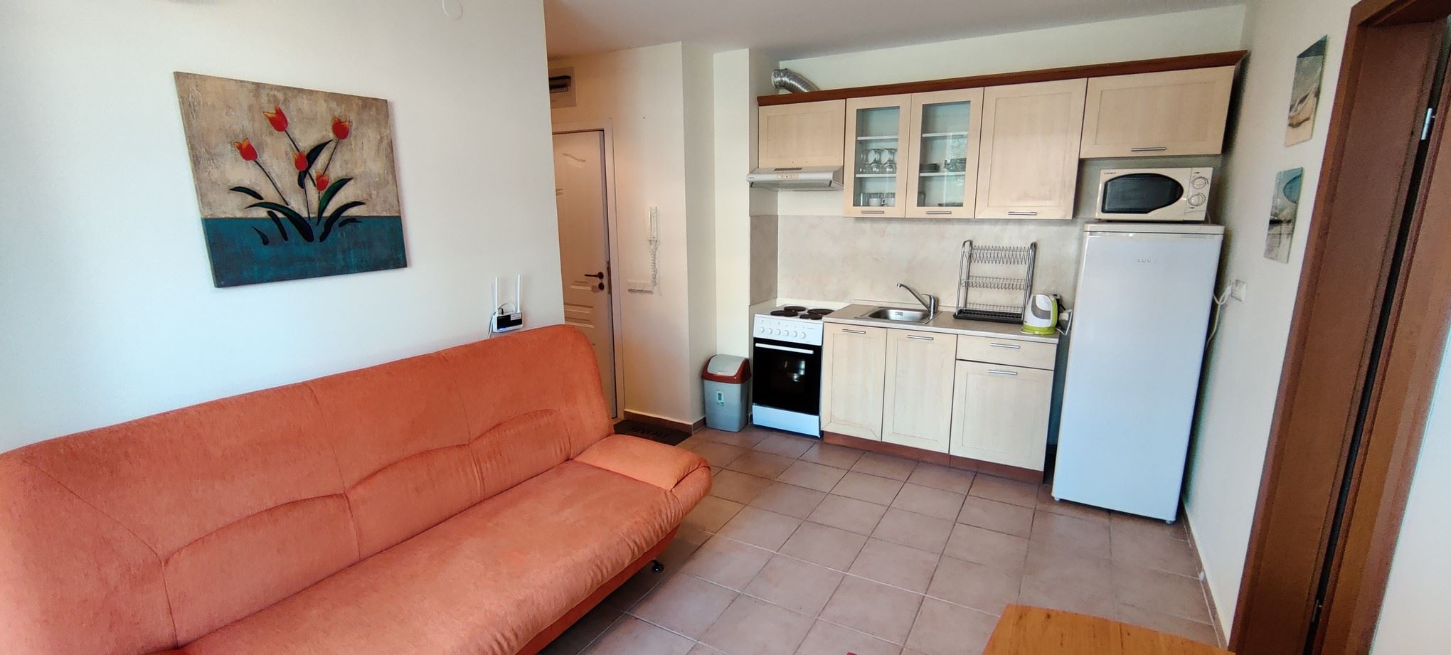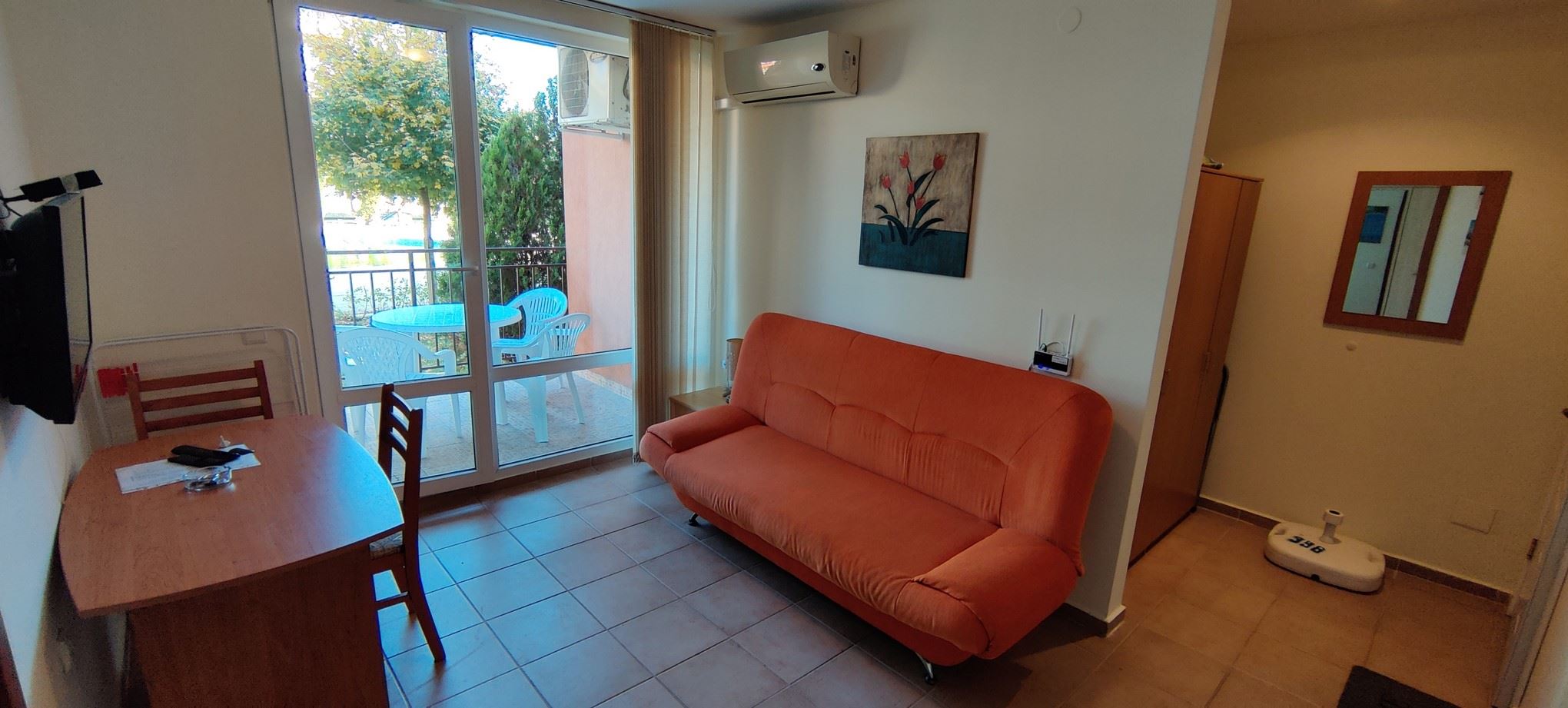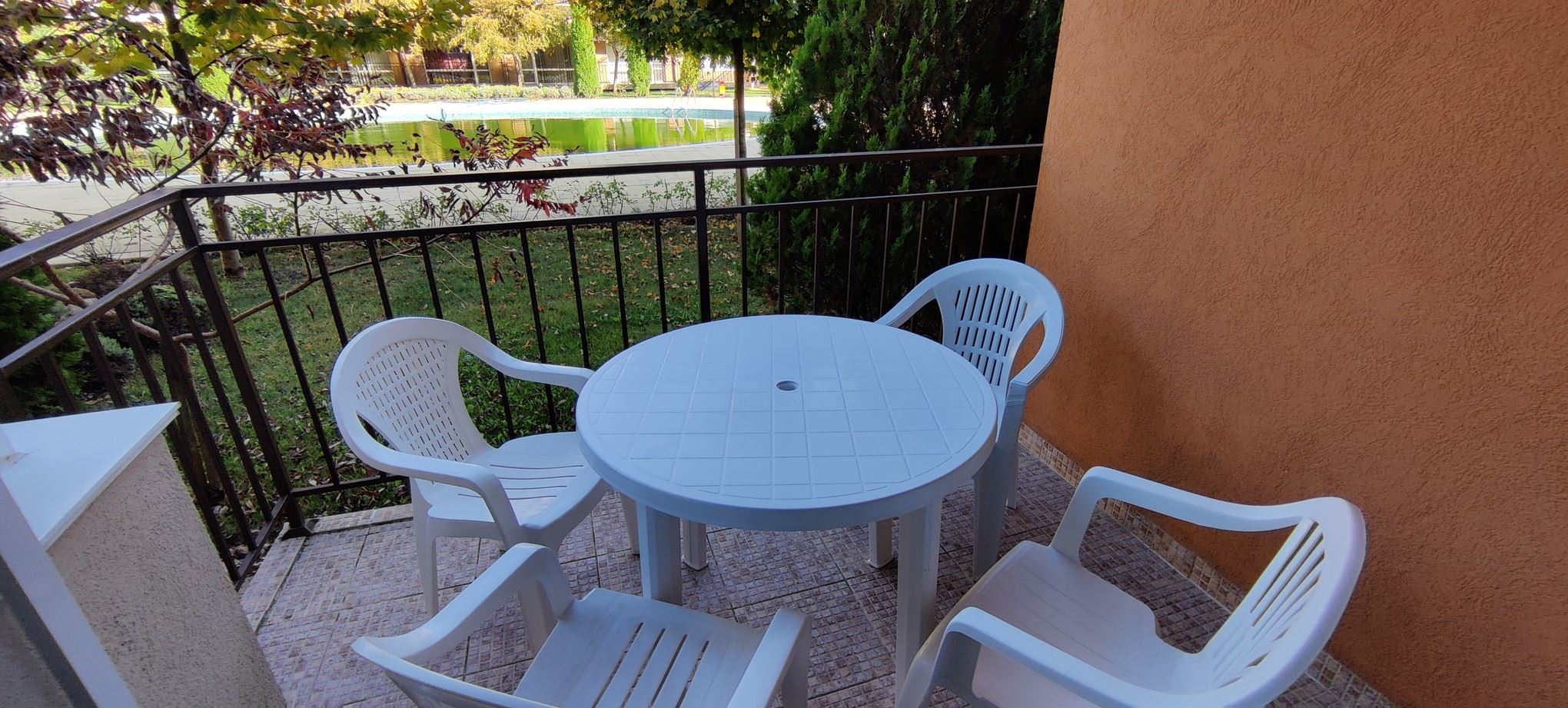 We offer to consider a flat in a unique complex with a large territory and its own infrastructure. The complex is located near the central Aquapark. This is where most people choose to live all year round, as there is a large supermarket close by. The large landscaped and protected area has all the necessary infrastructure including swimming pools, golf course, fitness equipment, children's playgrounds, restaurants, shops, supermarket, tennis courts, football field and much more. The complex also has a medical office. The flat of 44 m2 is located on the ground floor. The property is sold furnished and equipped. Overlooking the swimming pool.