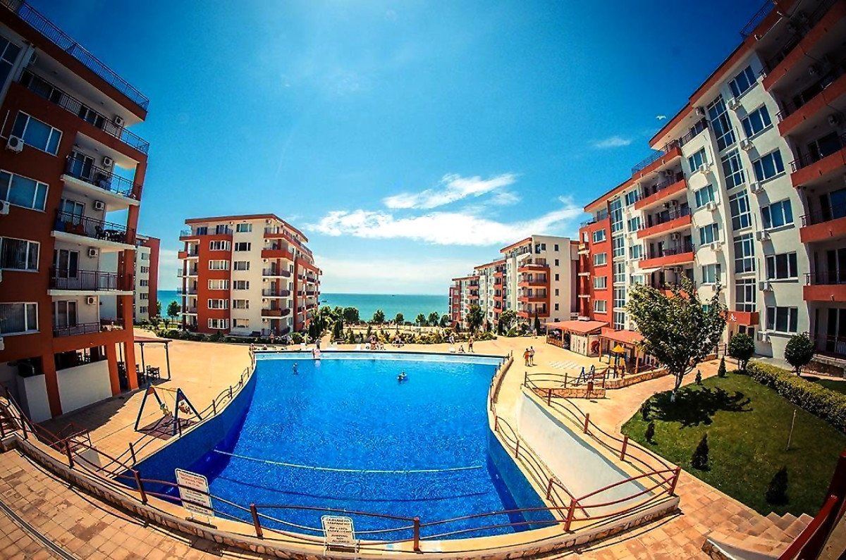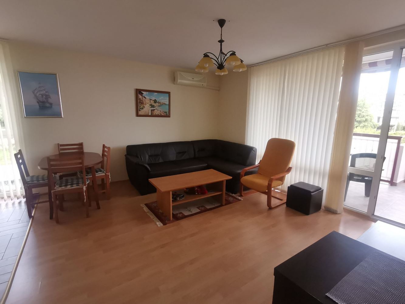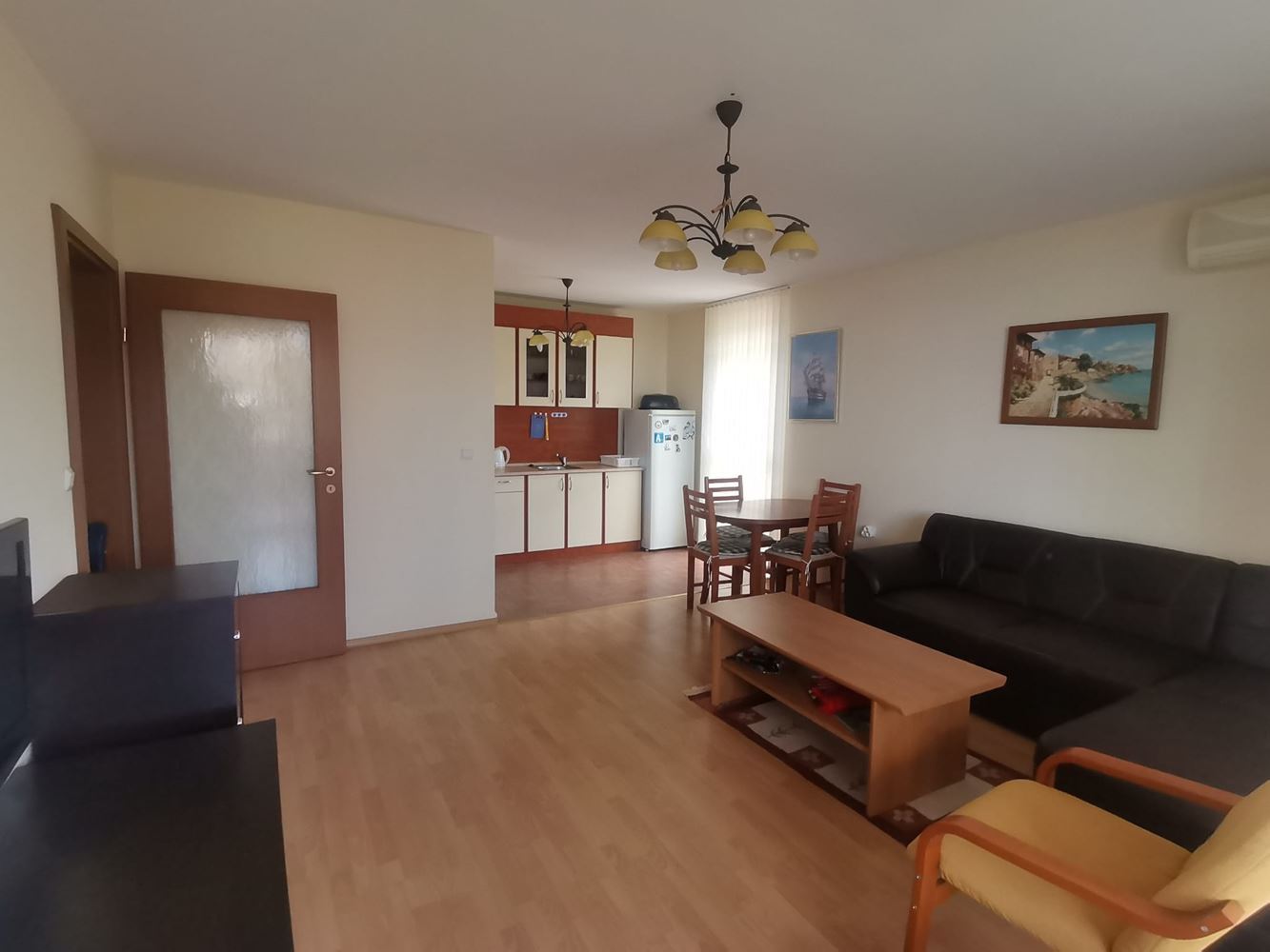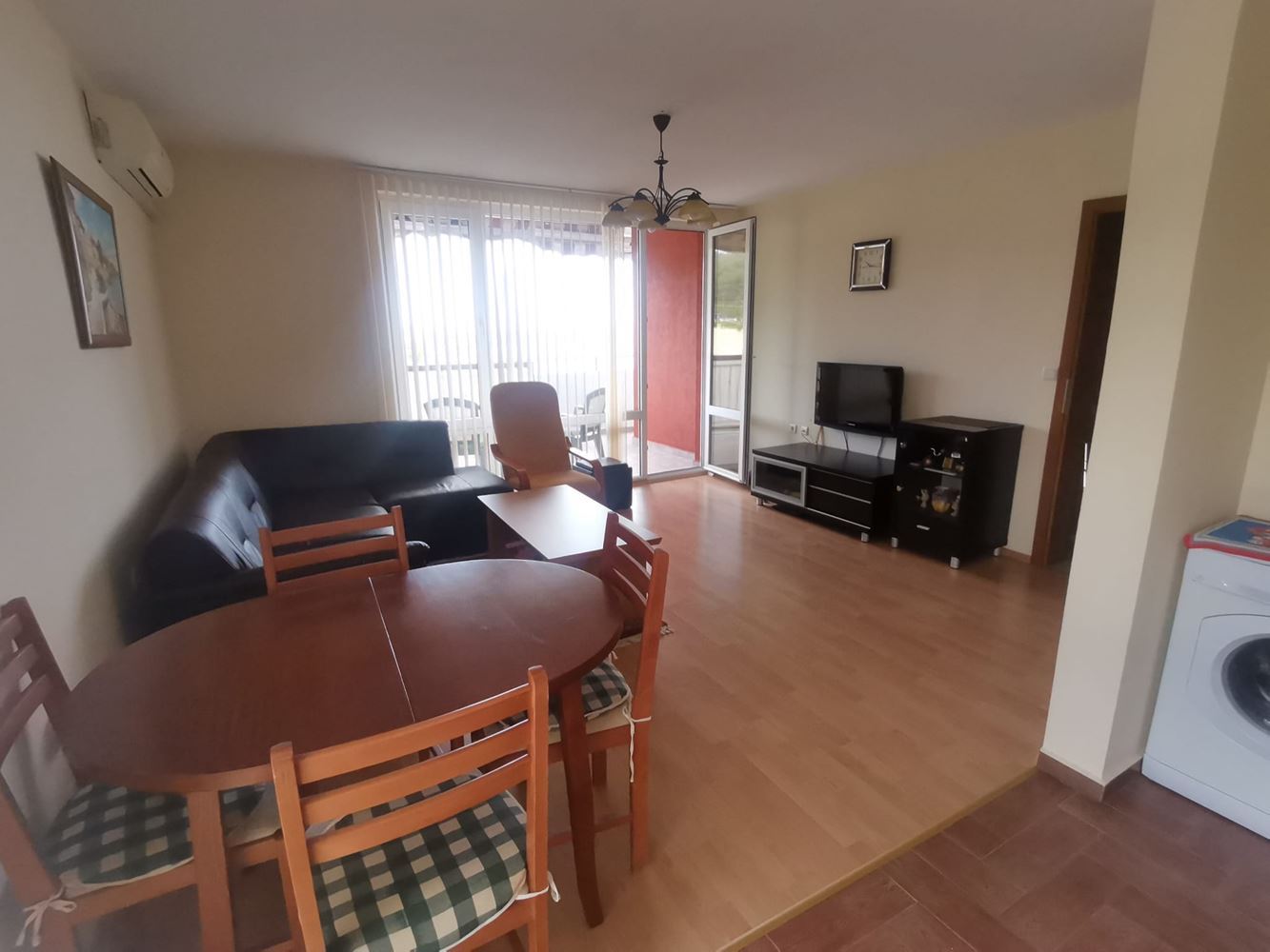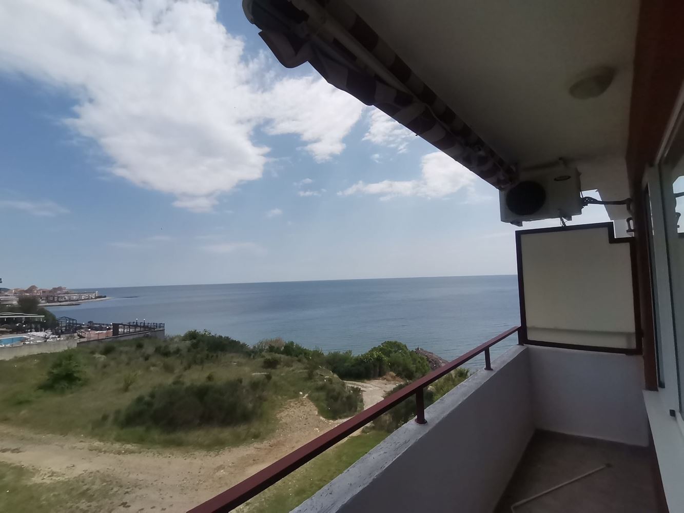 One bedroom flat with sea view in a luxury location near the mountains and the sea. The flat is fully furnished and ready to move in. The complex is located in a prime beachfront location, 50m from the sea. The magical combination of mountain and sea air makes this place unique and the climate extremely favourable. There is a rich infrastructure- four restaurants with Bulgarian and European cuisine, bars and cafes, a supermarket, fitness centres, sauna, internet clubs, a beauty salon, a massage room, a medical centre, a guarded parking area, 18 swimming pools for children and adults including artificial wave pools and Jacuzzi. This 73m2 flat is located on the third floor. It consists of a living room with kitchen, bedroom, bathroom with toilet and a balcony. The apartment is fully furnished and equipped.