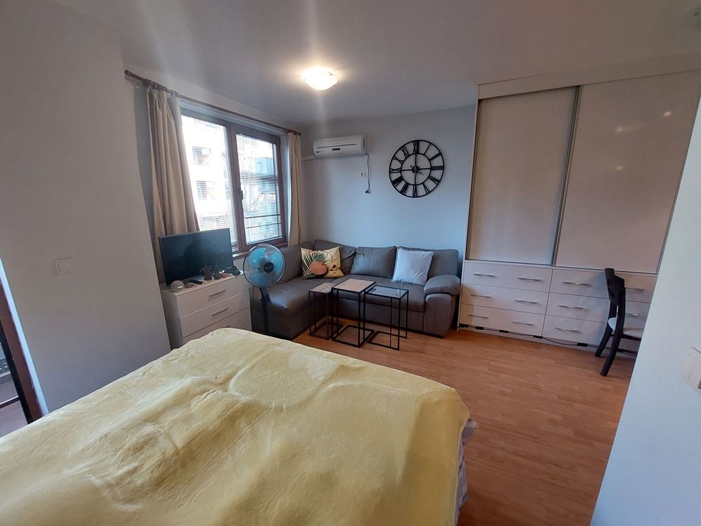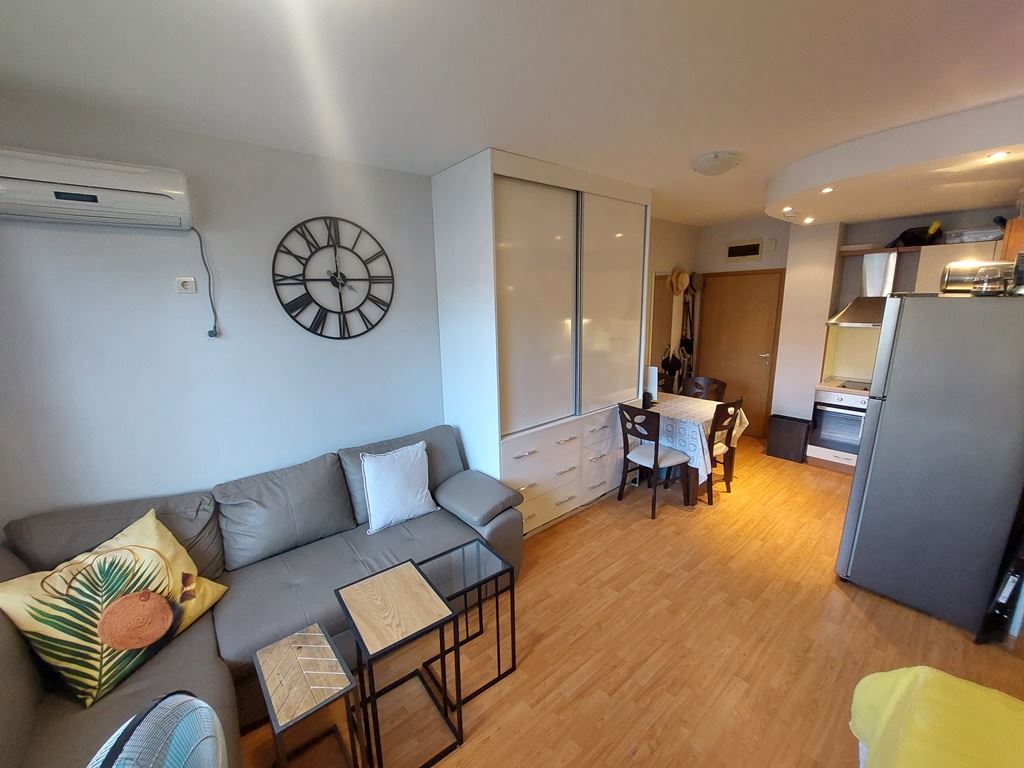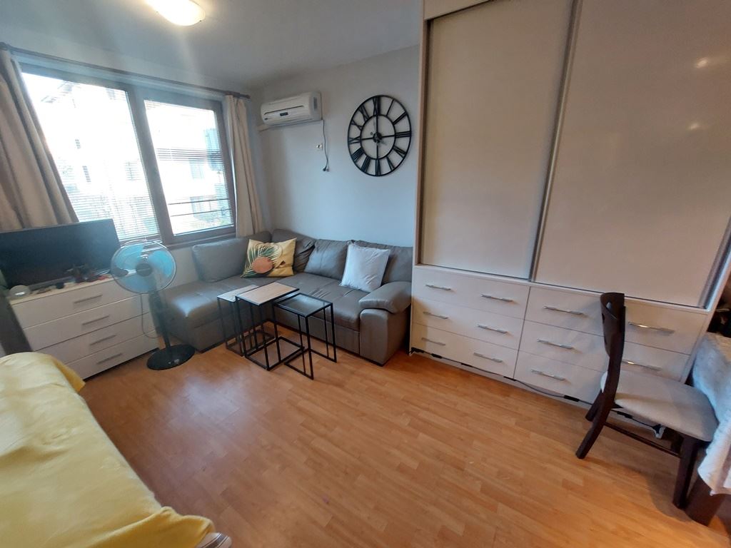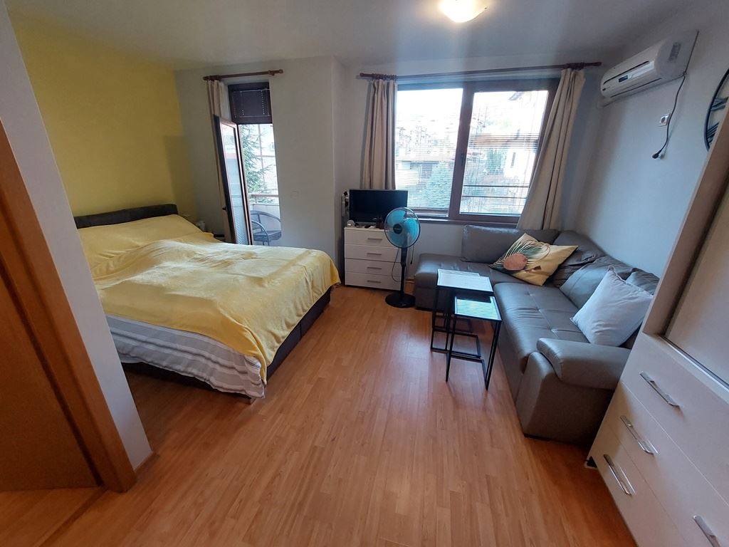 Large studio in St. Vlas, in a magnificent complex, located on the beachfront. The flat is a studio of 48 m2 and is located on the third floor. There is a lift. It consists of a spacious living room-kitchen with seating and dining area, bathroom with WC and a balcony overlooking the landscaped gardens of this charming complex. The complex has eight swimming pools one of which is covered, shops, spa salons, its own four-level free parking. The property is sold fully equipped and furnished.