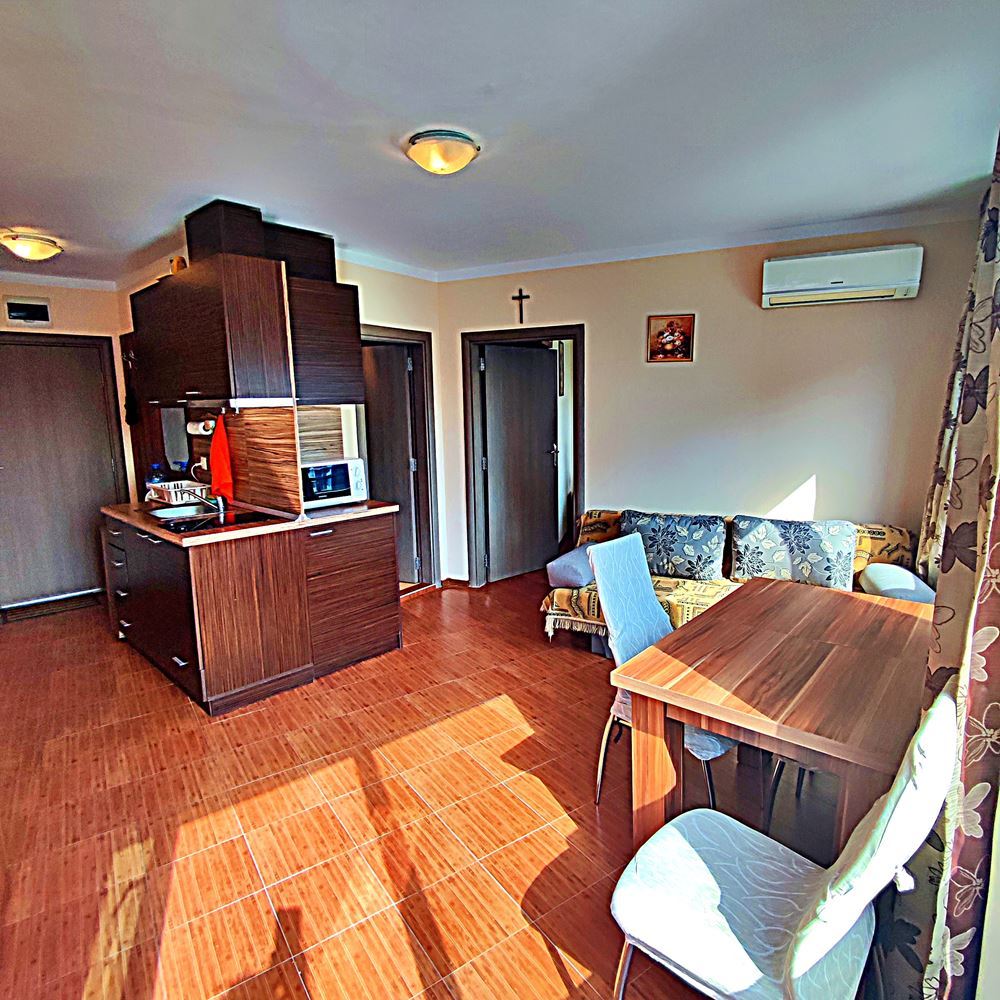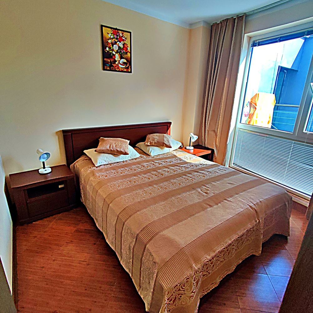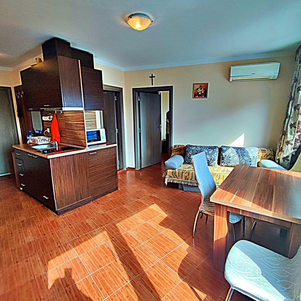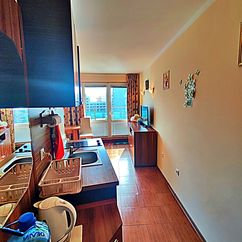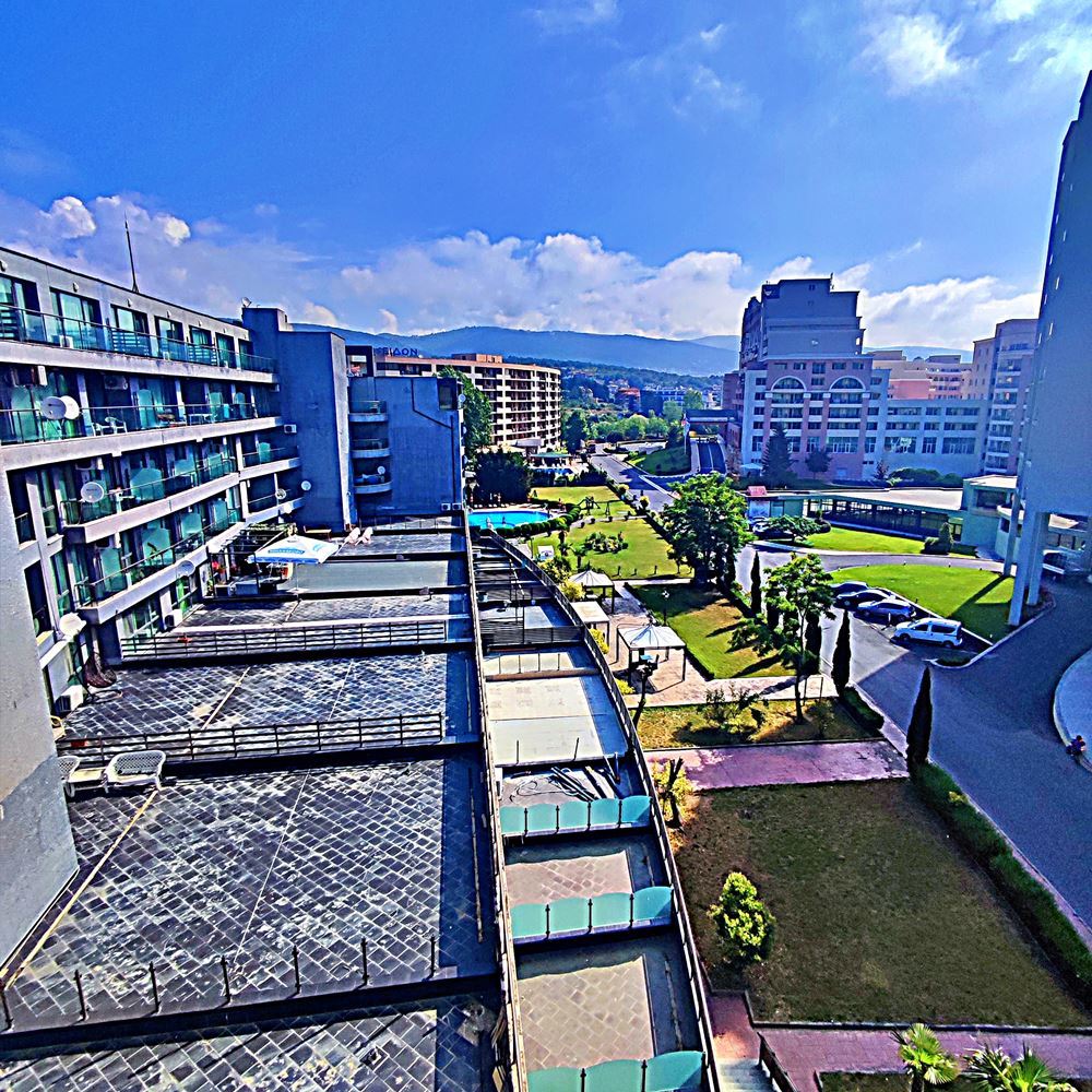 One bedroom furnished apartment in a beautiful complex with commercial premises located in the northern part of the resort of Sunny Beach, two minutes walk from the sea and the beautiful equipped beach. The complex is located on landscaped and landscaped area with a garden, swimming pool, area for sunbathing and recreation, playground. There is a lobby, reception, modern elevators, two restaurants, fitness center, WI-FI, parking. The commercial part includes stores and offices. The complex is closed and guarded 24 hours a day. The management company offers the services for renting the apartment. The apartment of 54 m2 is located on the fifth floor, with a large panoramic terrace overlooking the resort.