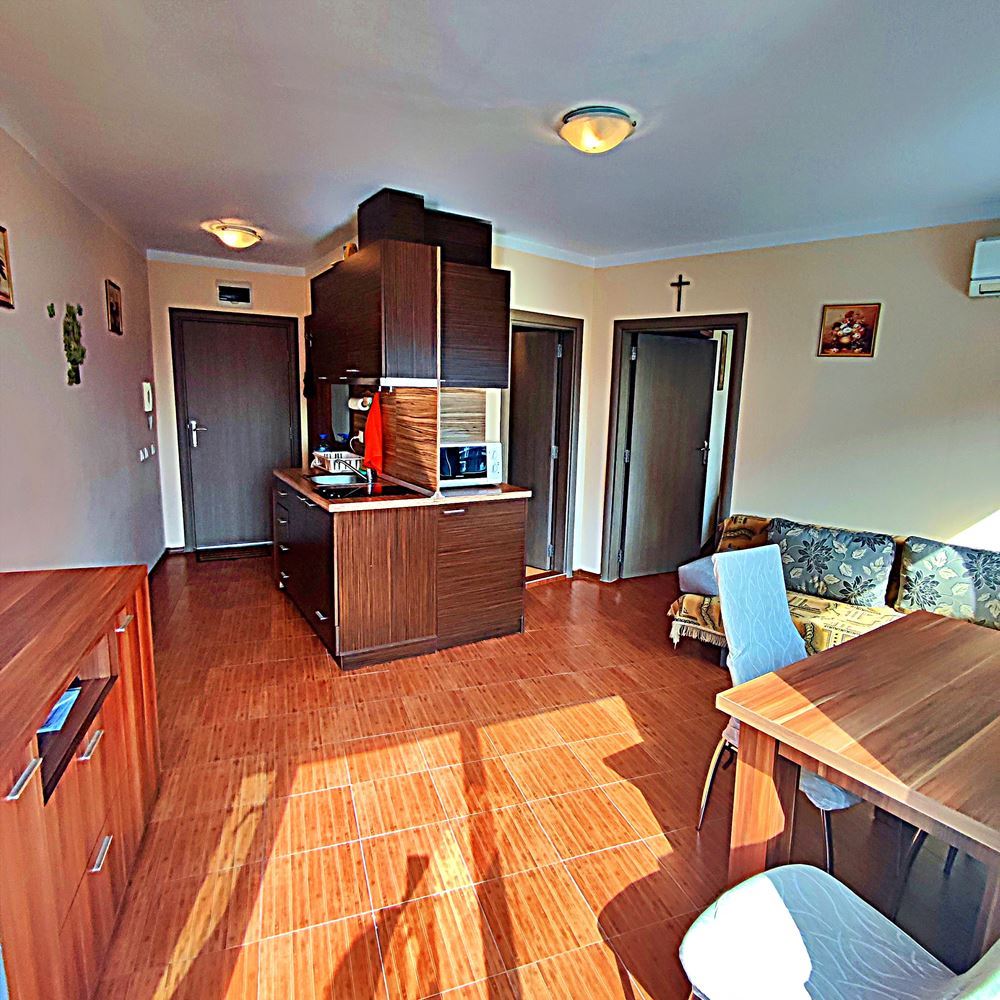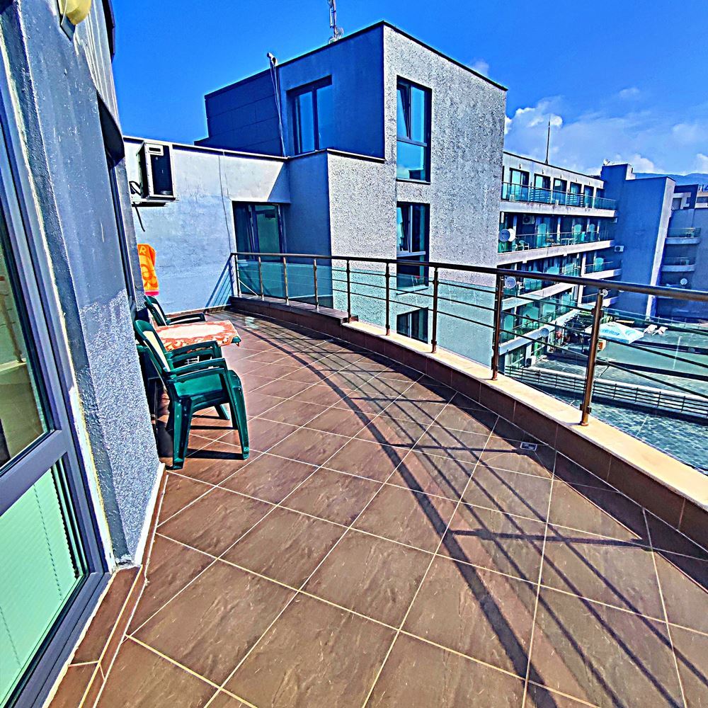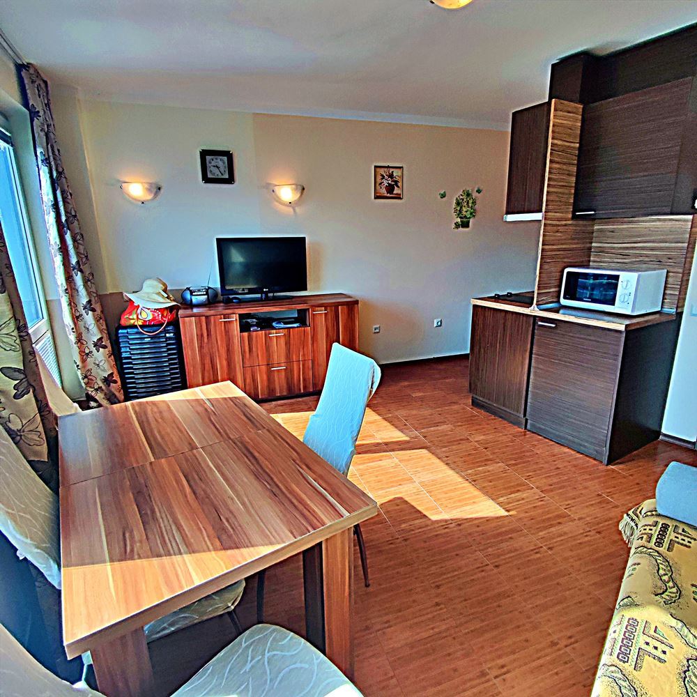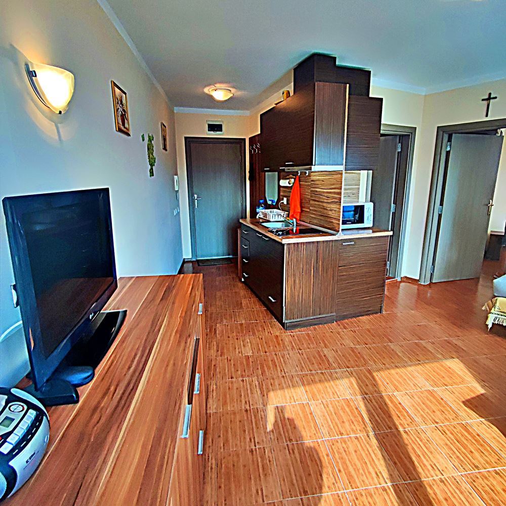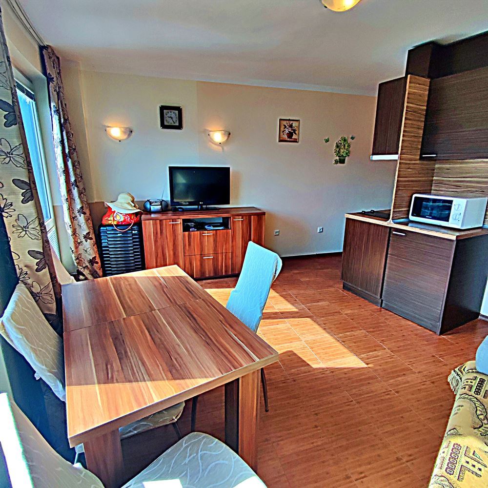 One bedroom furnished apartment in a beautiful complex with commercial premises located in the northern part of the resort of Sunny Beach, two minutes walk from the sea and the beautiful equipped beach. The complex is located on landscaped and landscaped area with a garden, swimming pool, area for sunbathing and recreation, playground. There is a lobby, reception, modern elevators, two restaurants, fitness center, WI-FI, parking. The commercial part includes stores and offices. The complex is closed and guarded 24 hours a day. The management company offers the services for renting the apartment. The apartment of 54 m2 is located on the fifth floor, with a large panoramic terrace overlooking the resort.