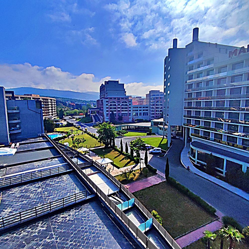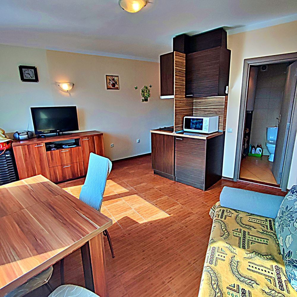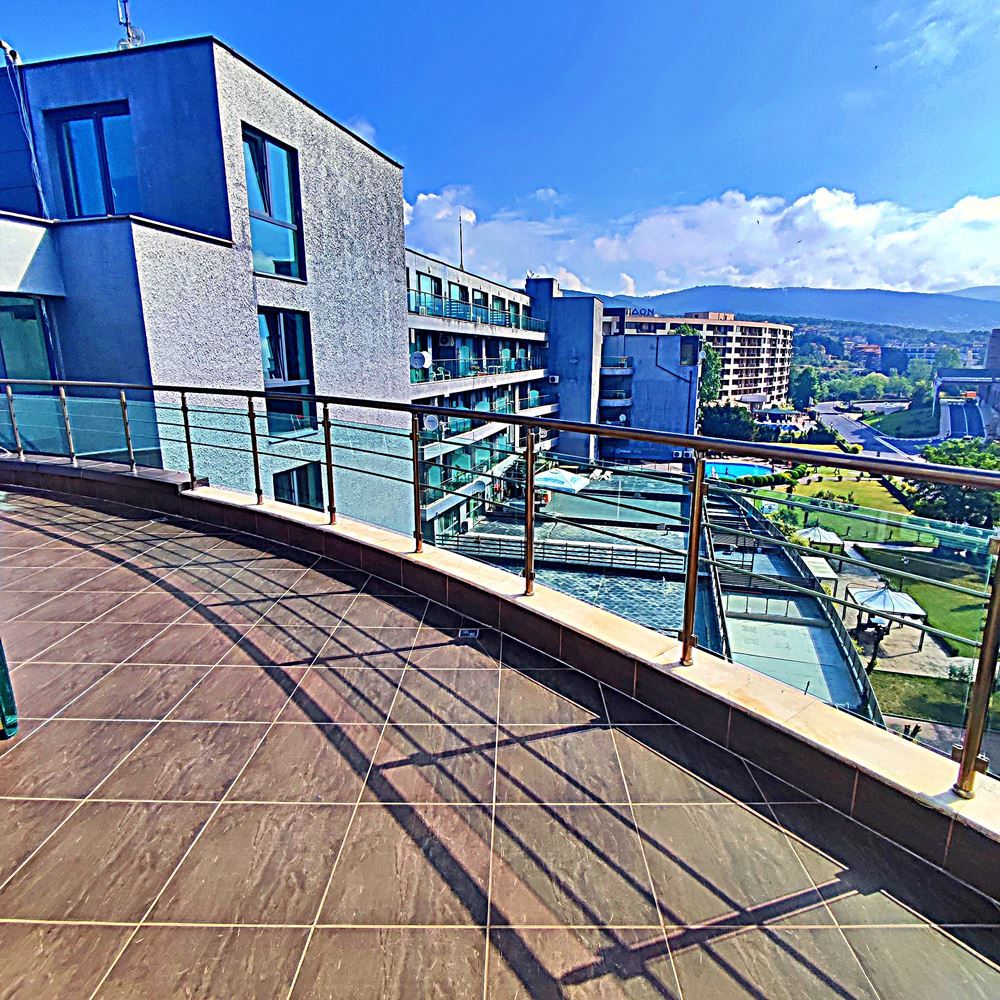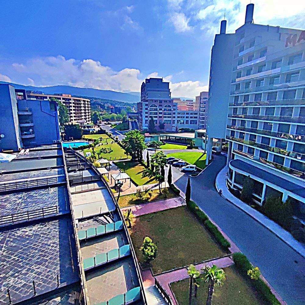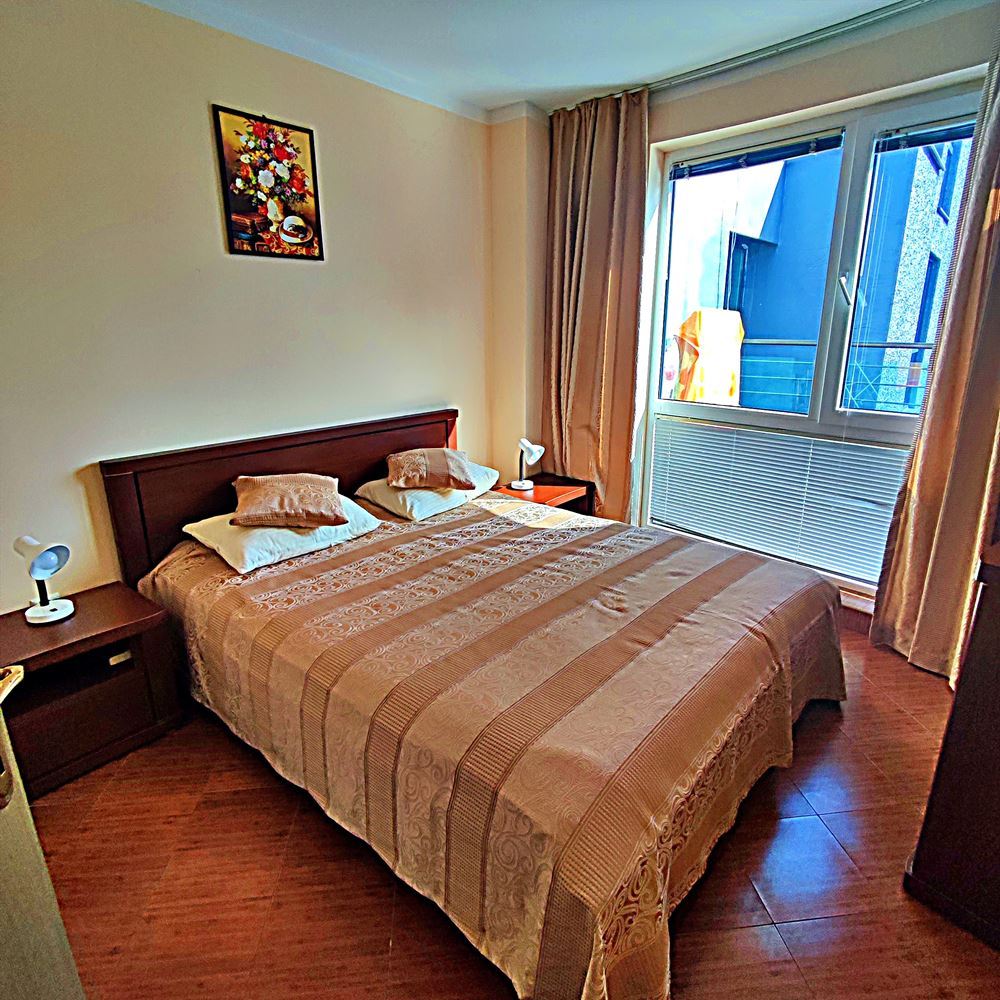 One bedroom furnished apartment in a beautiful complex with commercial premises located in the northern part of the resort of Sunny Beach, two minutes walk from the sea and the beautiful equipped beach. The complex is located on landscaped and landscaped area with a garden, swimming pool, area for sunbathing and recreation, playground. There is a lobby, reception, modern elevators, two restaurants, fitness center, WI-FI, parking. The commercial part includes stores and offices. The complex is closed and guarded 24 hours a day. The management company offers the services for renting the apartment. The apartment of 54 m2 is located on the fifth floor, with a large panoramic terrace overlooking the resort.