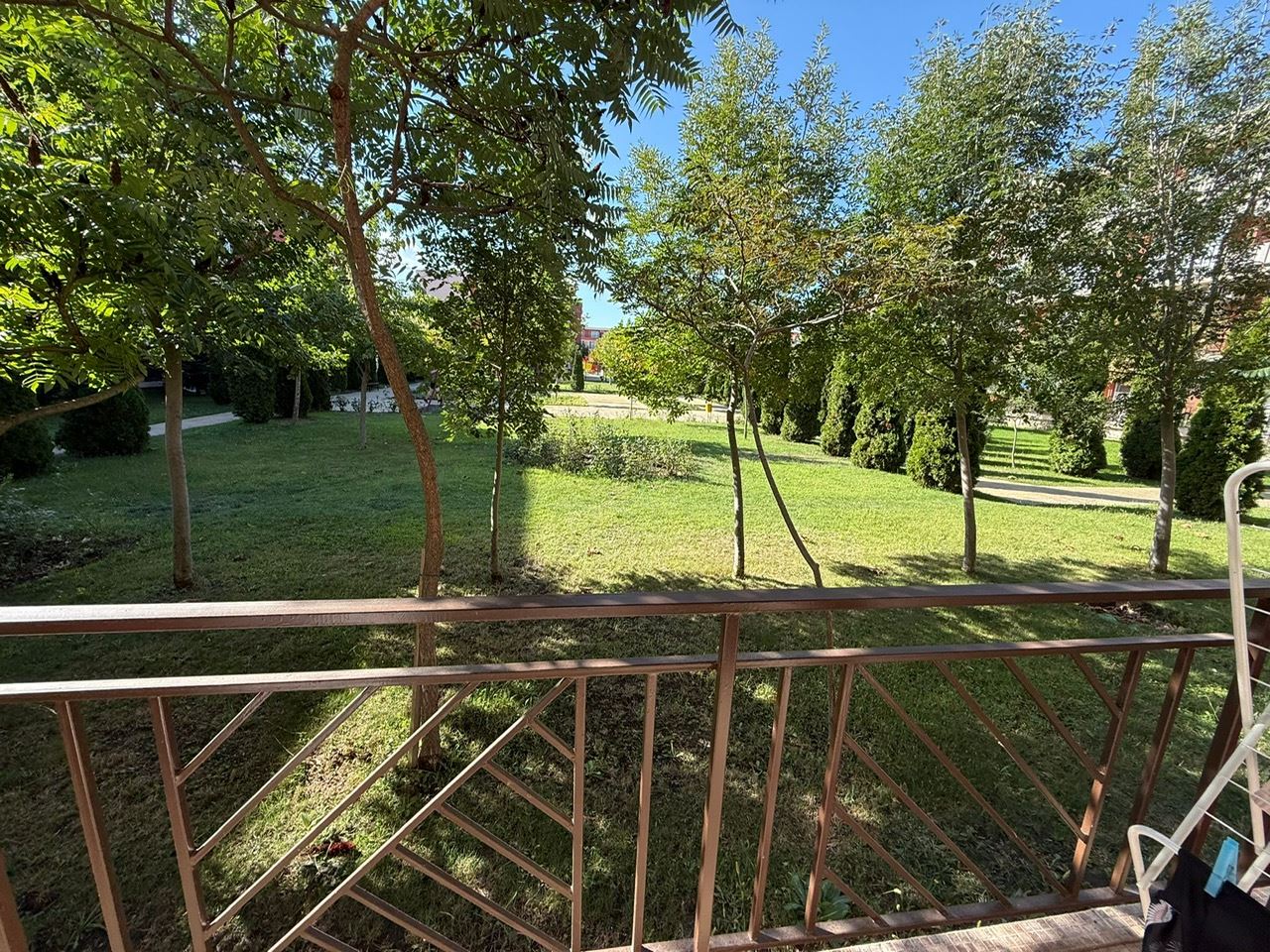 The studio is fully furnished and ready to move in. The interior features a living area with zones for relaxation and sleeping, a compact kitchenette, and a dining corner. The bathroom is well maintained, and the balcony provides a pleasant spot for morning coffee with a view of the greenery. Its ground-floor position ensures easy access to the communal areas – perfect for families with children or anyone preferring step-free living.