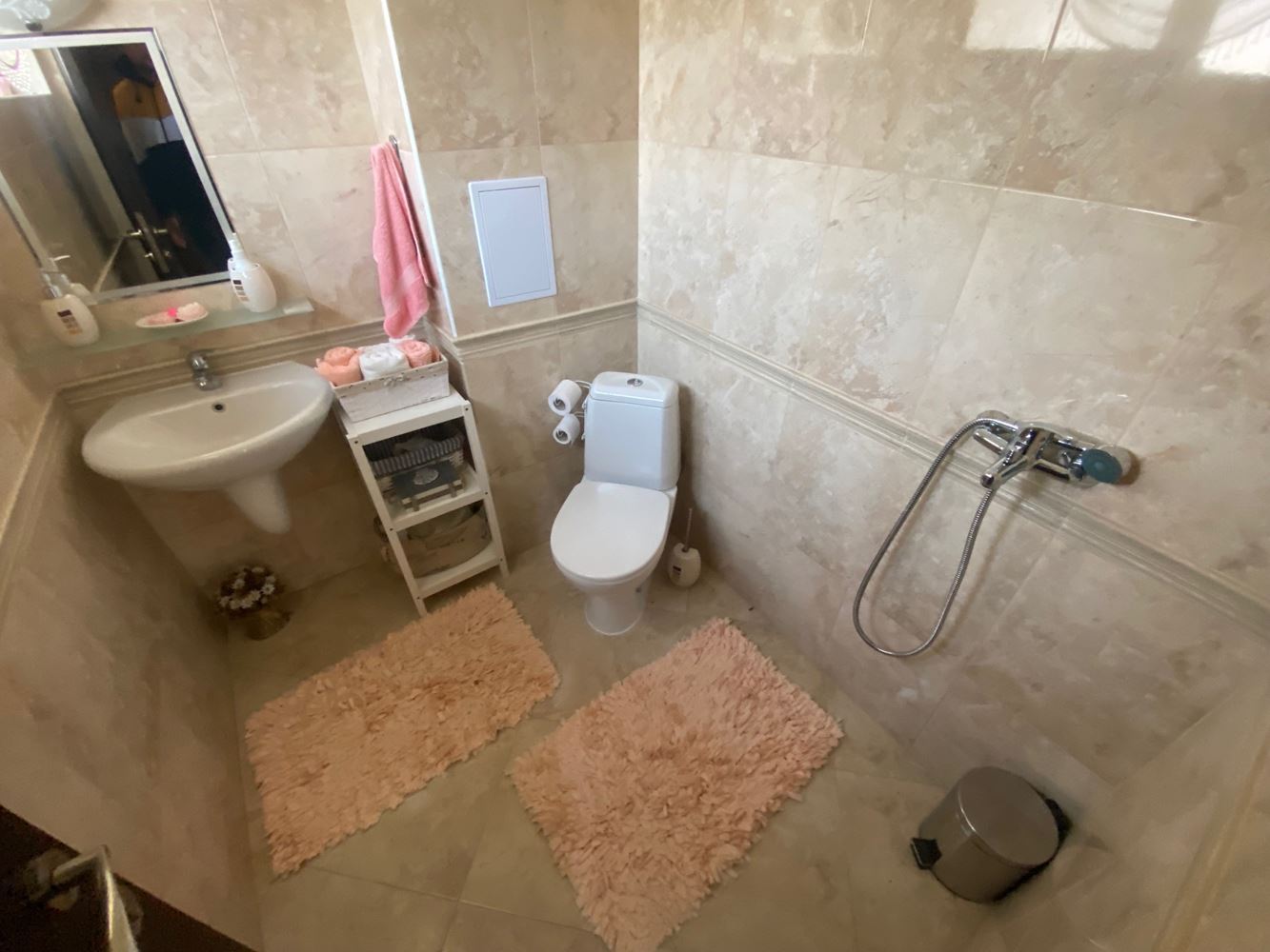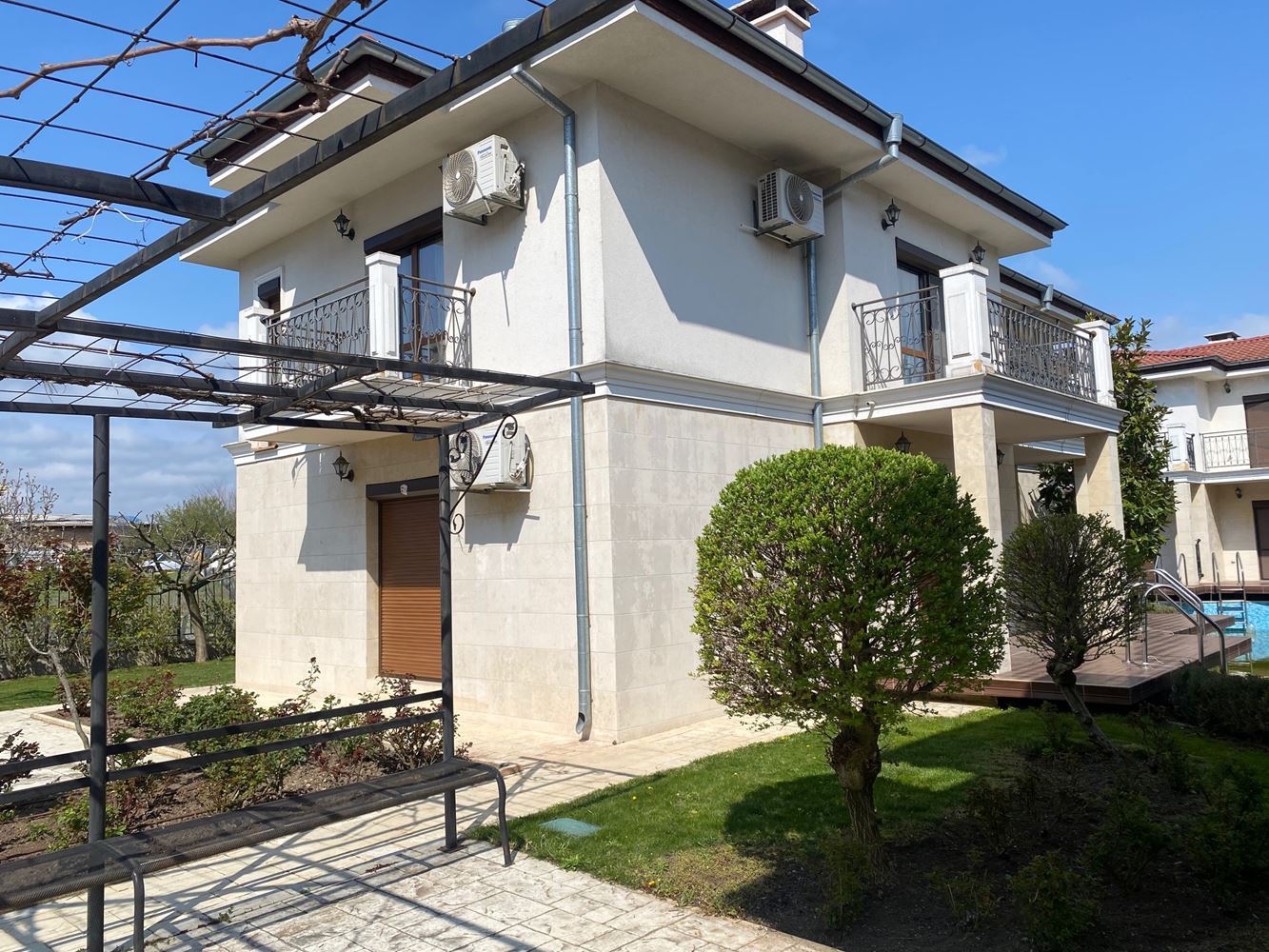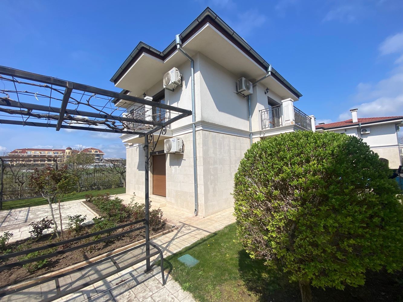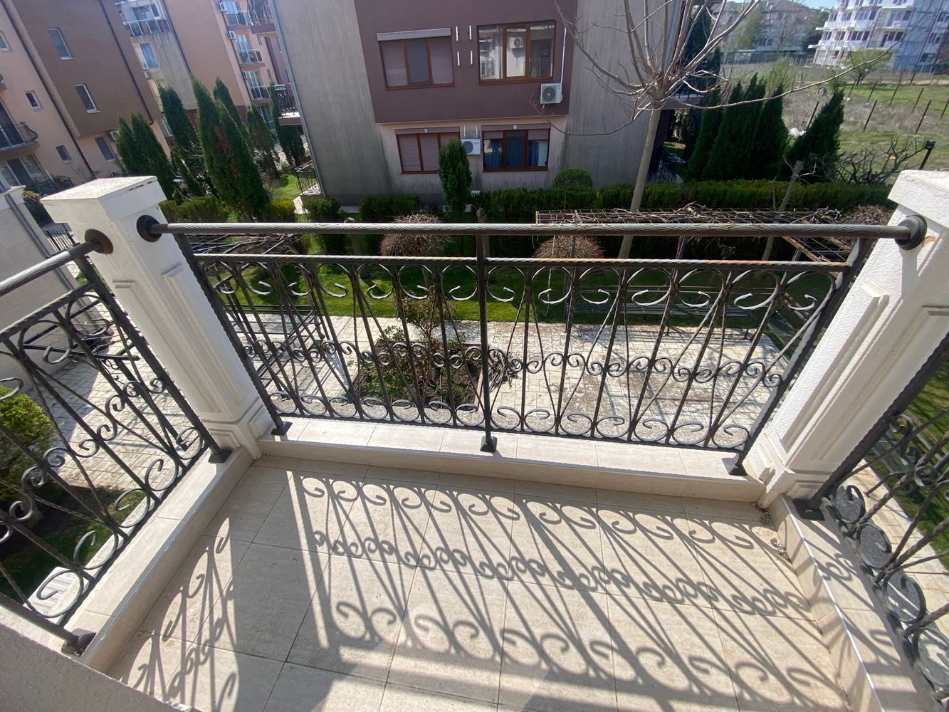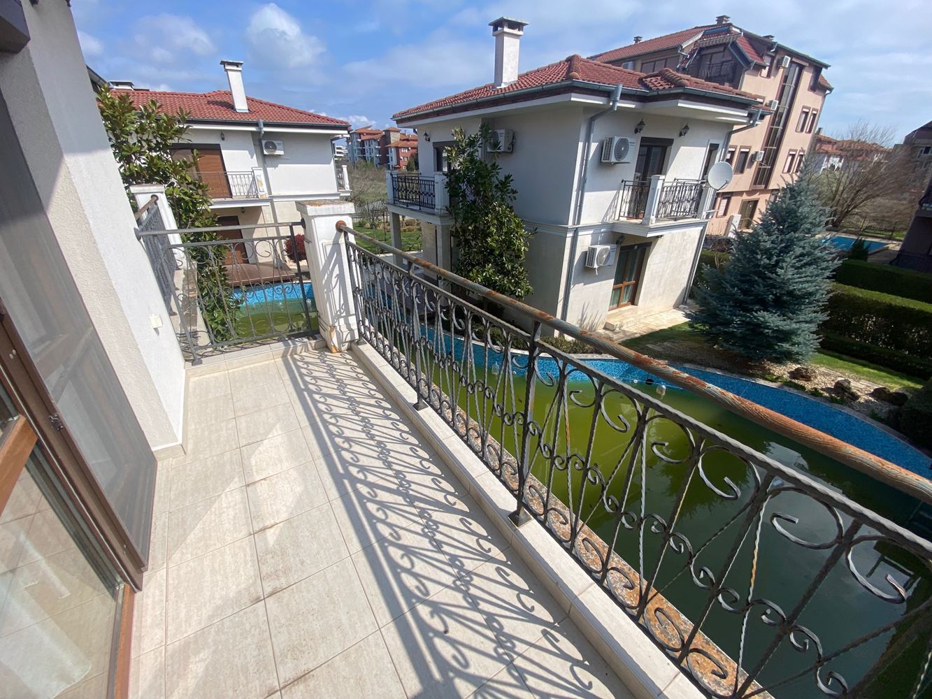 Fully furnished house with swimming pool in a small boutique complex in the seaside town of Ravda. The complex is located in the centre of the resort, 300 m away from the sea. The house area is 120 m2 and has two floors. On the ground floor there is a spacious living room with a fireplace, a kitchen converted to a dining room, where there are two exits - to the pool and the lawn, as well as a toilet and a warehouse On the first floor there are two large bedrooms with access to terraces, a bathroom, a large hallway. The complex has a playground, jacuzzi and barbecue and parking for cars. The house is for sale with furniture, equipment and an adjacent plot. A fireplace is installed in the house.