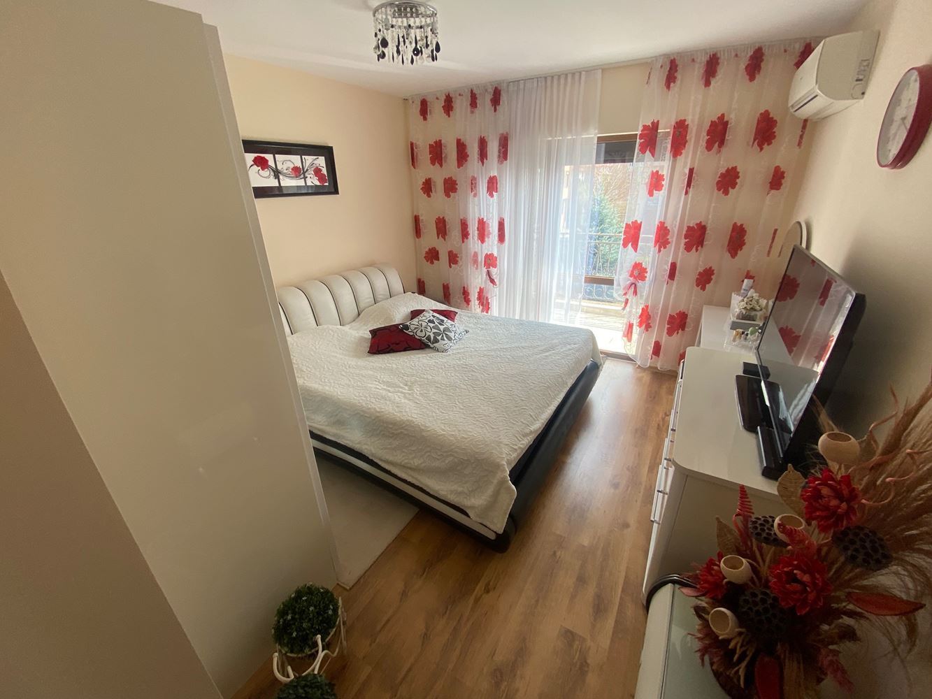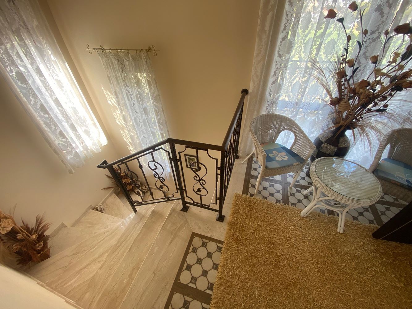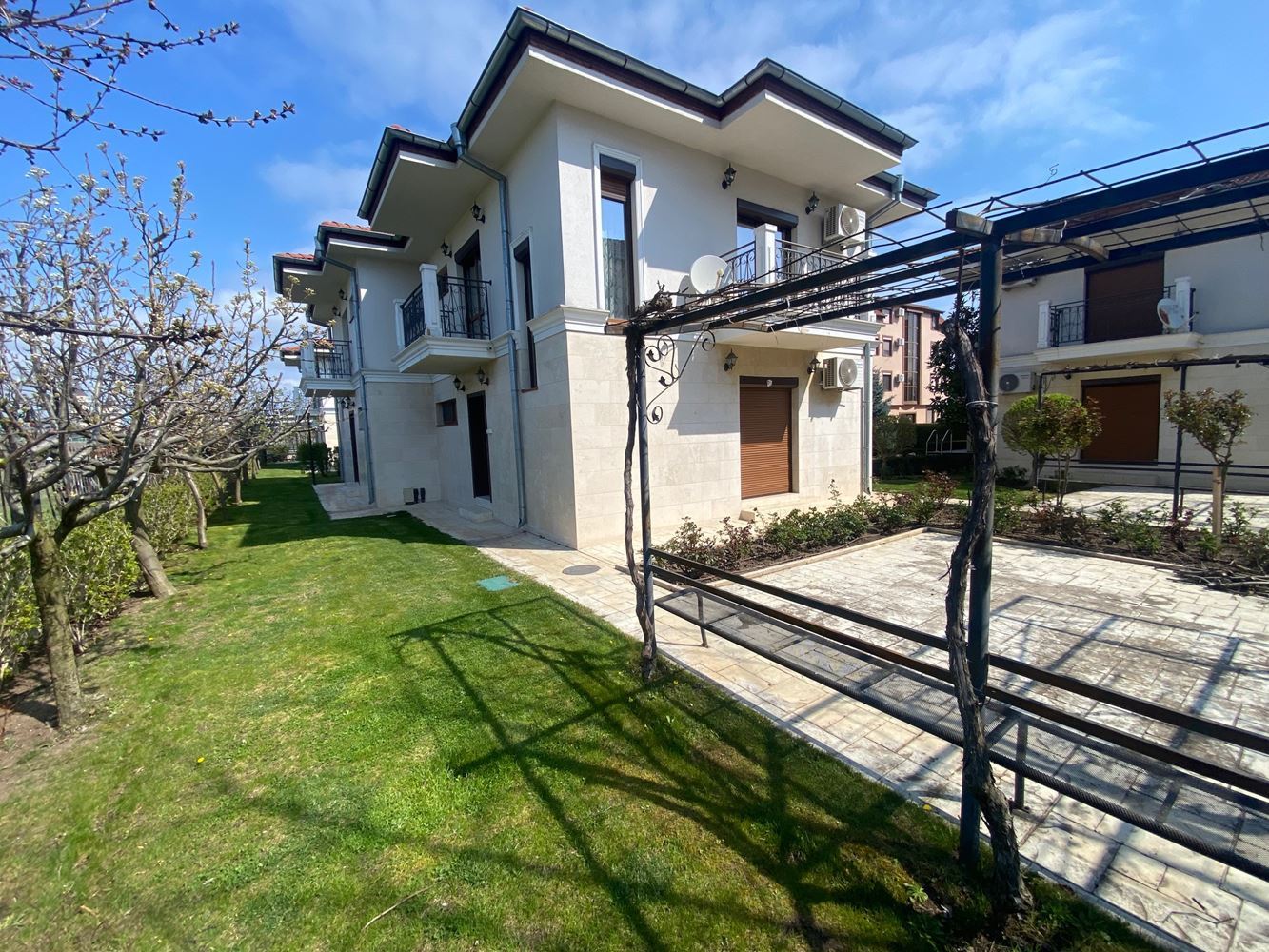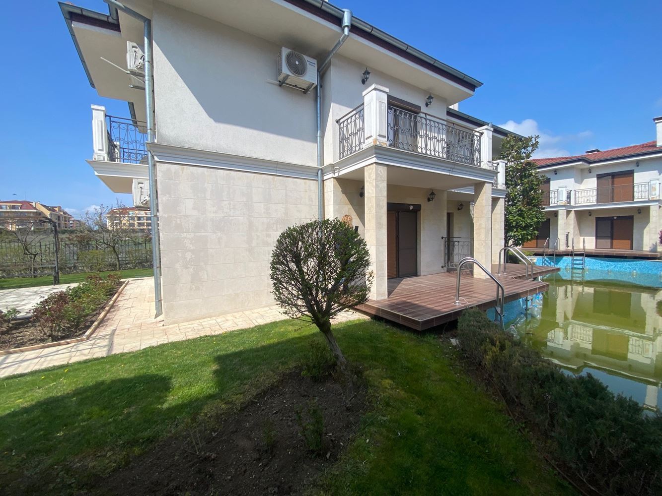 Fully furnished house with swimming pool in a small boutique complex in the seaside town of Ravda. The complex is located in the centre of the resort, 300 m away from the sea. The house area is 120 m2 and has two floors. On the ground floor there is a spacious living room with a fireplace, a kitchen converted to a dining room, where there are two exits - to the pool and the lawn, as well as a toilet and a warehouse On the first floor there are two large bedrooms with access to terraces, a bathroom, a large hallway. The complex has a playground, jacuzzi and barbecue and parking for cars. The house is for sale with furniture, equipment and an adjacent plot. A fireplace is installed in the house.