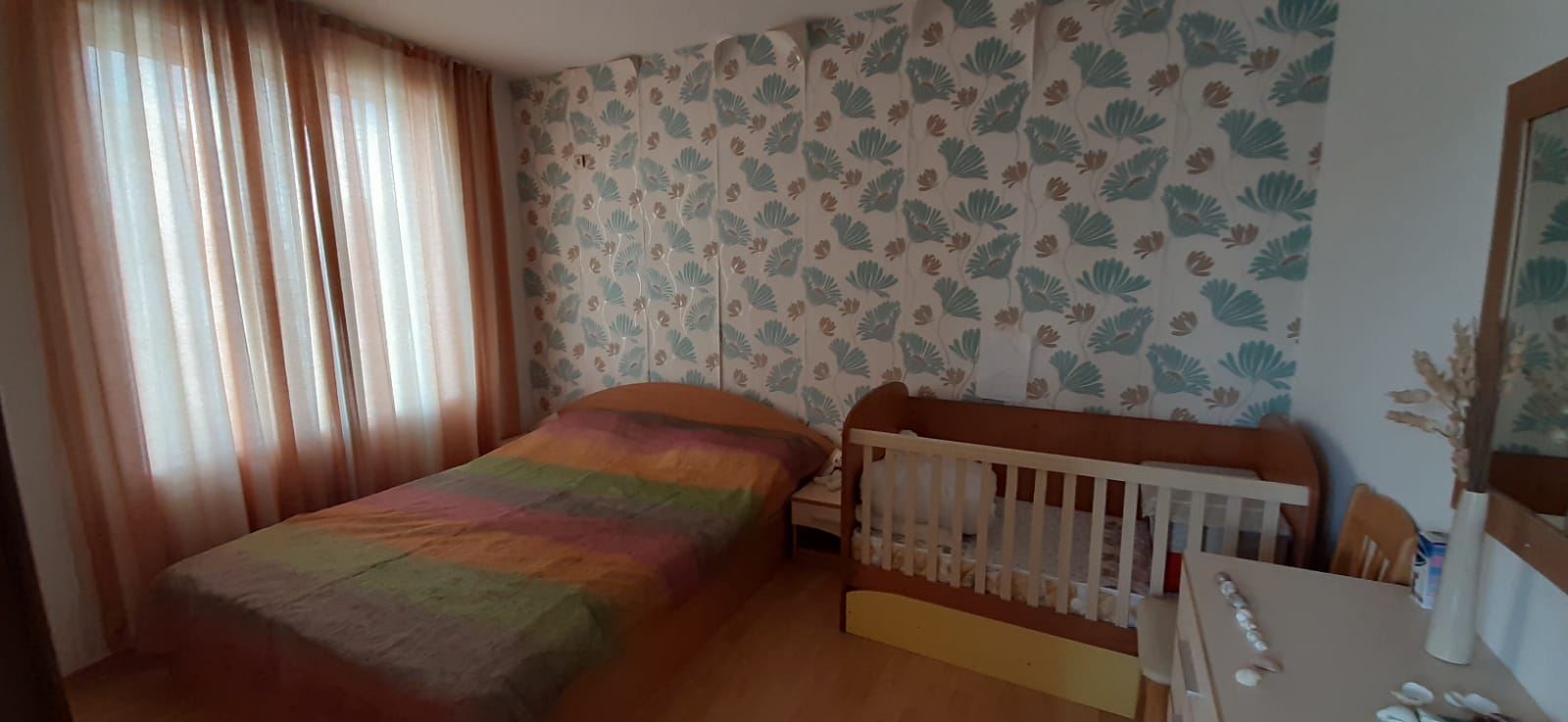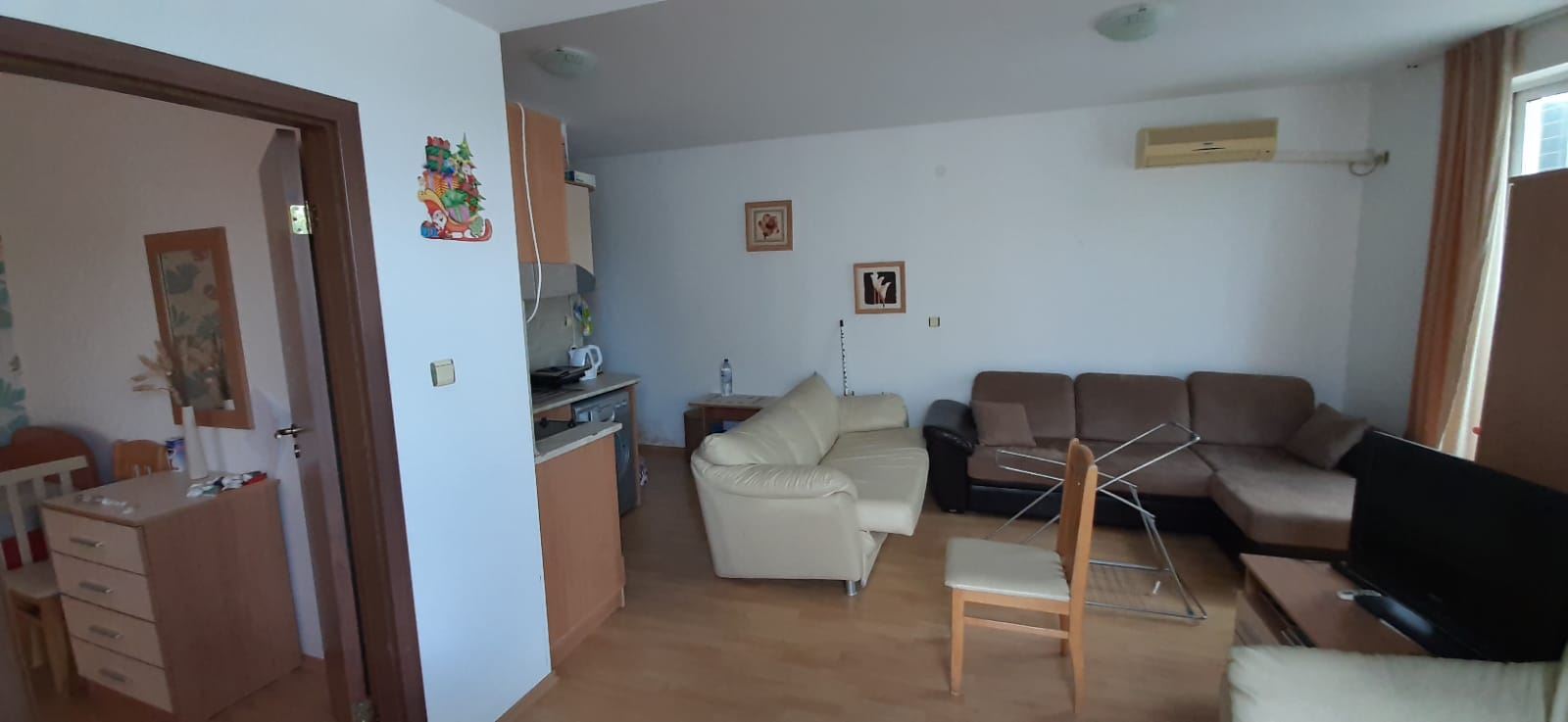 Fully furnished one-bedroom flat located on the first floor in a complex just 200 metres from Aqua Park. The total area of the flat is 57.79 m2. The flat consists of a living room with open kitchen, a separate bedroom, a bathroom with shower and two balconies. The flat is very cosy. The property is furnished and equipped. Perfect for all year round living. The complex is landscaped and has a swimming pool, children's pool, park, shops, parking and controlled access. Close to the complex there are various shops, cafes and restaurants. There is a bus stop within walking distance from the house which connects the resort with Sveti Vlas, Nessebar and Bourgas.