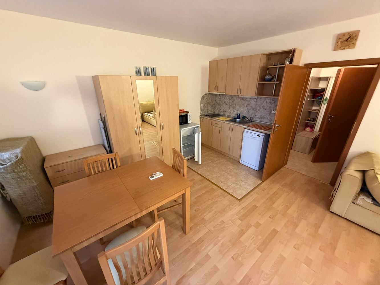 The apartment consists of a functional living room with a kitchenette, a separate bedroom, a bathroom with a toilet, and two balconies. The layout is comfortable and well thought out – the living area allows for a dining and relaxation zone, while the bedroom provides enough storage and comfort. The two balconies add a sense of space and freshness – perfect for morning coffee or evening relaxation with a pool view. The property is sold fully furnished and equipped, ready for immediate move-in.